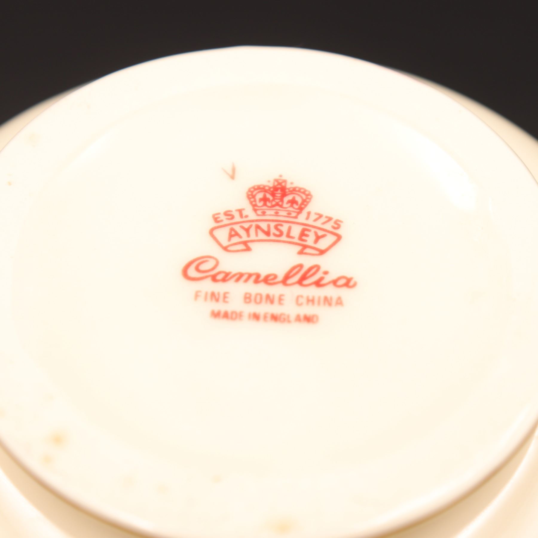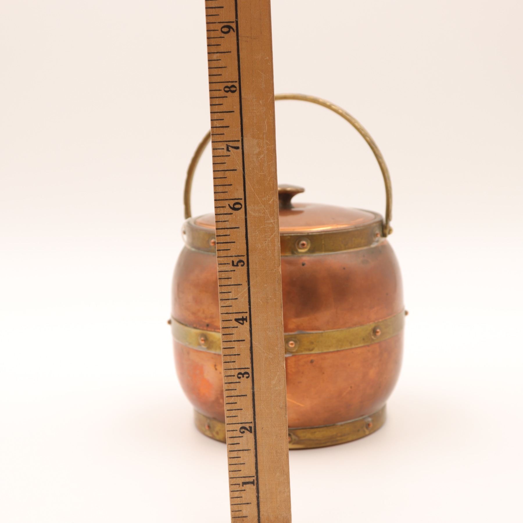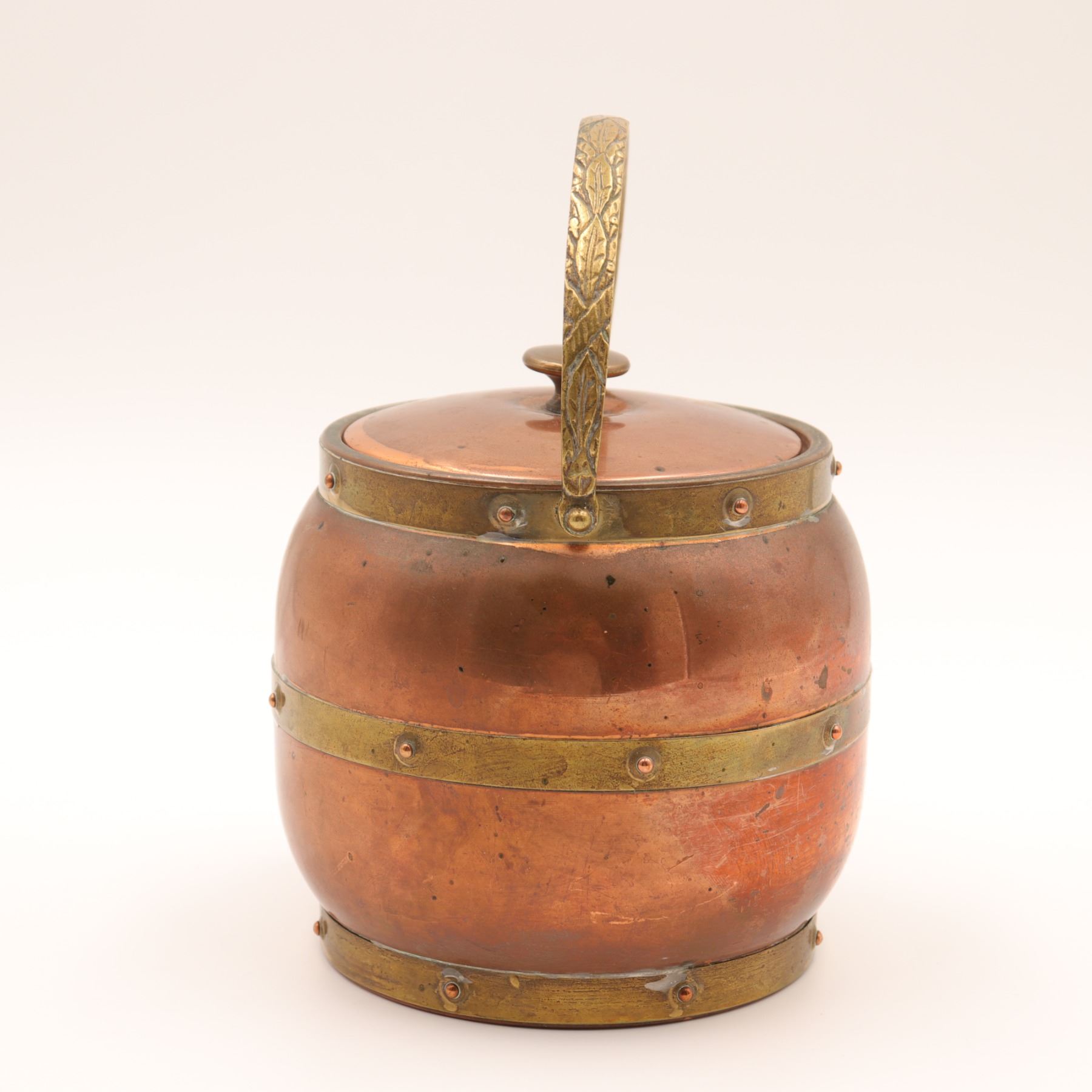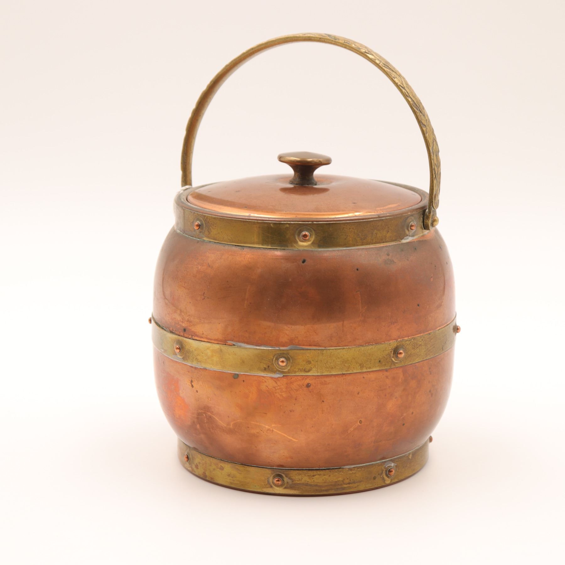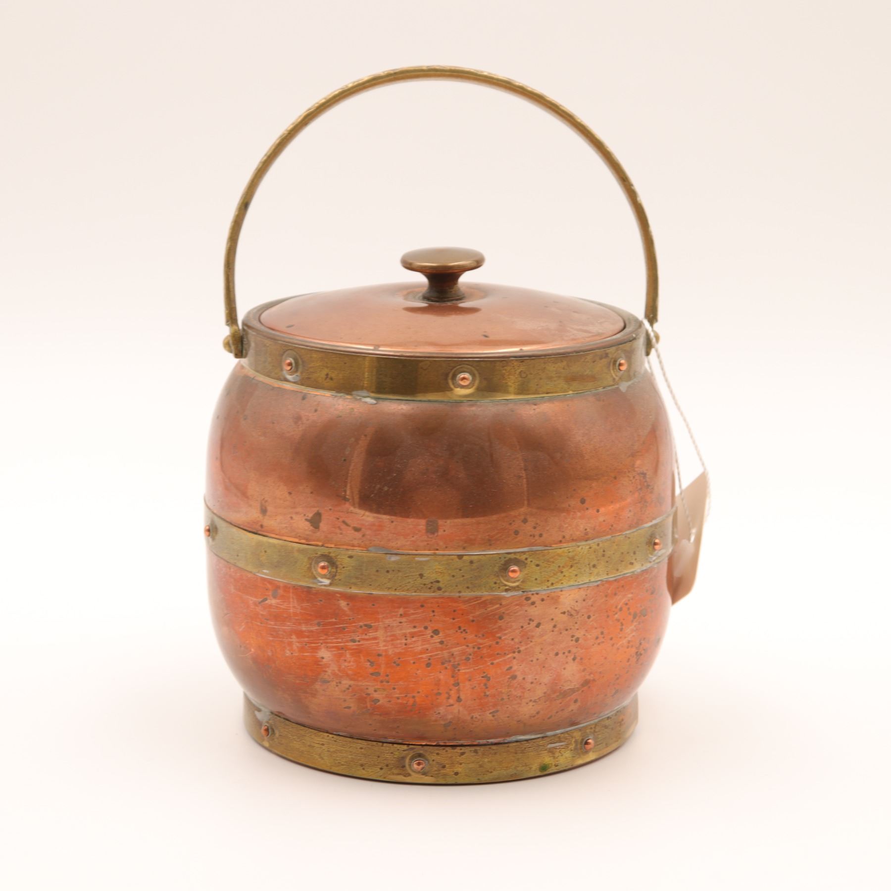 Assembled group of three mid-century decorative objects, comprising a small sculptural art pottery vase of compressed ovoid form with stylised owl or bird motif, the textured black-glazed body accented with ochre-yellow roundels and inscribed “50E/61” to the underside; a mid-century English copper and brass barrel-form ice bucket by Linton, fitted with domed lid, swing handle, and original clear glass liner, the base stamped “TRADEMARK / LINTON / MADE IN ENGLAND”; and an Aynsley “Camellia” fine bone china bud vase of elegant elongated form, moulded with leaf and bud relief and finished in ivory glaze with gilt rim and foot. A varied and attractive decorative group with strong mid-century appeal, suitable for bar, shelf, or cabinet display.