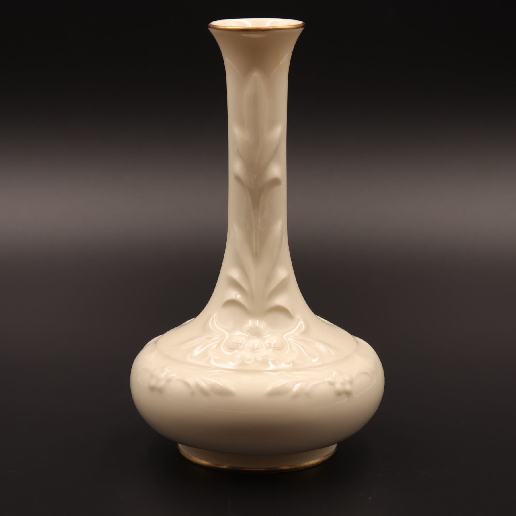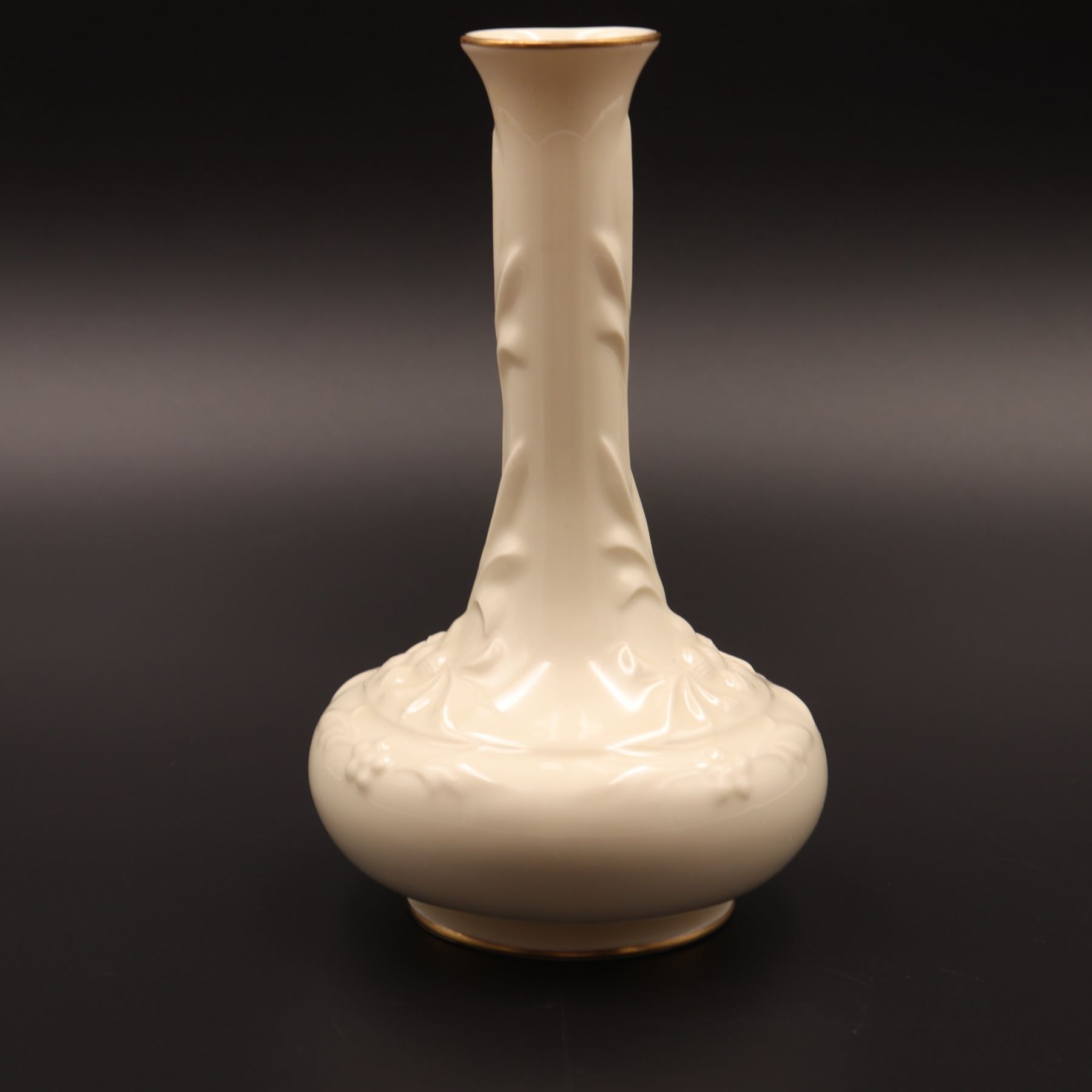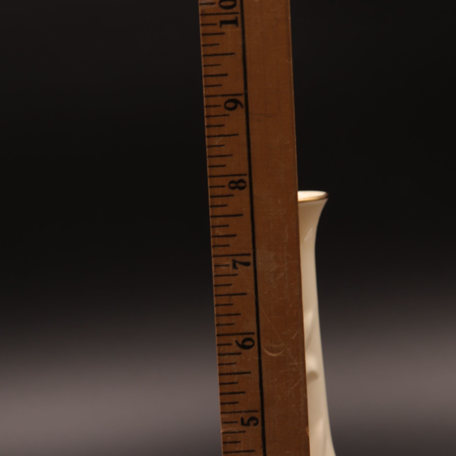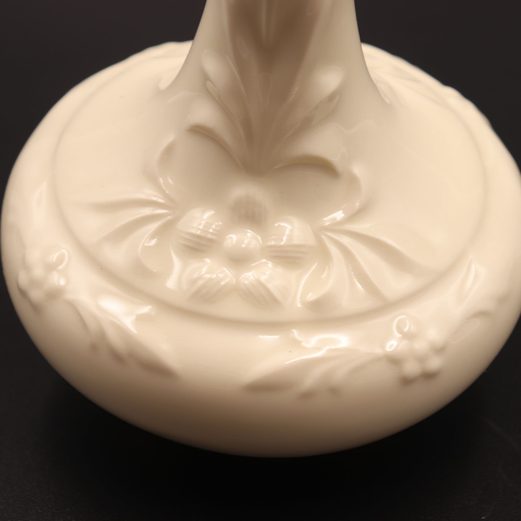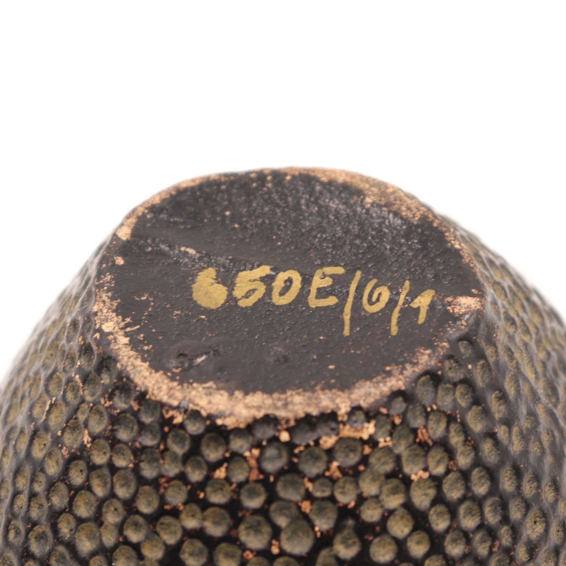 Assembled group of three mid-century decorative objects, comprising a small sculptural art pottery vase of compressed ovoid form with stylised owl or bird motif, the textured black-glazed body accented with ochre-yellow roundels and inscribed “50E/61” to the underside; a mid-century English copper and brass barrel-form ice bucket by Linton, fitted with domed lid, swing handle, and original clear glass liner, the base stamped “TRADEMARK / LINTON / MADE IN ENGLAND”; and an Aynsley “Camellia” fine bone china bud vase of elegant elongated form, moulded with leaf and bud relief and finished in ivory glaze with gilt rim and foot. A varied and attractive decorative group with strong mid-century appeal, suitable for bar, shelf, or cabinet display.