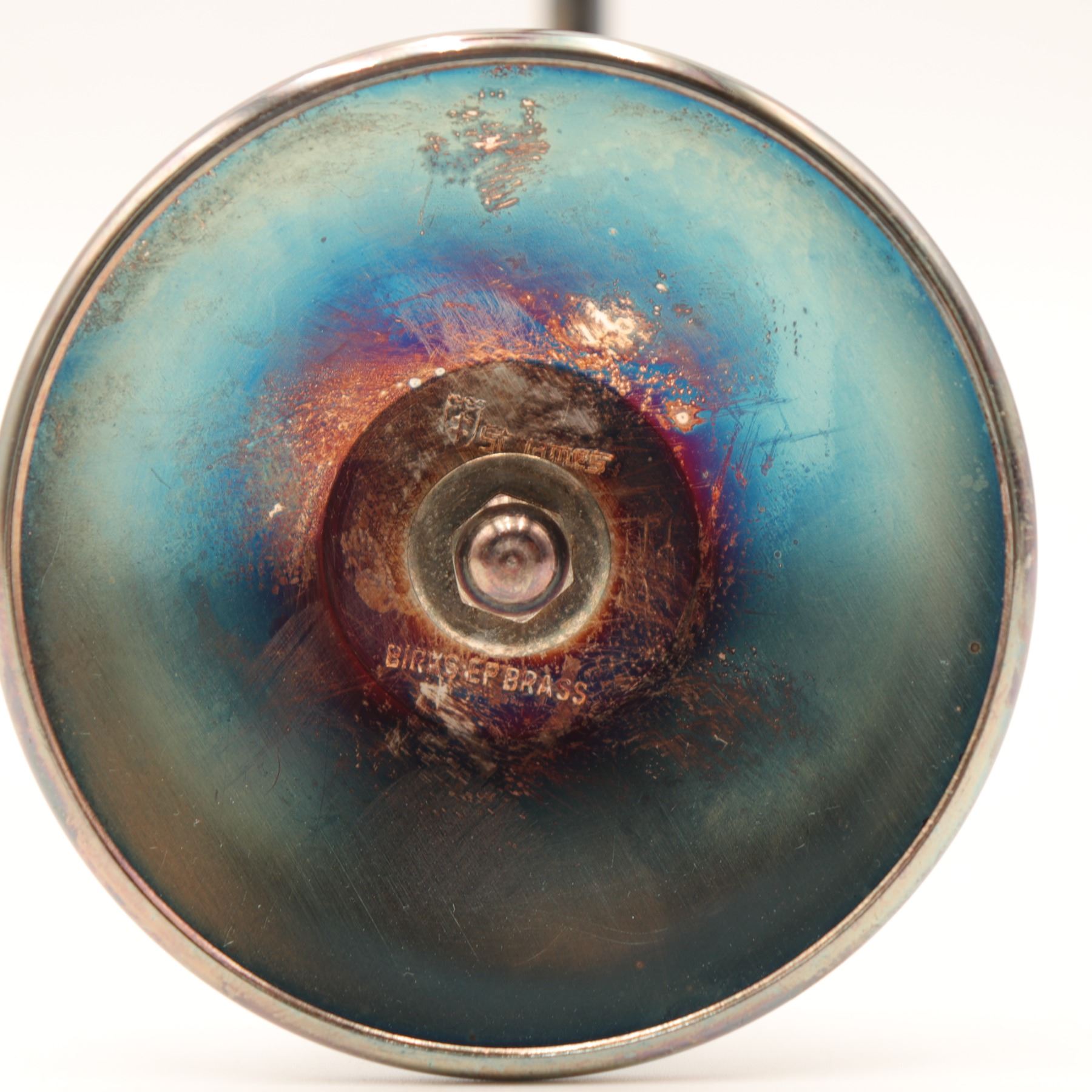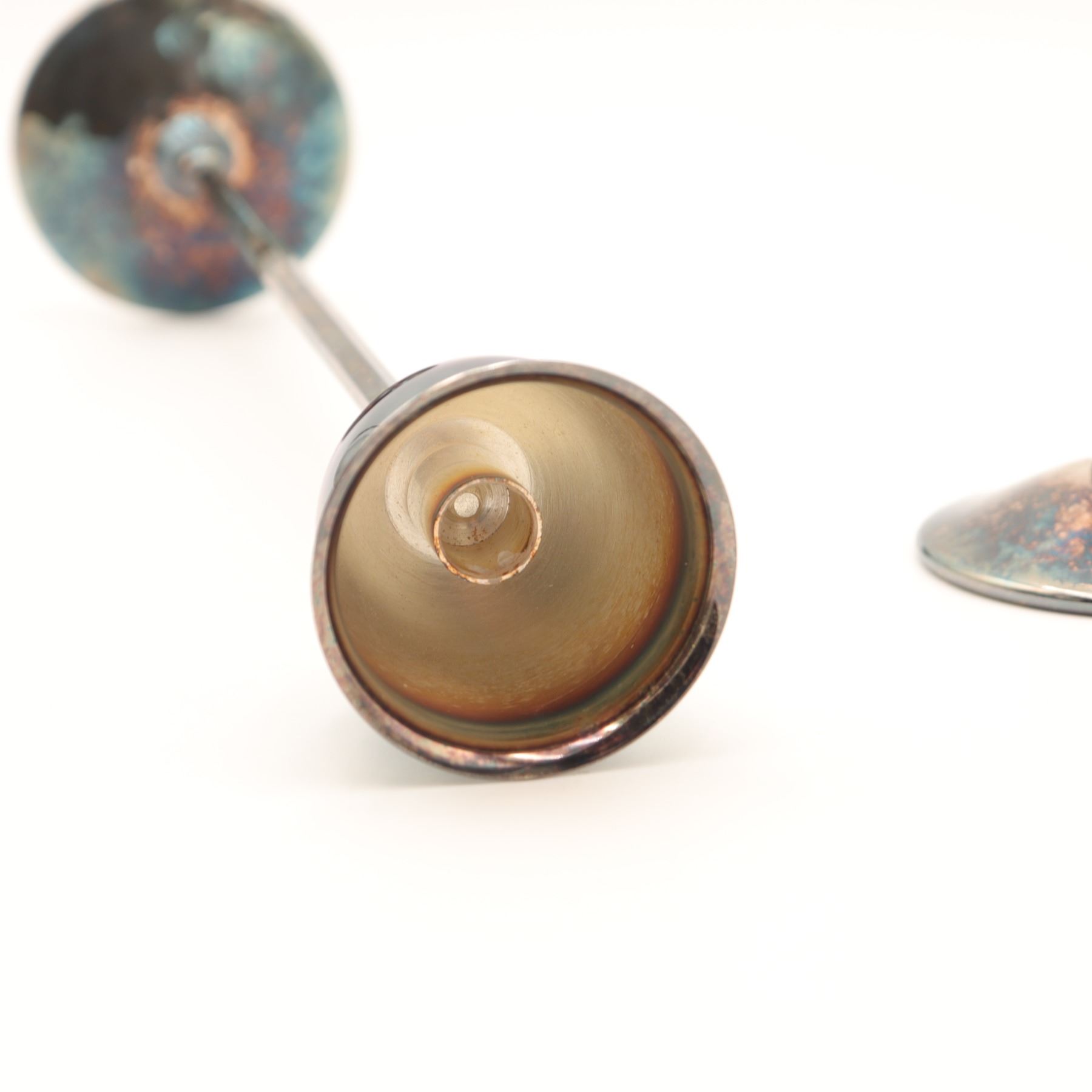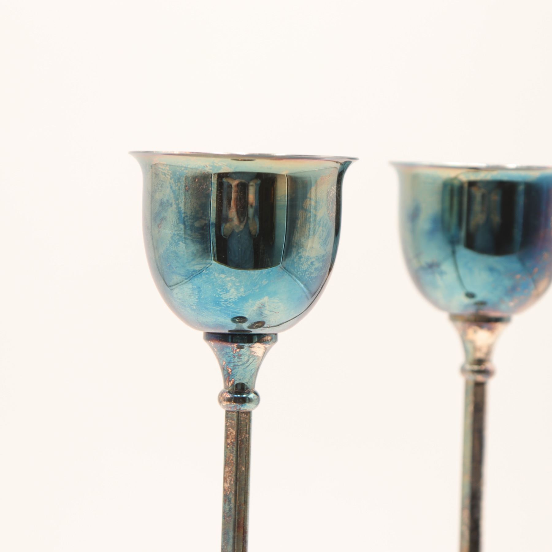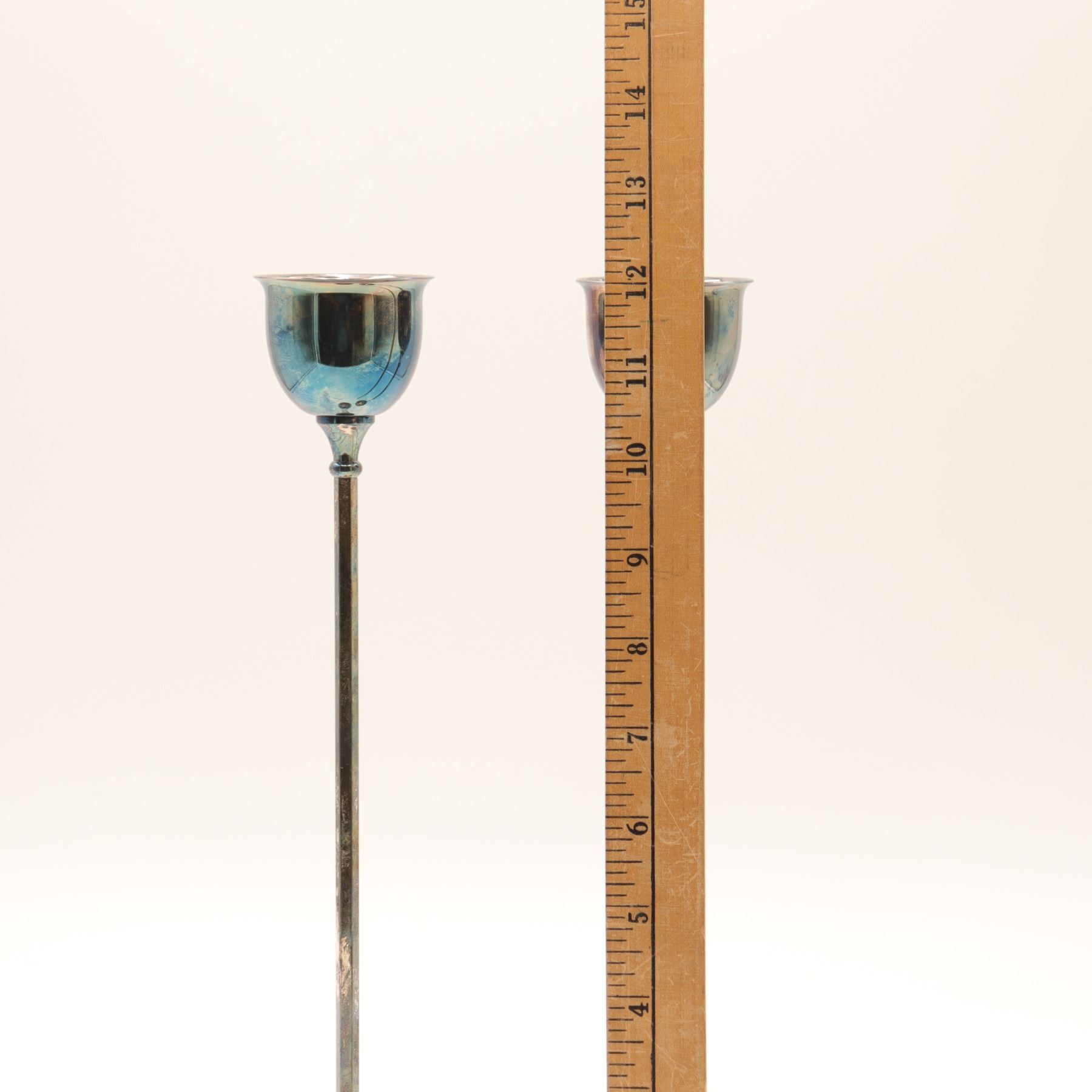 Pair of tall silver-plated candlesticks by Henry Birks & Sons, Canada, 20th century, each approx. 12 in. high, marked Birks Regency Plate St. James to the base and presented in the original Birks blue presentation box. Elegant tapering stems with circular bases. Light surface wear and polishing marks from use; box with age-related scuffs and edge wear.