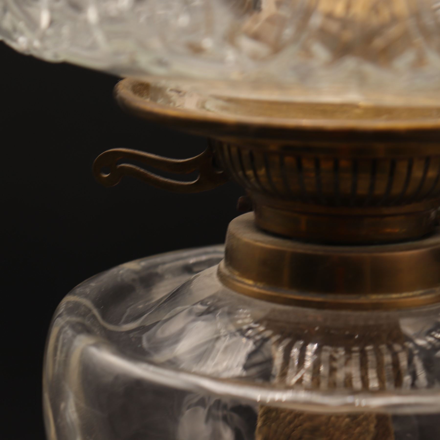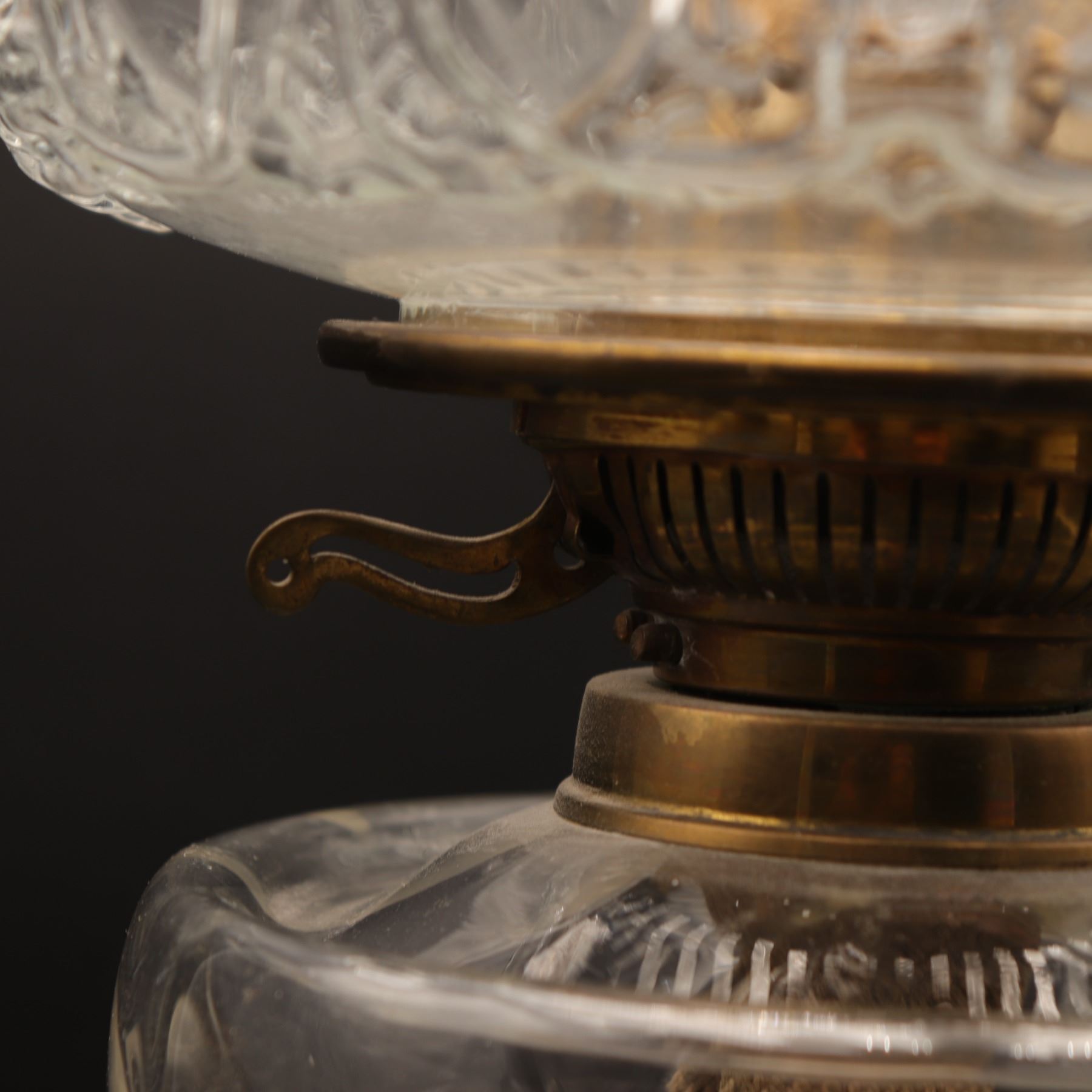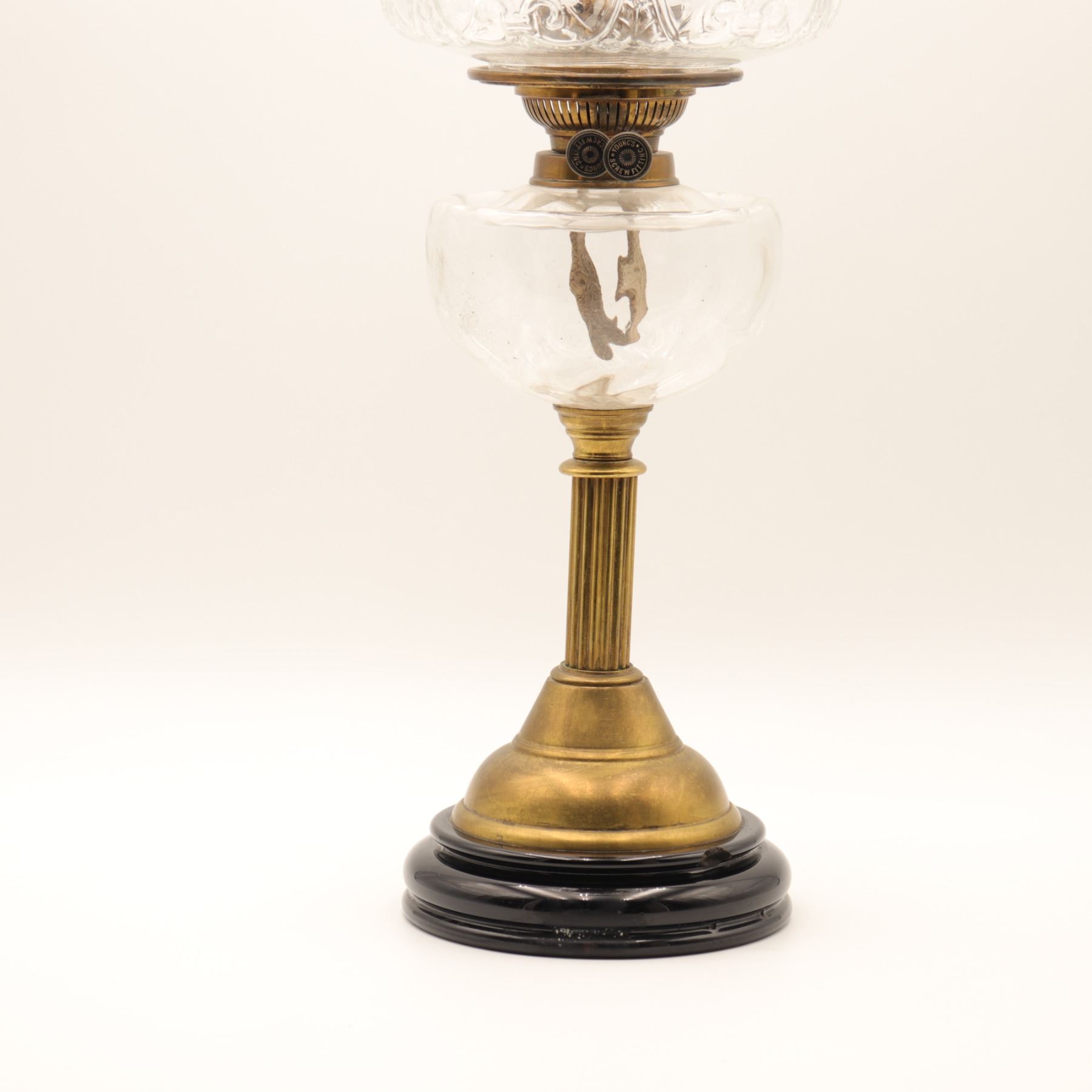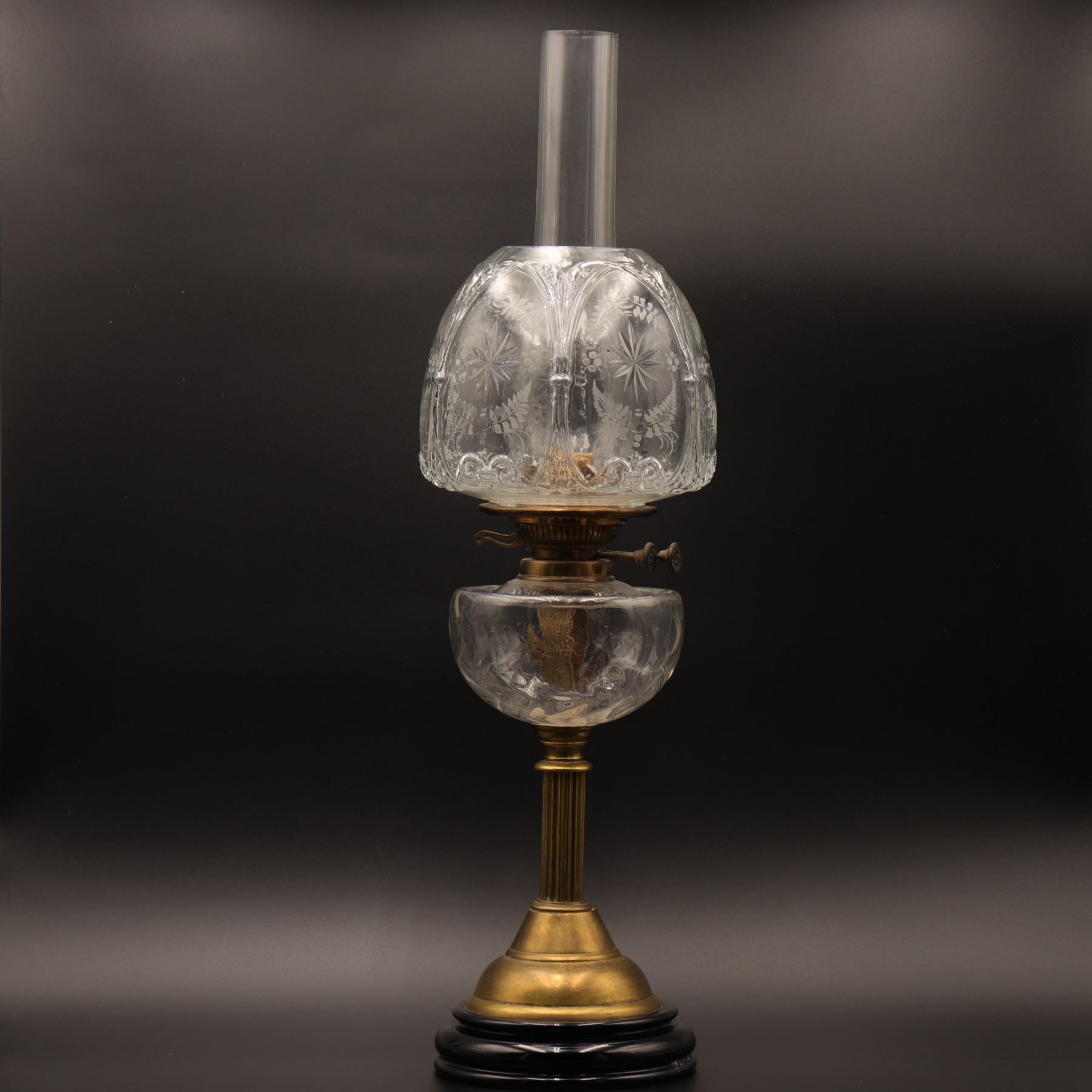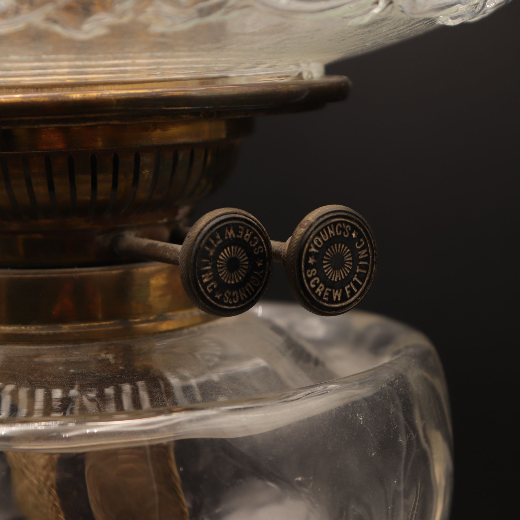 Victorian brass and glass paraffin / oil lamp with Young’s screw-fitting burner, late 19th century. The lamp with clear moulded and wheel-engraved glass shade decorated with radiating starburst and foliate motifs above a clear glass font similarly decorated with stylised foliage, fitted with brass collar and twin disc winder stamped YOUNG’S SCREW FITTING to each side. Reeded column stem rising from a domed and stepped brass socle, all mounted on a circular black glass plinth, complete with clear glass chimney. An attractive period example retaining its original burner and fittings.