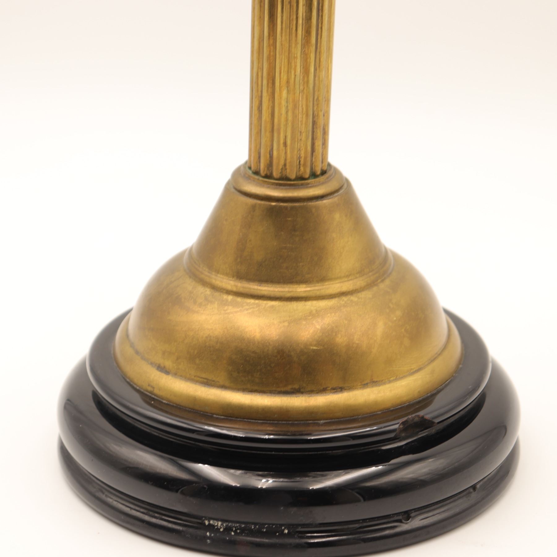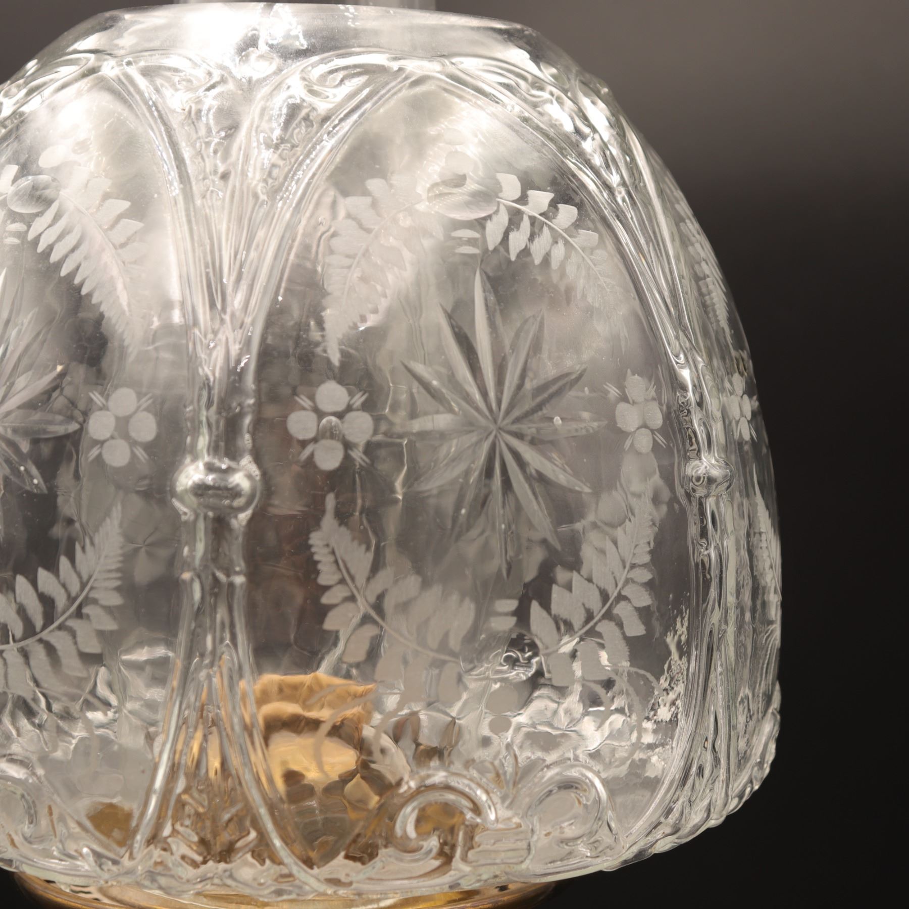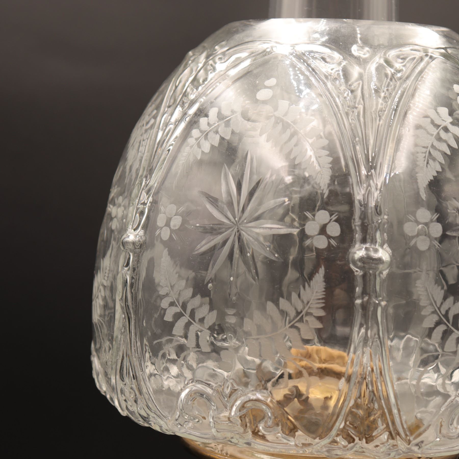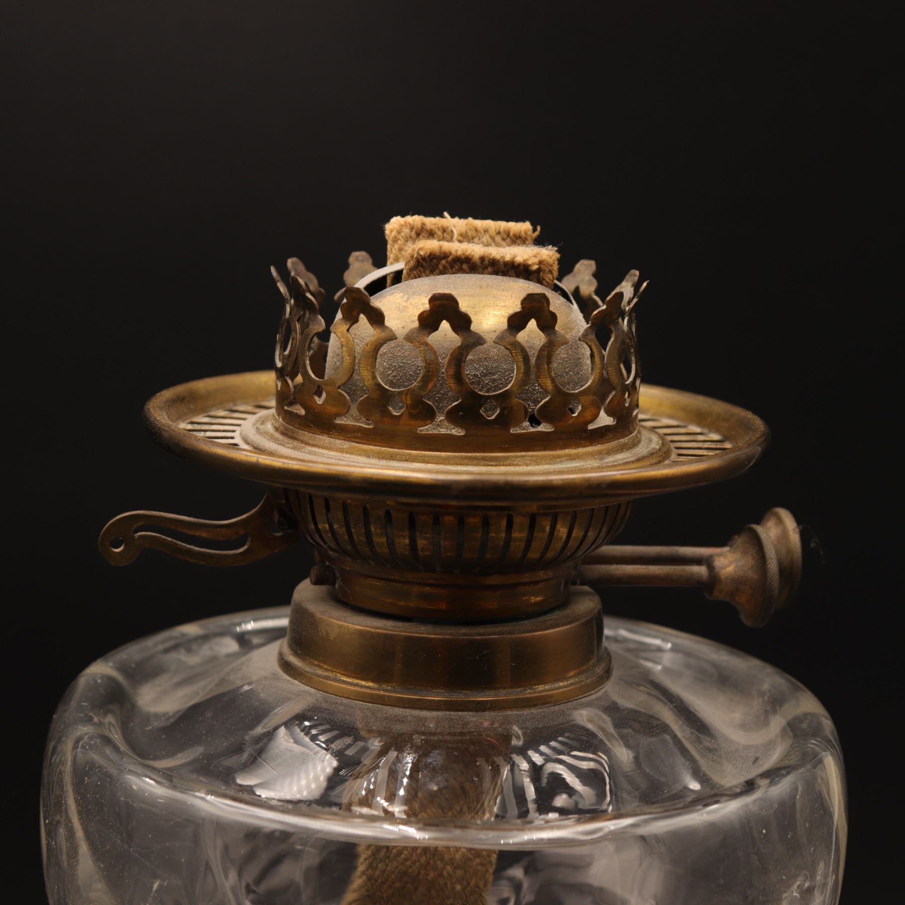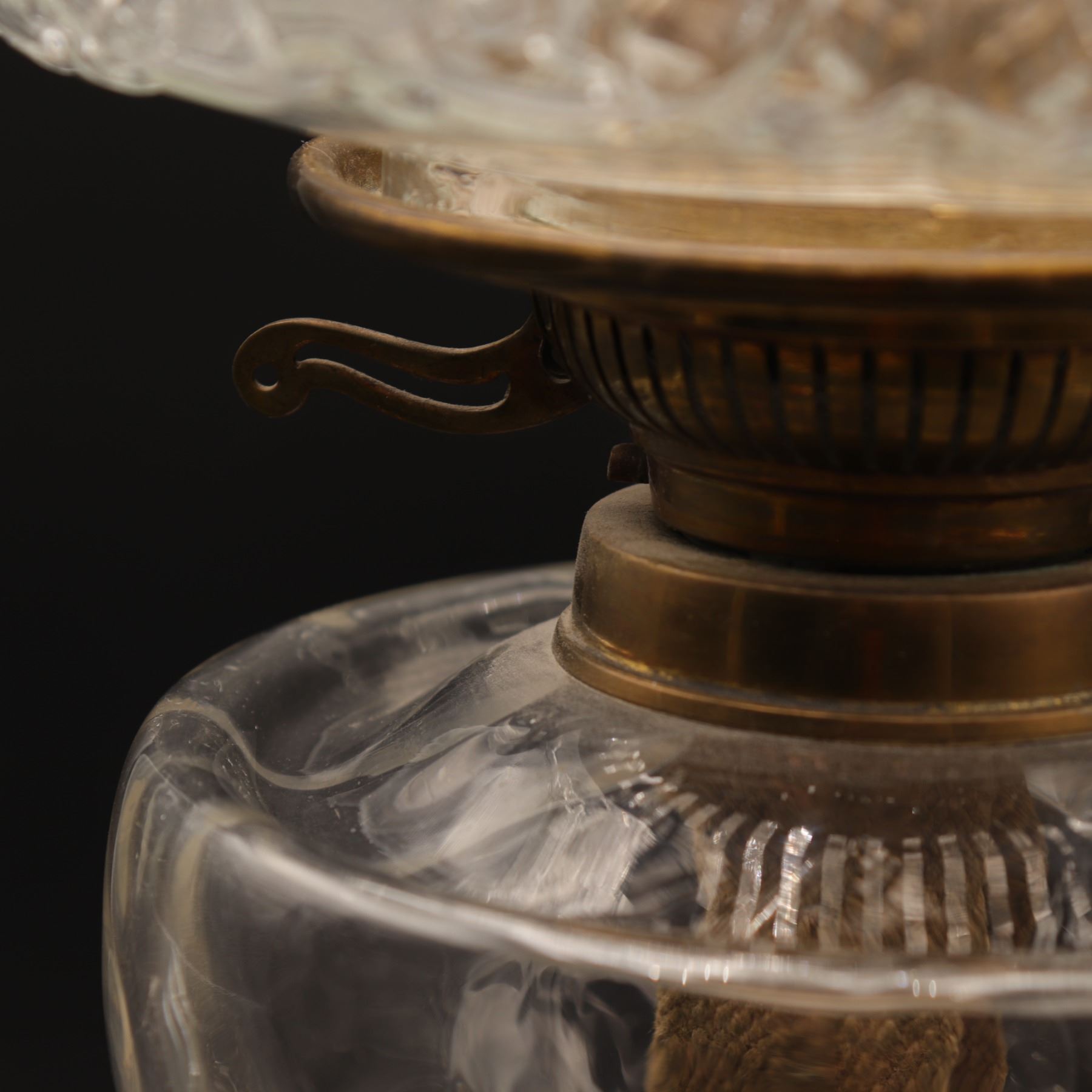 Victorian brass and glass paraffin / oil lamp with Young’s screw-fitting burner, late 19th century. The lamp with clear moulded and wheel-engraved glass shade decorated with radiating starburst and foliate motifs above a clear glass font similarly decorated with stylised foliage, fitted with brass collar and twin disc winder stamped YOUNG’S SCREW FITTING to each side. Reeded column stem rising from a domed and stepped brass socle, all mounted on a circular black glass plinth, complete with clear glass chimney. An attractive period example retaining its original burner and fittings.