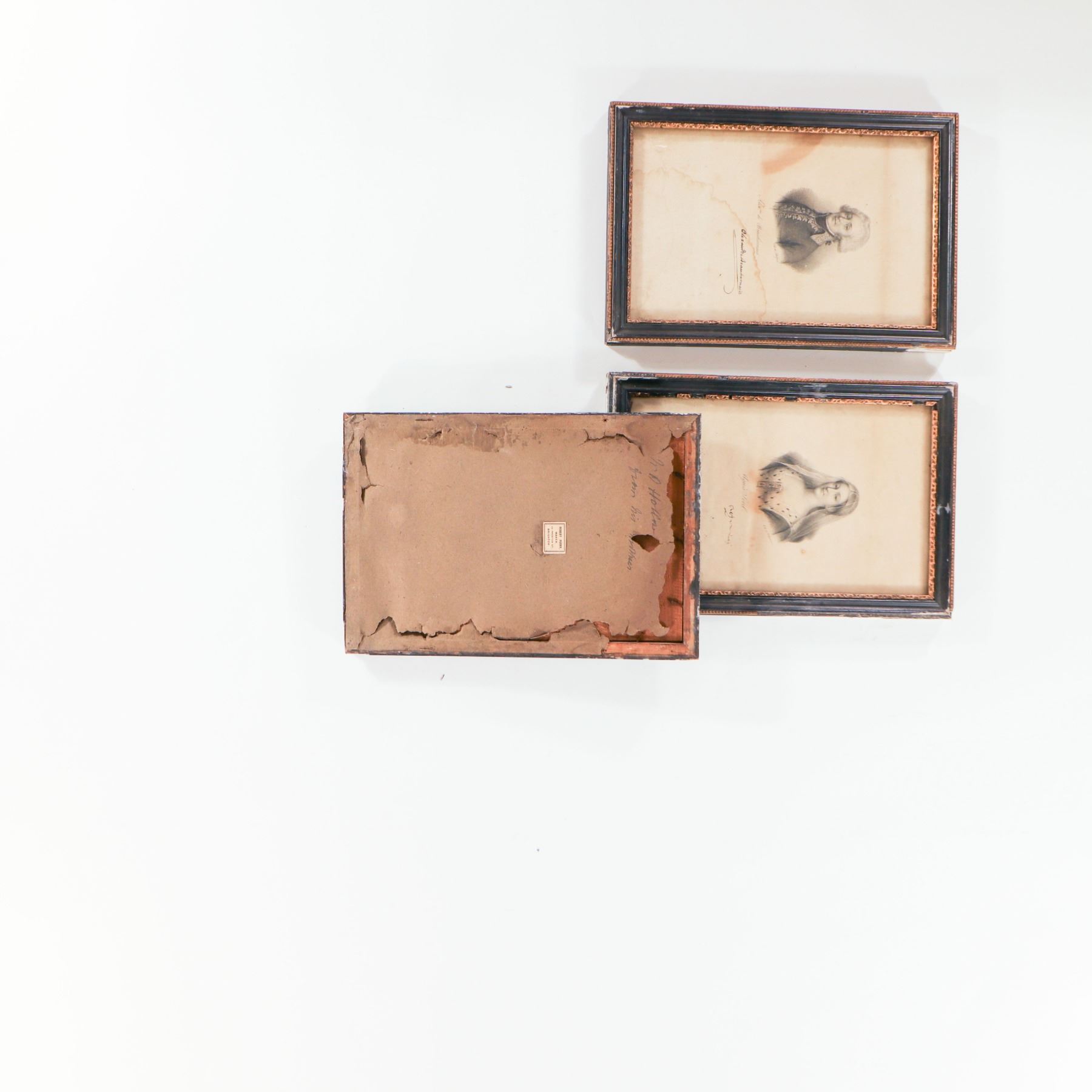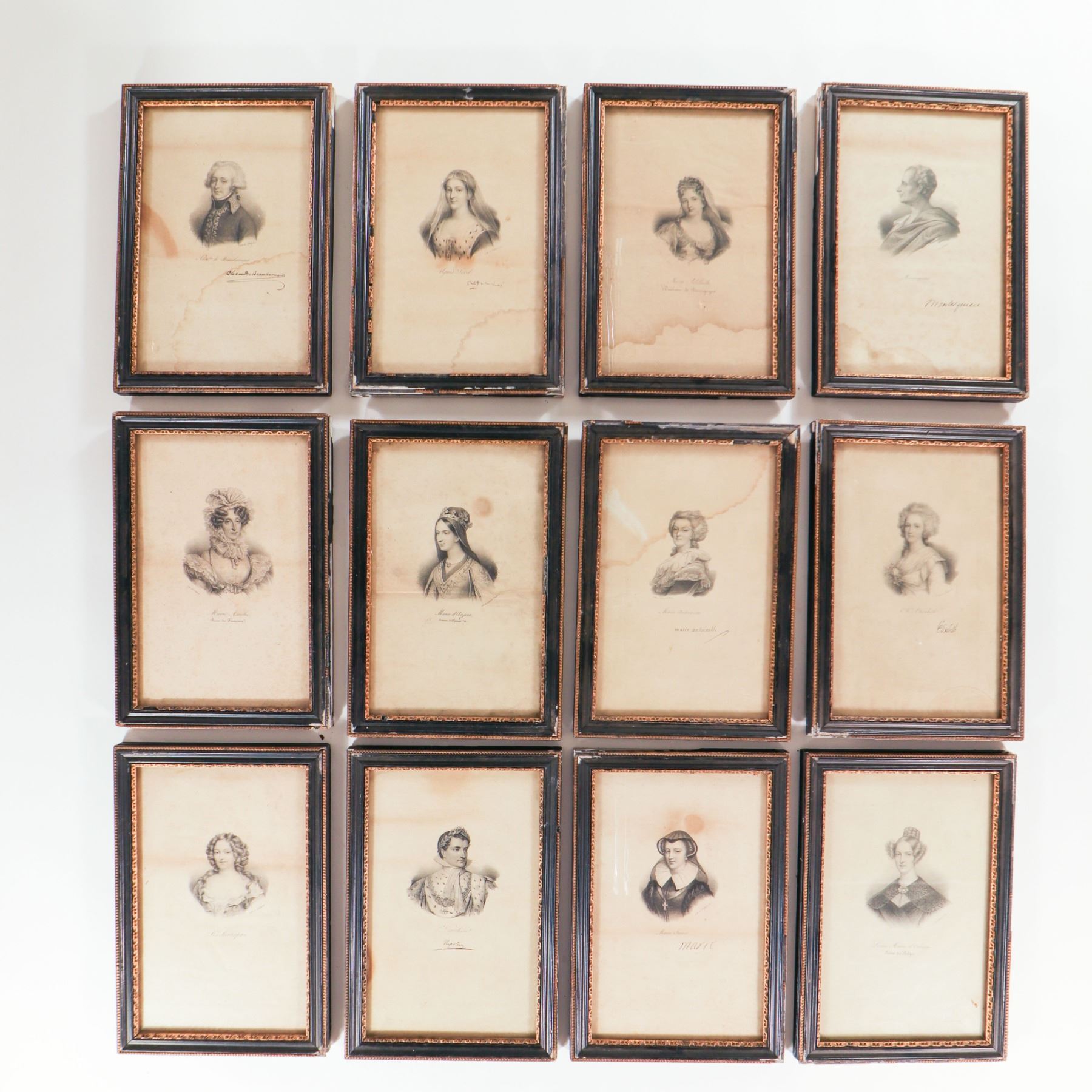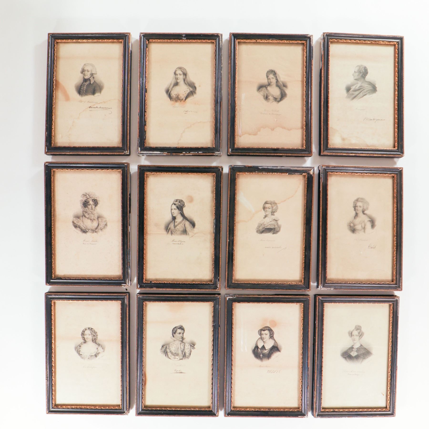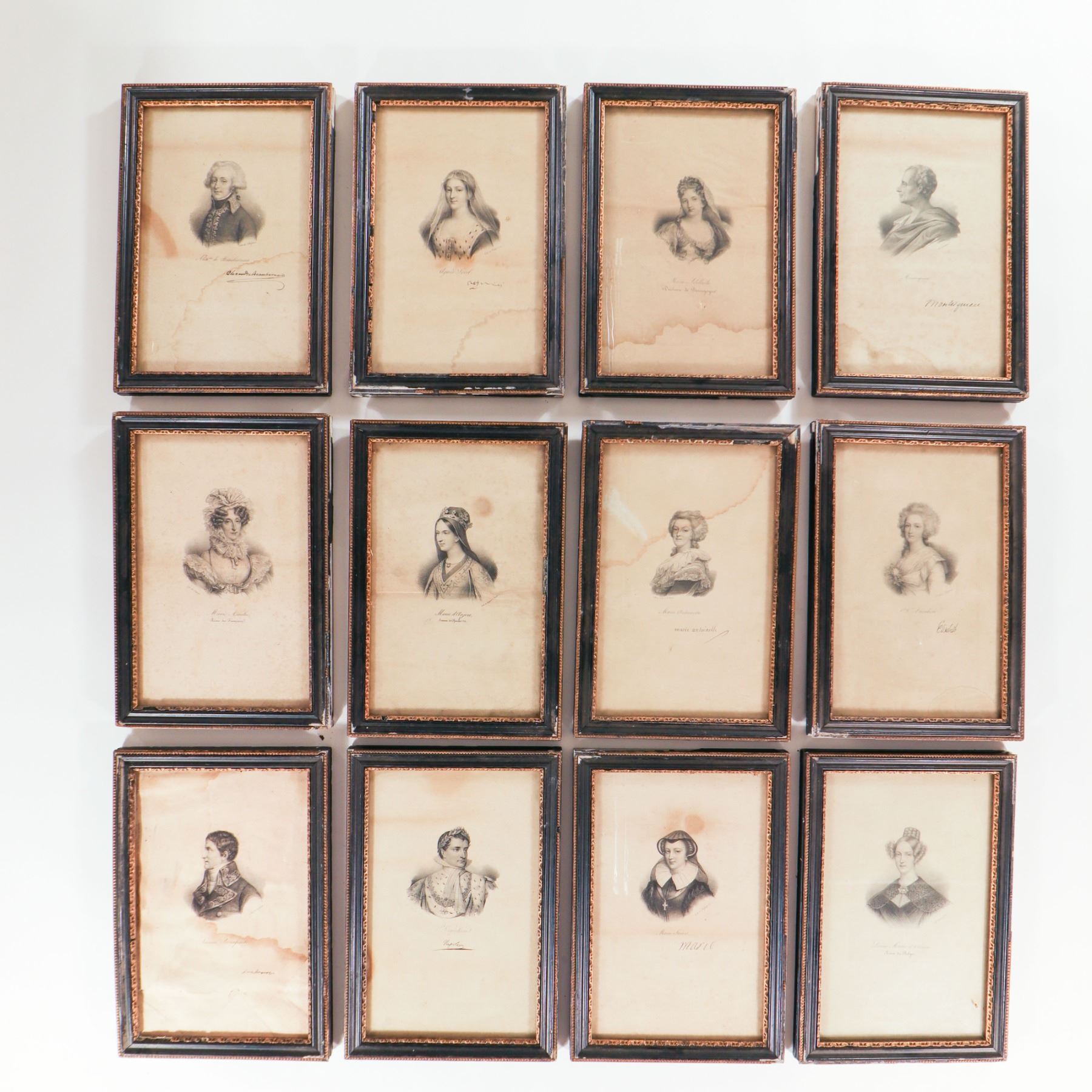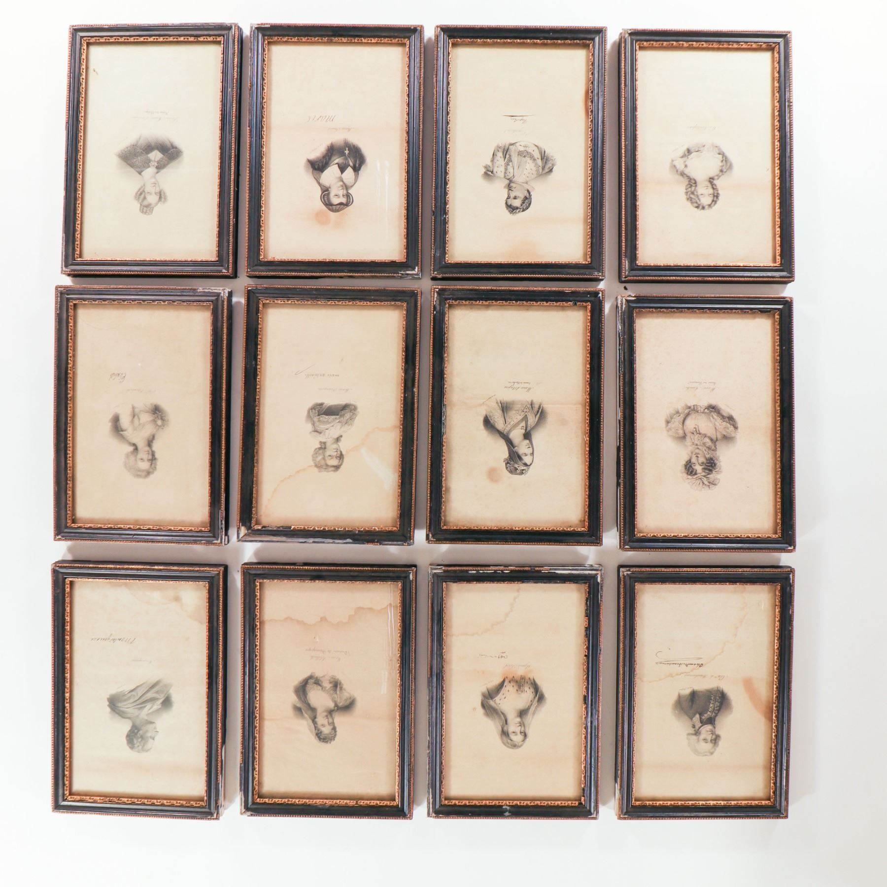Collection of twenty-one small 19th-century engraved portraits, each presented in a narrow ebonised frame with gilt inner beading. The prints, finely worked in black on cream paper, depict various named historical sitters- predominantly ladies in early 19th-century dress with a few male figures-each identified in script in the lower margin. Most appear to be stipple or line engravings after contemporary painted portraits, likely issued as book or portfolio plates and subsequently framed en suite. Several retain remnants of old backing labels to the reverse. An attractive, period set for decorative or scholarly display.