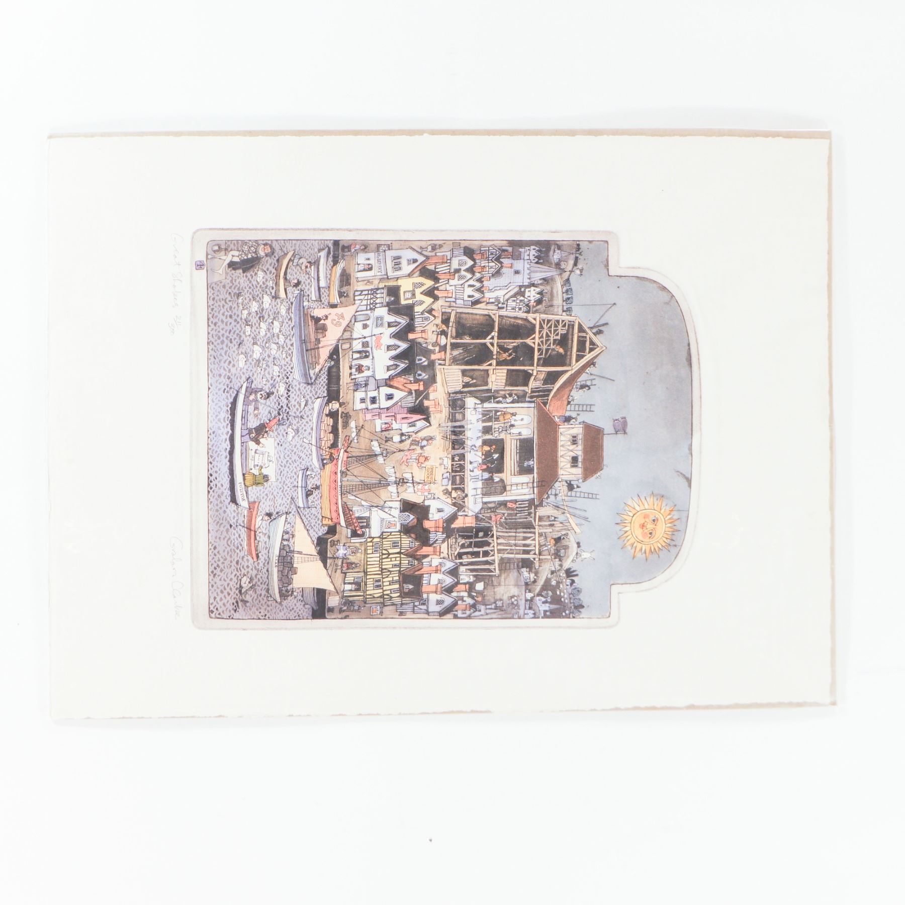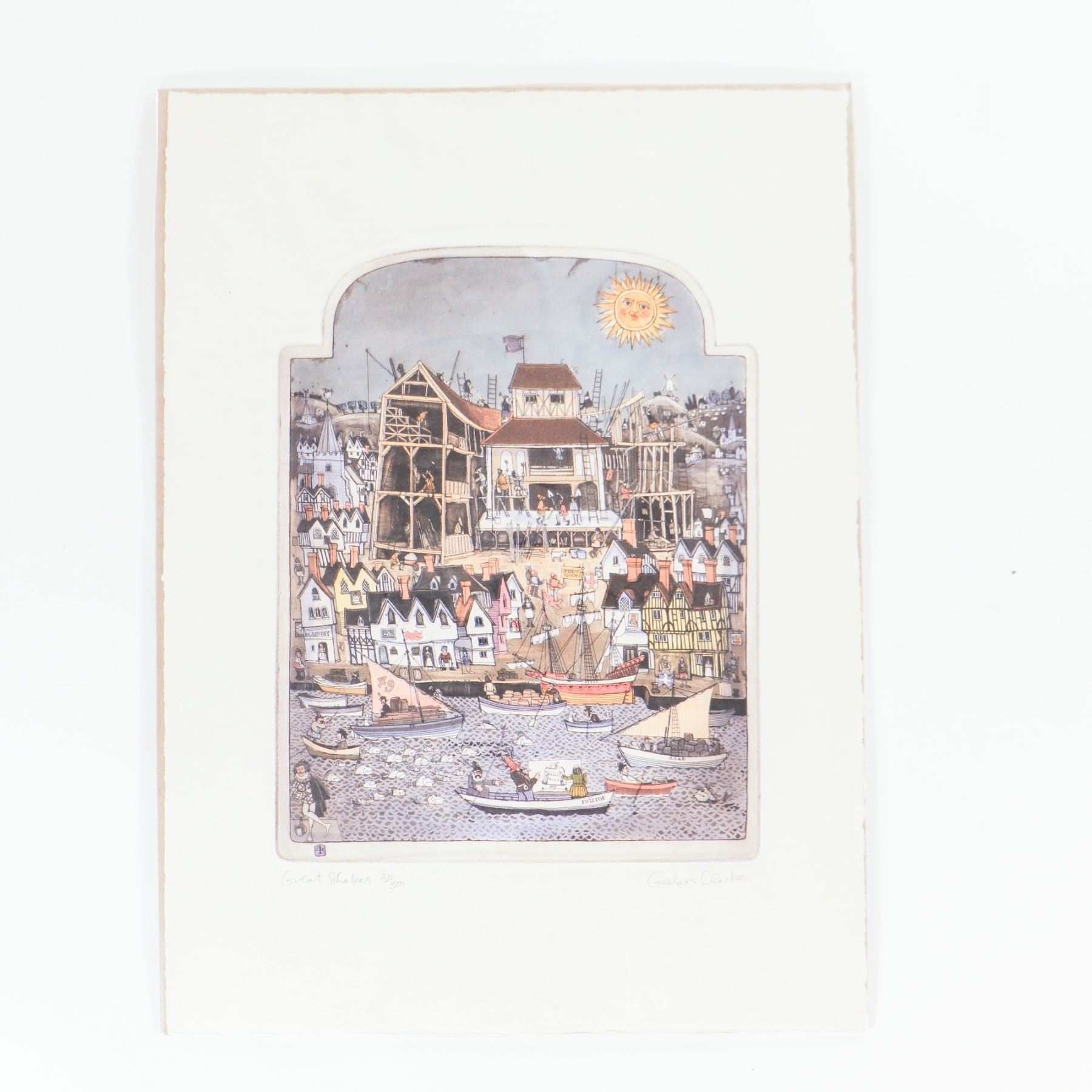 Graham Clarke (British, b. 1941), Great Shakes, large hand-coloured etching with aquatint on wove paper, c. 1970s–80s. Characteristic bustling harbour-and-town scene with boats in the foreground and a medieval-style town under reconstruction behind, the composition contained within an architectural arch and watched over by a smiling sun. Richly printed and delicately hand-coloured in pastel tones with Clarke’s typical humorous detail and crowded narrative vignettes. The work bears the artist’s small red monogram chop to the lower image, with the title and edition number inscribed in pencil in the lower margin and signed at lower right “Graham Clarke.” Unframed.