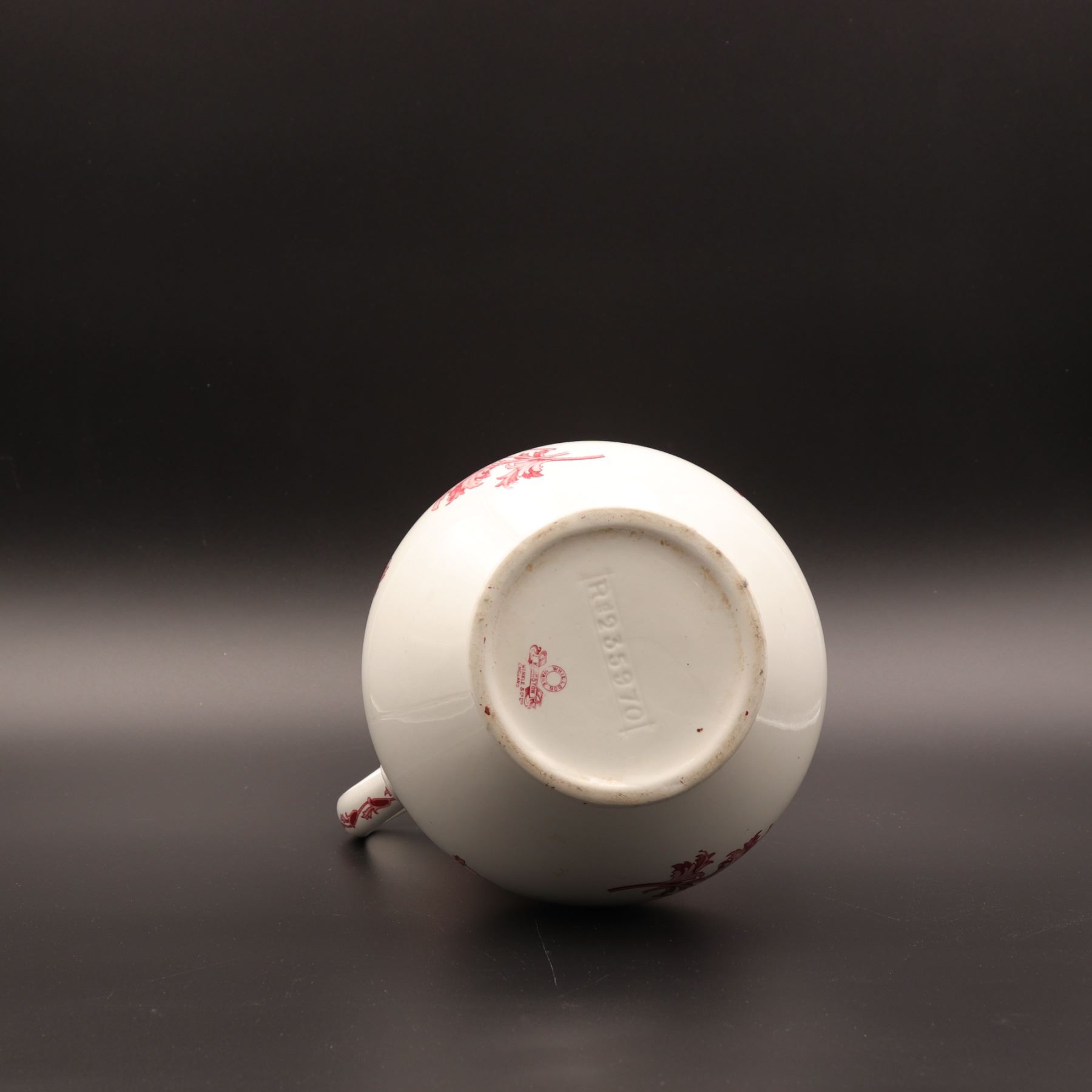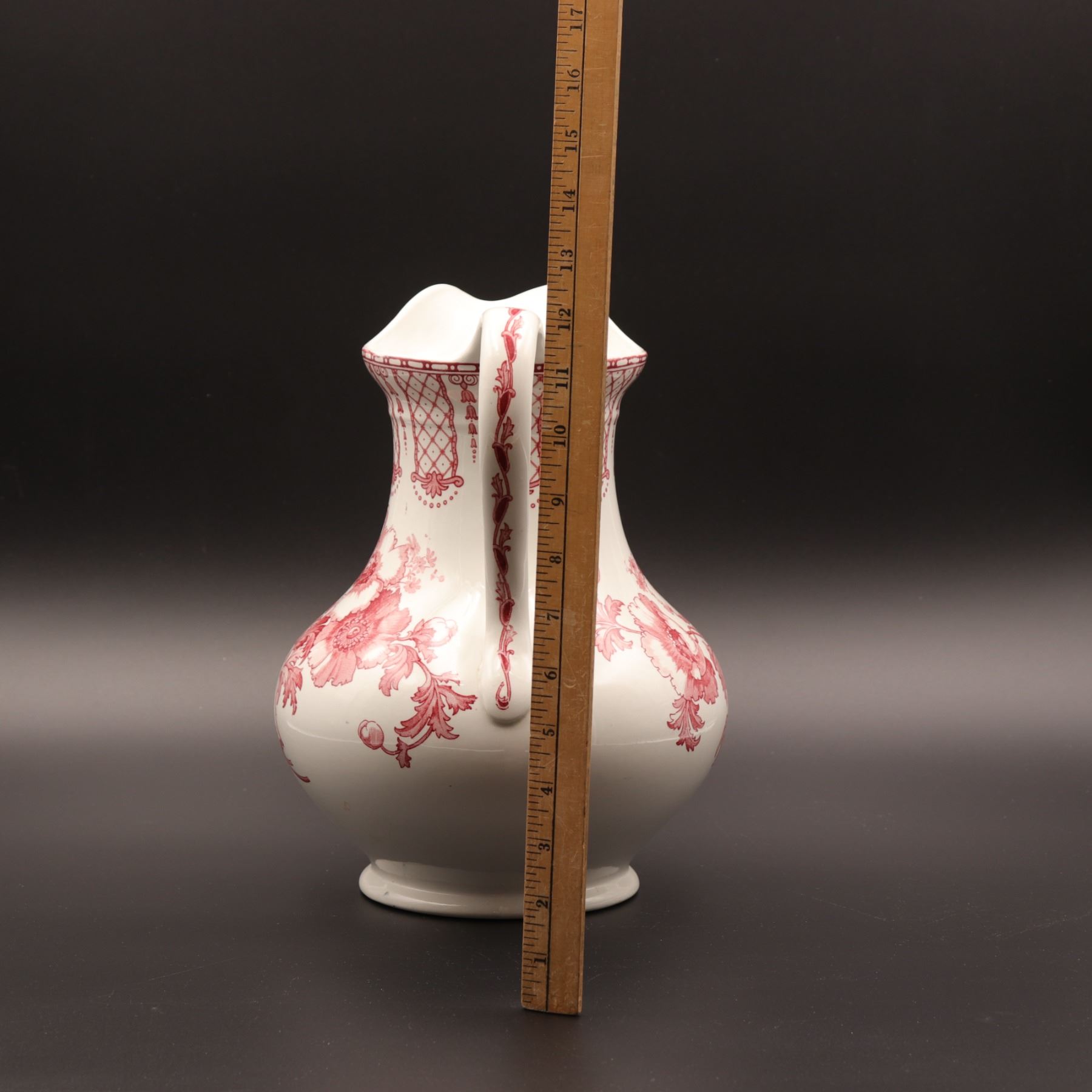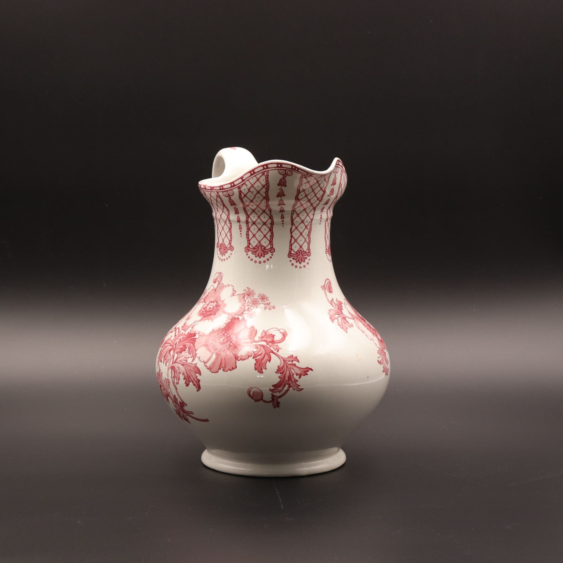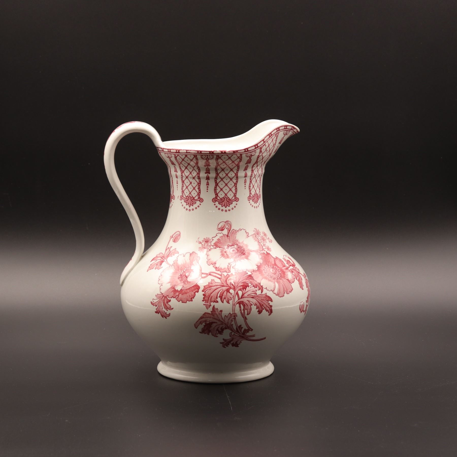 Large English white-glazed pottery wash jug of baluster form, with a flared spout, tall loop handle, and pink transfer-printed floral sprays beneath a pendant lattice border at the neck. The underside bears a red printed factory mark and an impressed registration number. Likely produced in the late Victorian to early Edwardian period for washstand use. Presents well, with light surface and footrim wear visible and no obvious major structural damage.