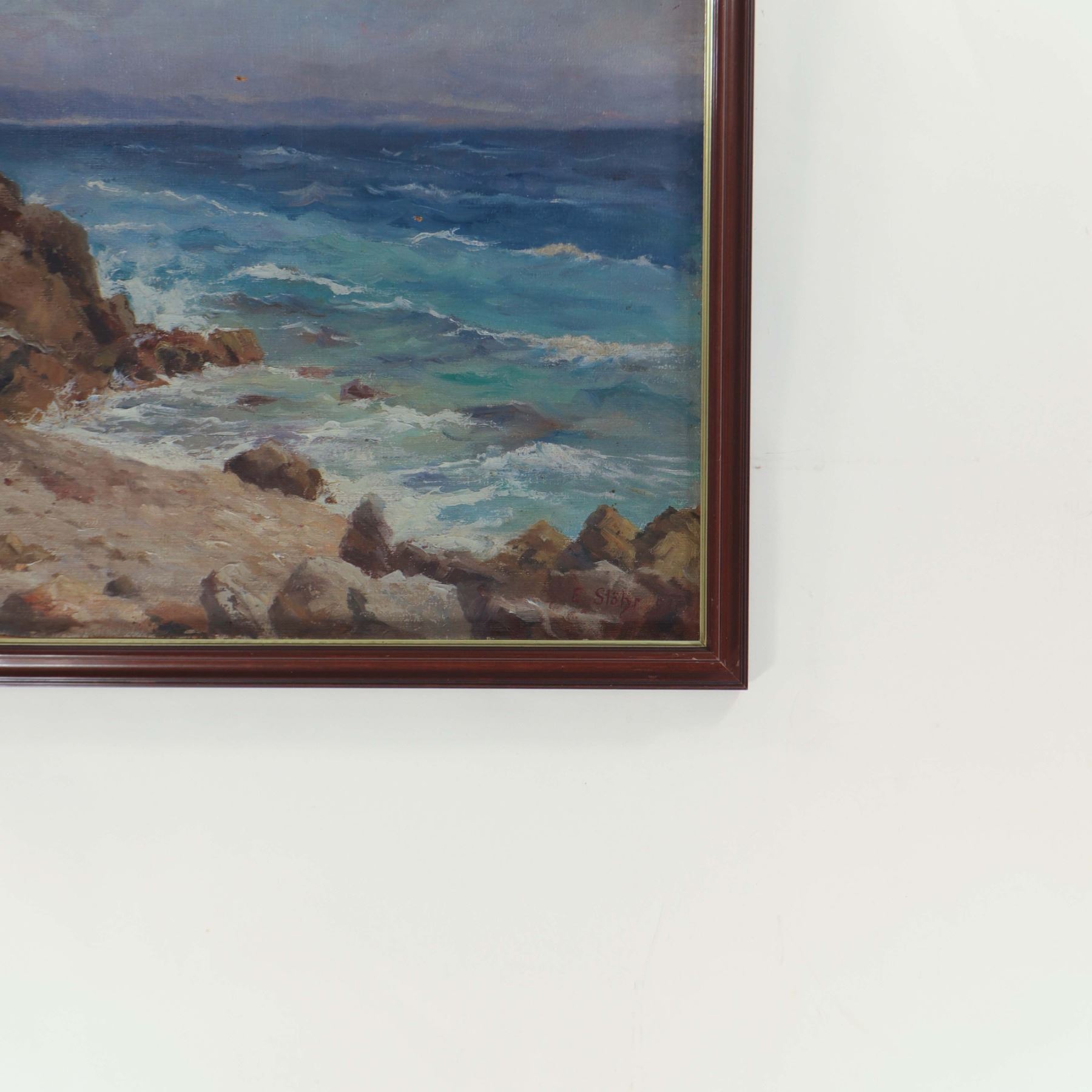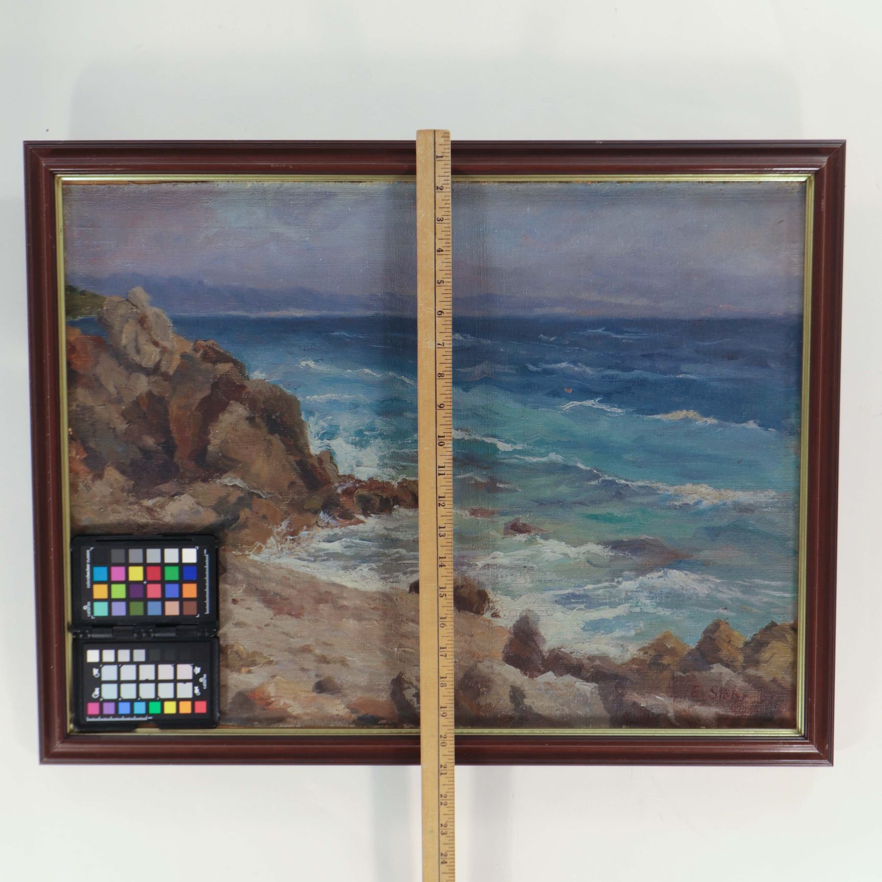 Framed oil painting depicting a rocky shoreline with breaking surf, signed indistinctly “Stöhr 911” within the composition. Surface wear and minor age marks visible; 27 x 21 x 1.25 in. framed.