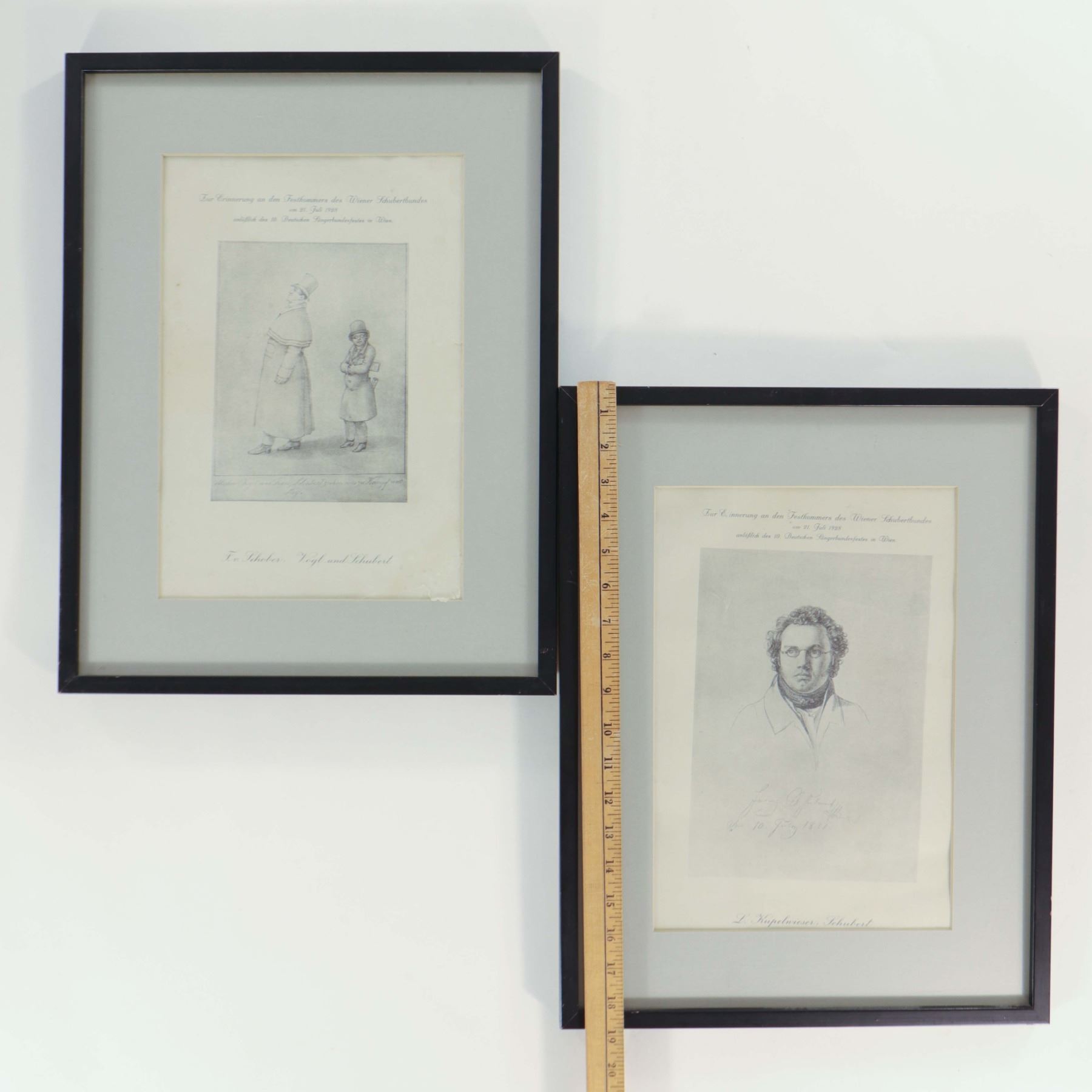 A pair of framed monochrome photomechanical commemorative prints on paper relating to Franz Schubert and the Schubert circle, each with a printed German heading associated with the Wiener Schubertbund. One sheet is after Leopold Kupelwieser and shows a bust portrait of Schubert; the other, after Franz von Schober, appears titled Vogl und Schubert. The lot is presented as a matched pair in later black frames with wide mats and offers clear appeal as Viennese musical-historical ephemera rather than as original 19th-century drawings. Visible condition includes light toning, minor spotting, and modest frame wear; not examined out of frame.