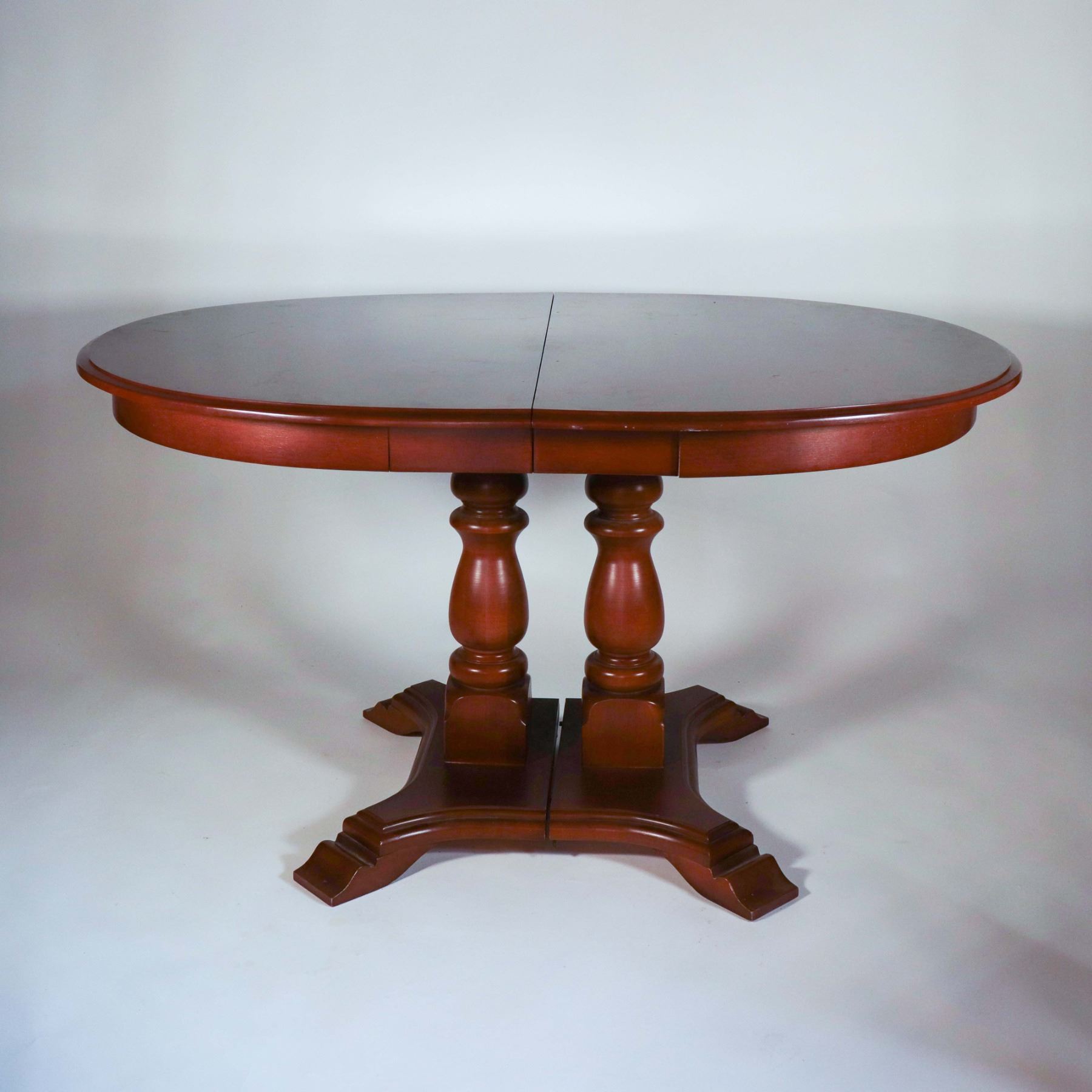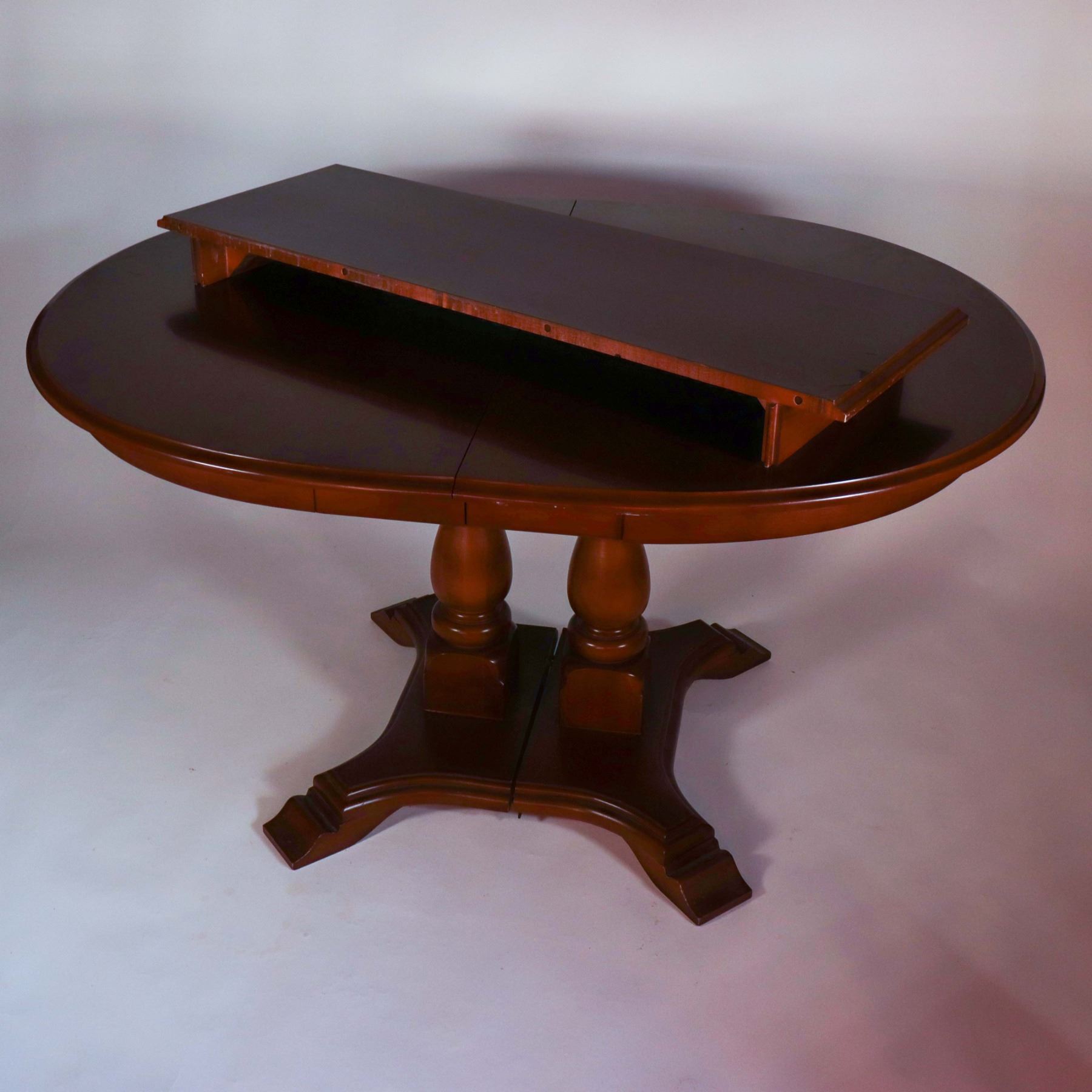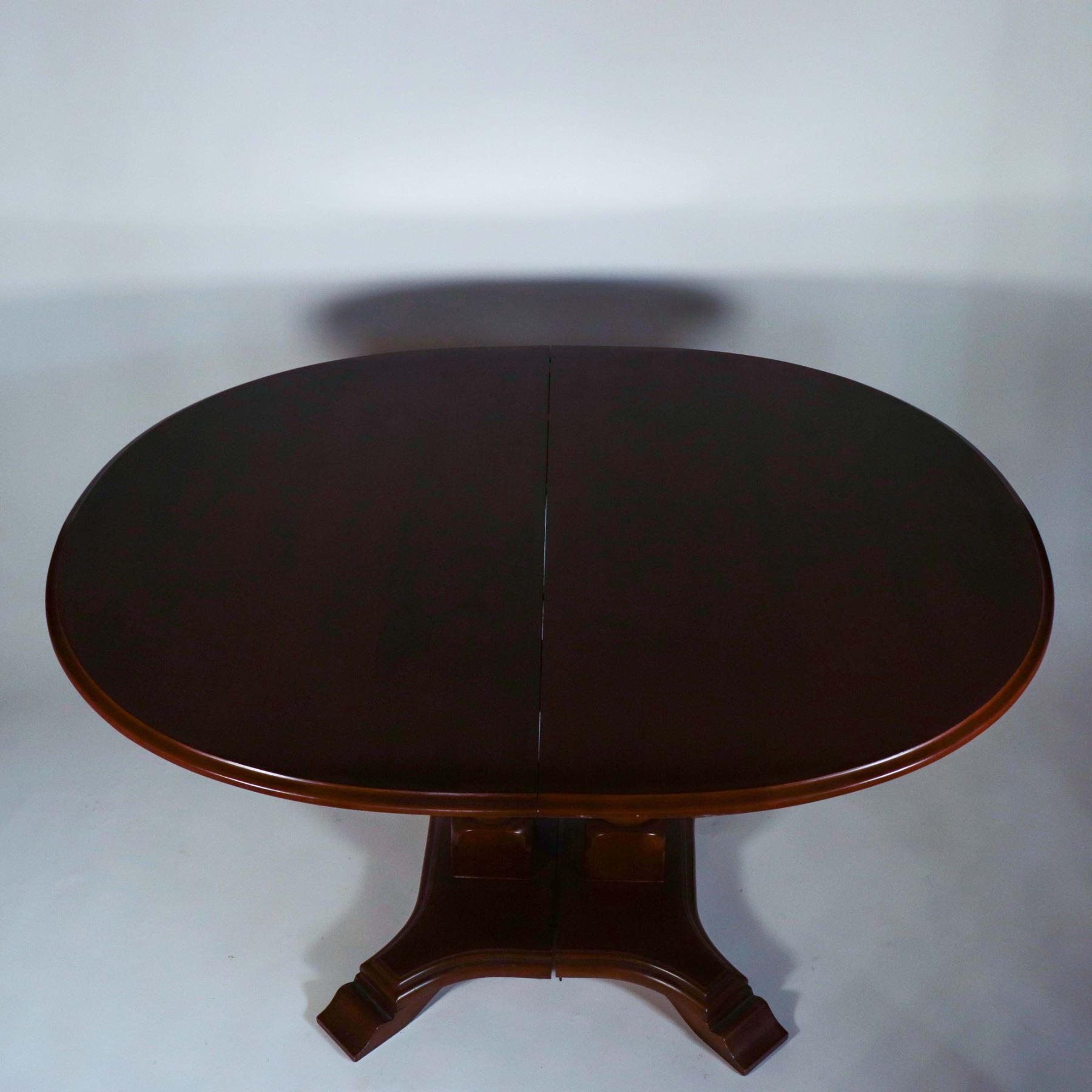 Oval dining table by Walter Gagné of Victoriaville, with central leaf and twin pedestal supports on molded bases. General surface wear from use, including light marks and scratches.