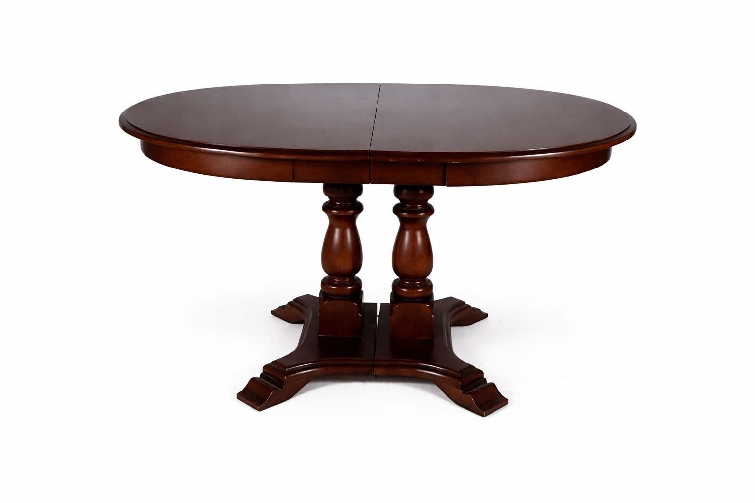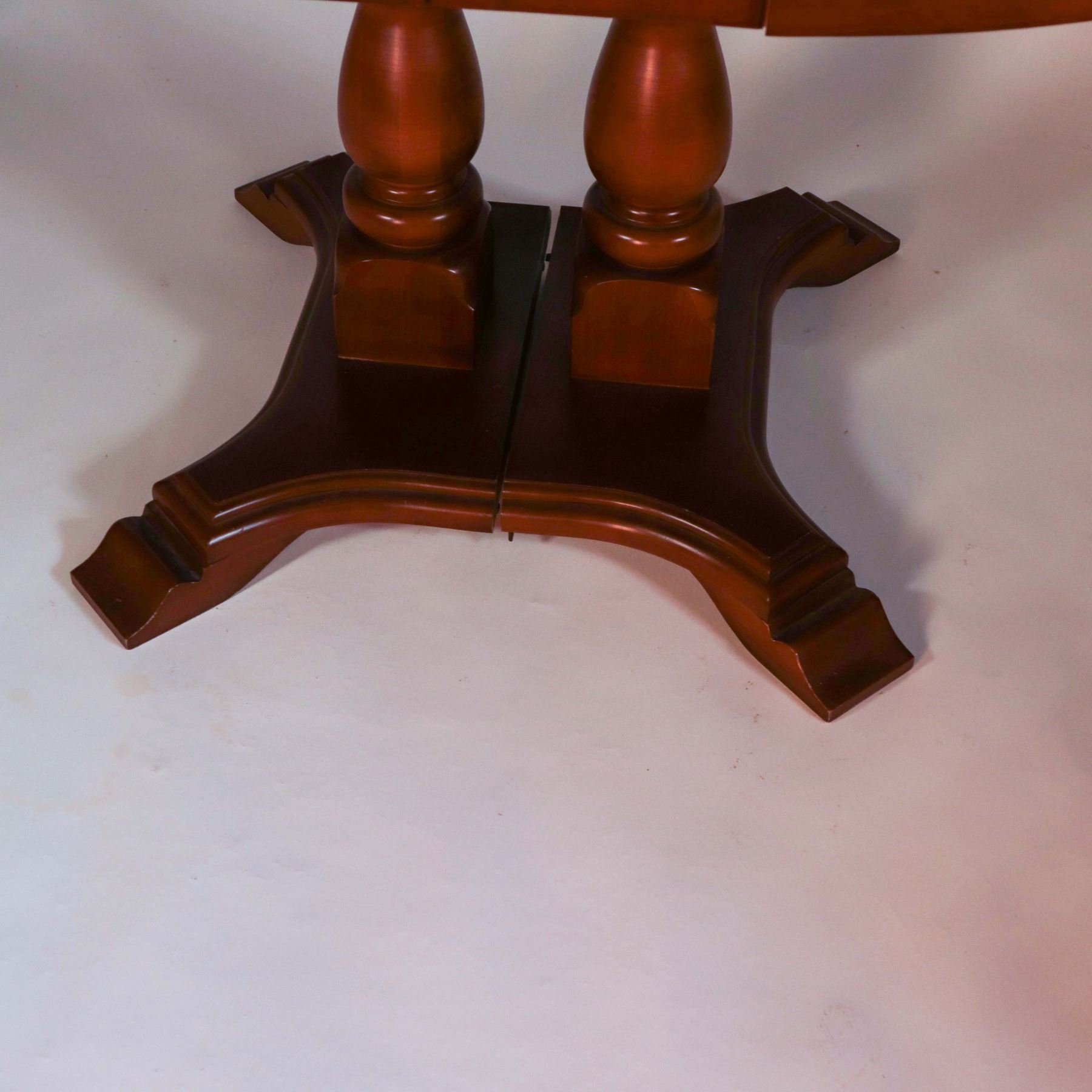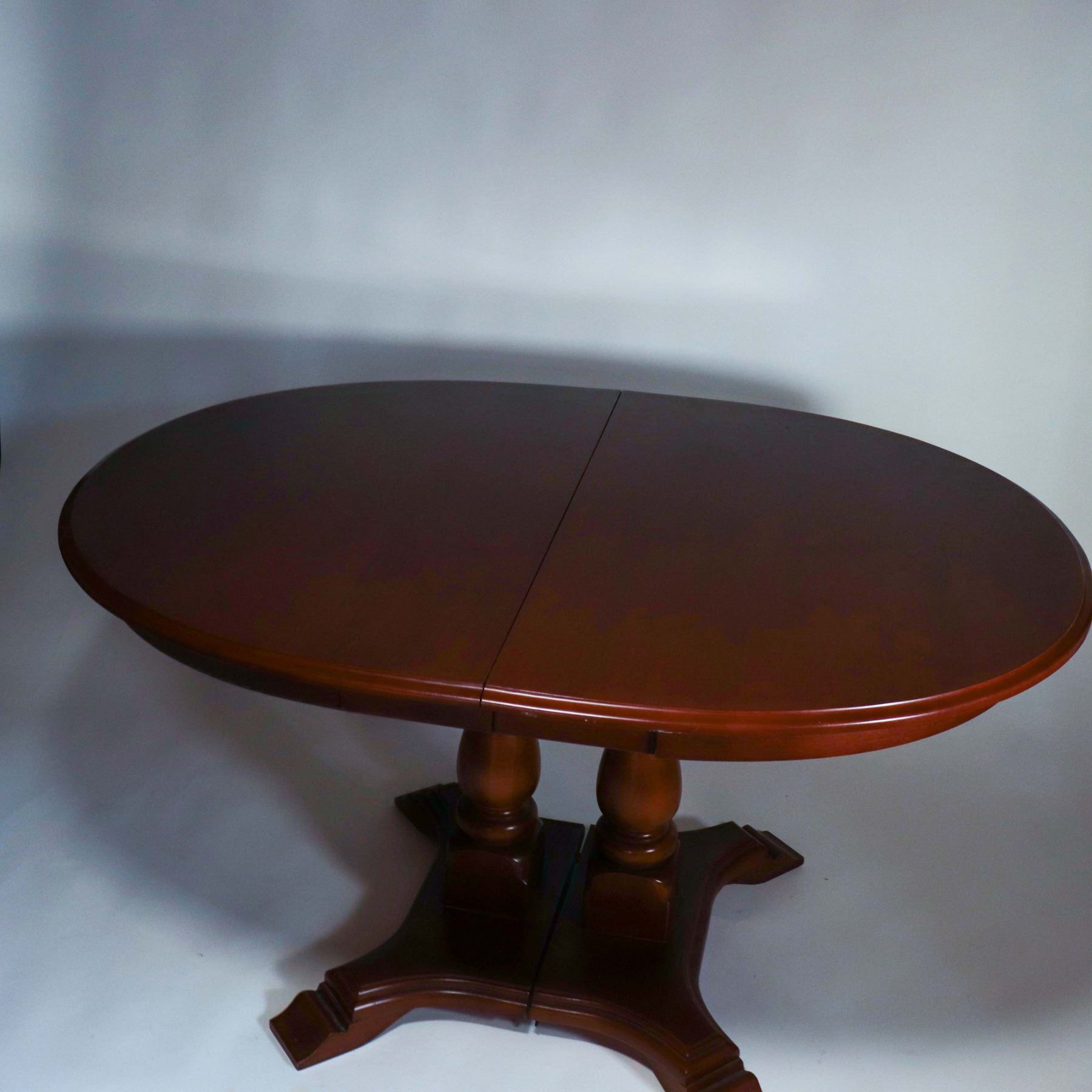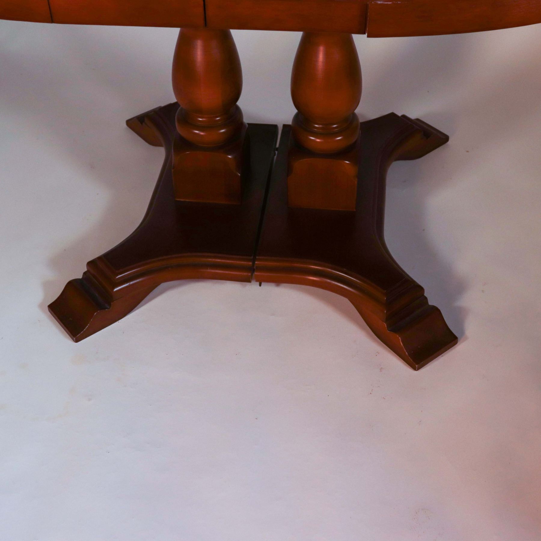 Oval dining table by Walter Gagné of Victoriaville, with central leaf and twin pedestal supports on molded bases. General surface wear from use, including light marks and scratches.