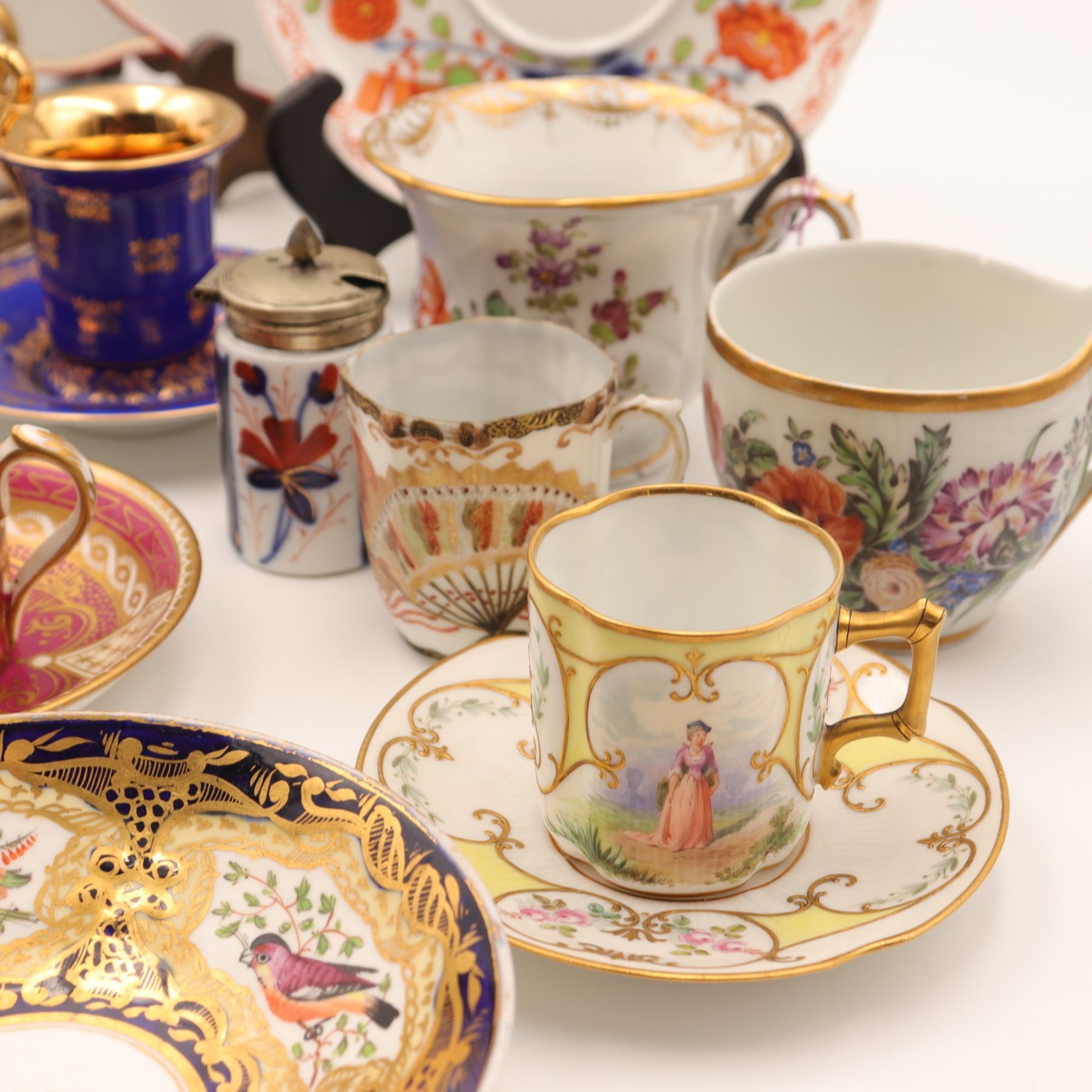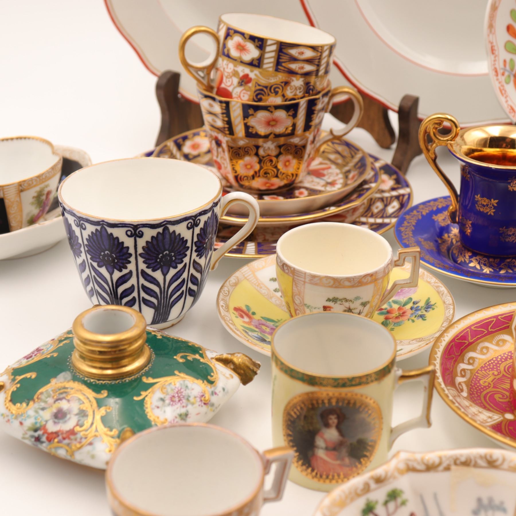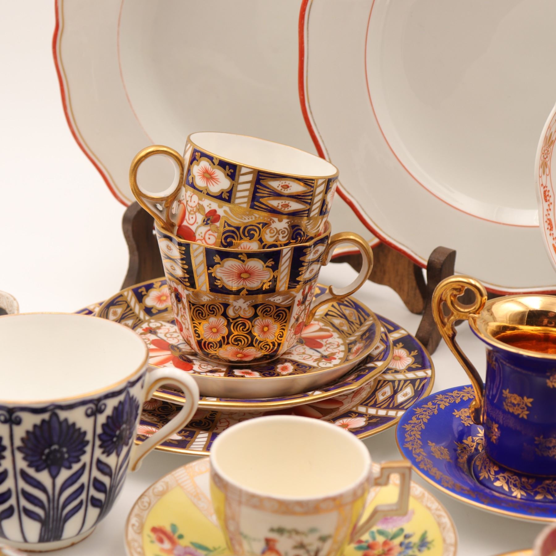 A decorative assembled group of approximately two dozen porcelain tea and cabinet wares, comprising cups and saucers, demitasse examples, plates, bowls, cream jugs, and other small associated table pieces. The lot includes cobalt, iron-red, and gilt Imari-style wares, floral-sprig and scenic-decorated cups, portrait-reserve examples, a cobalt-ground cup and saucer, two larger white scalloped dishes with iron-red rims, and additional serving pieces. The group reads as largely English and Continental, late 19th to 20th century, with varied revivalist and export-inspired decorative language. Overall condition appears very good to near excellent and initial notes, with no chips or cracks observed and only light handling or minor gilt wear visible.