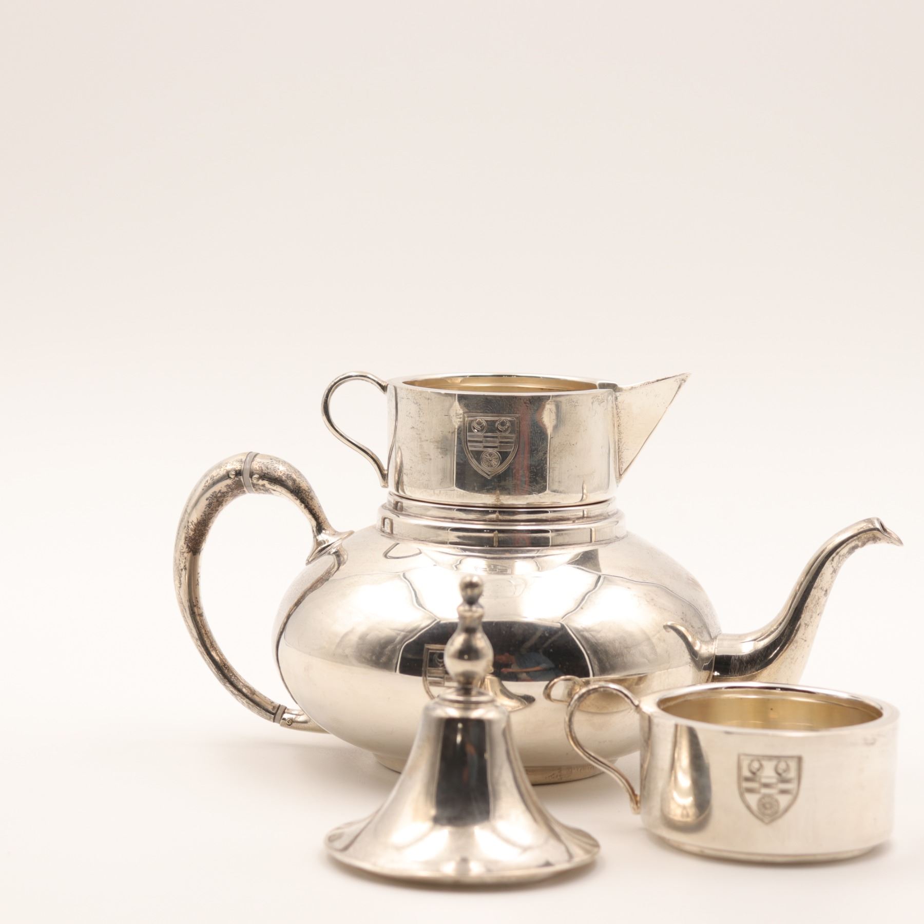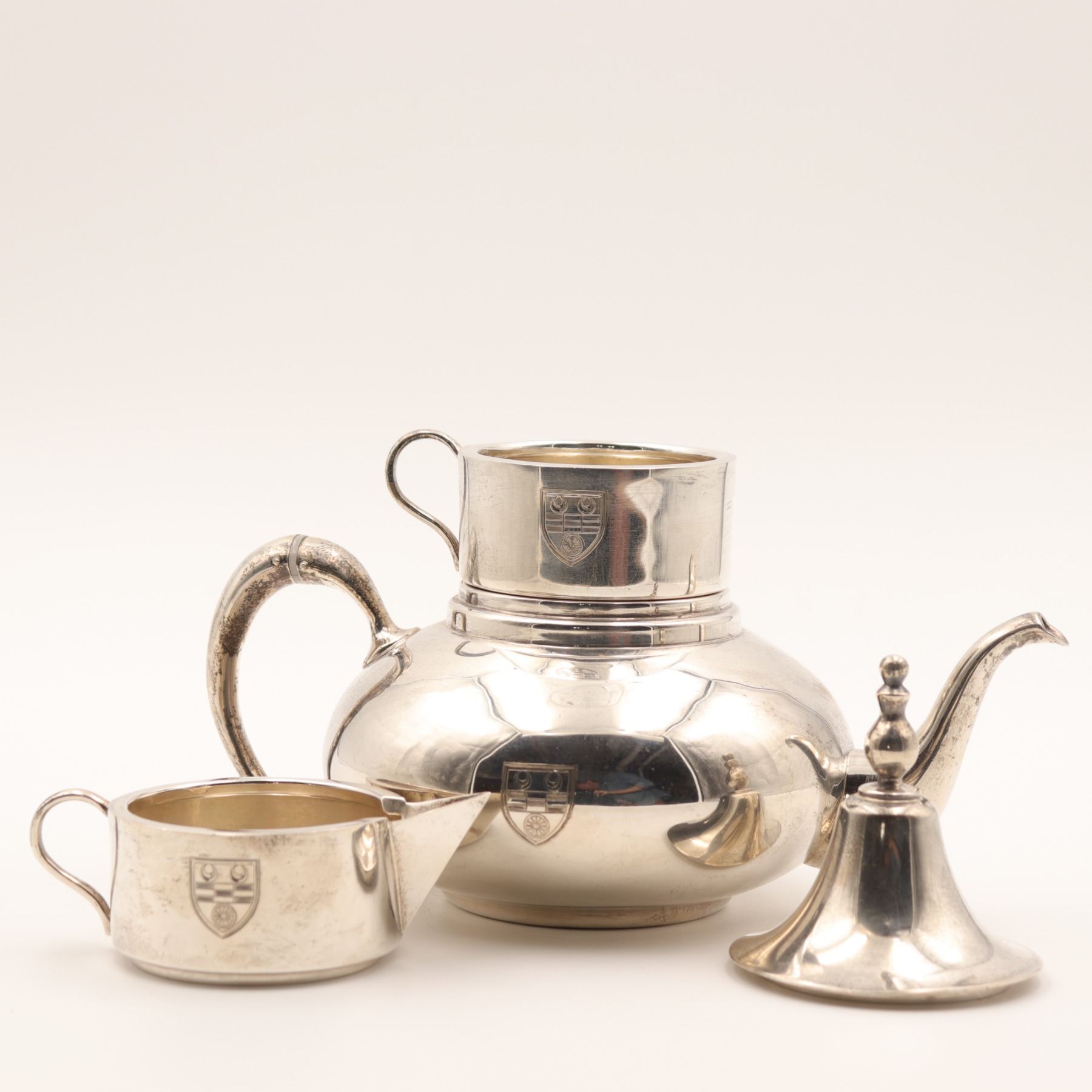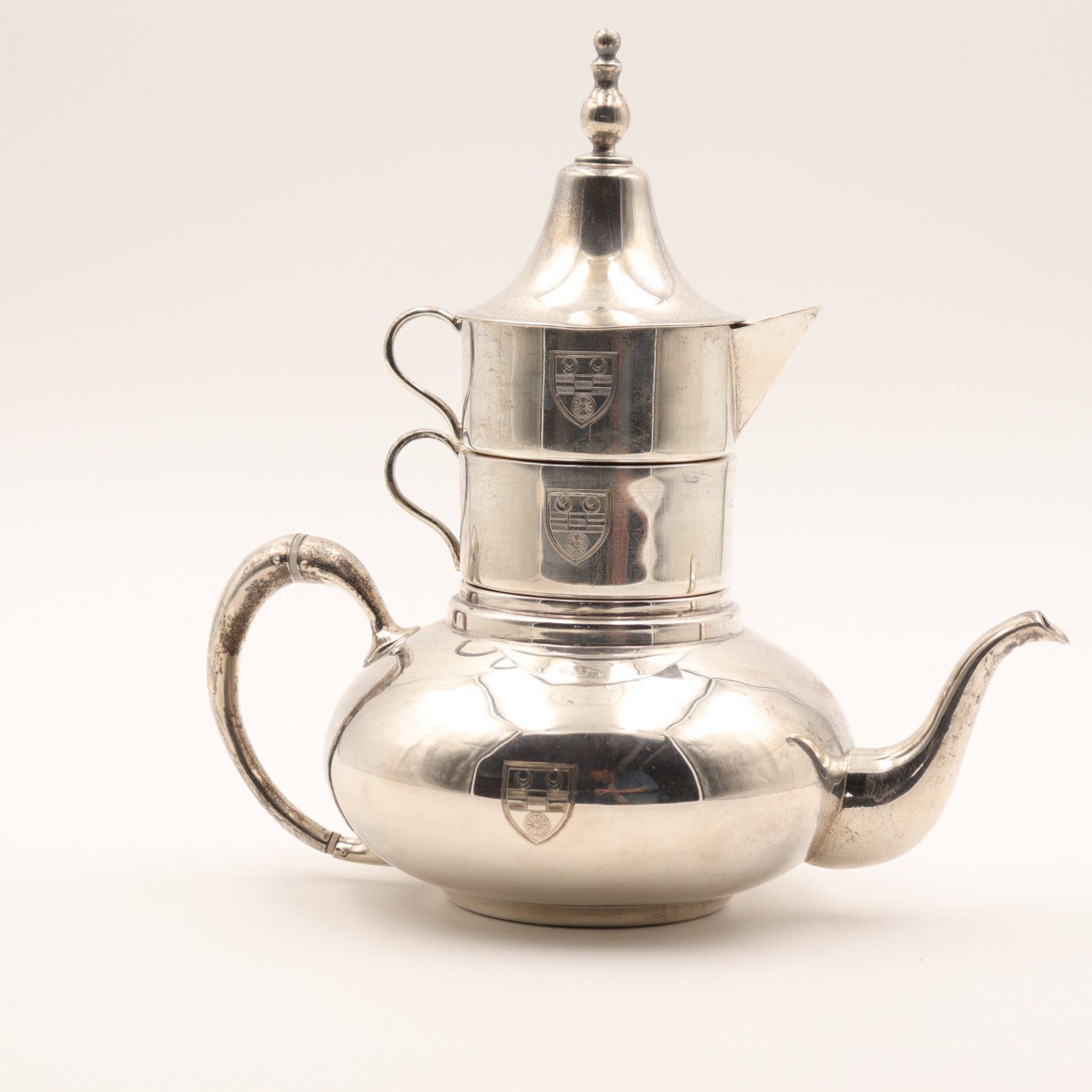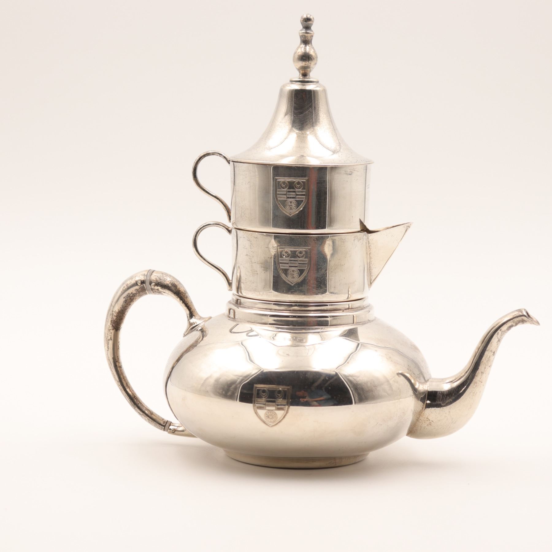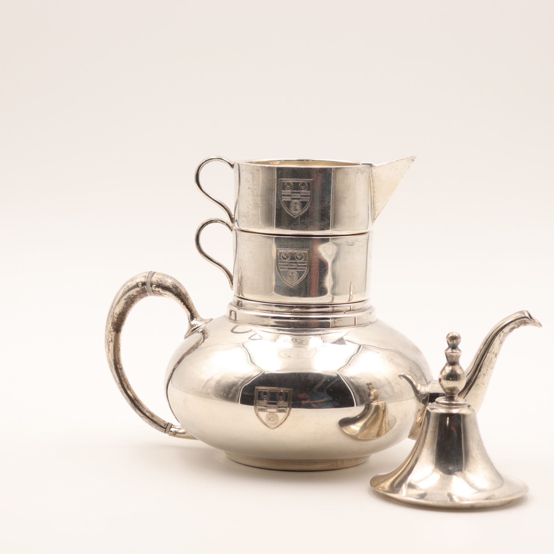 Birks (Henry Birks & Sons), Montreal. A sterling silver stacking tea/coffee service comprising a small teapot base with curved spout and scroll handle, an intermediate handled vessel, a creamer with spout, and a domed lid with finial. Each section engraved to the front with a matching shield-form crest. Marked to underside BIRKS / STERLING (additional marks present). Gross weight approximately 912 grams.