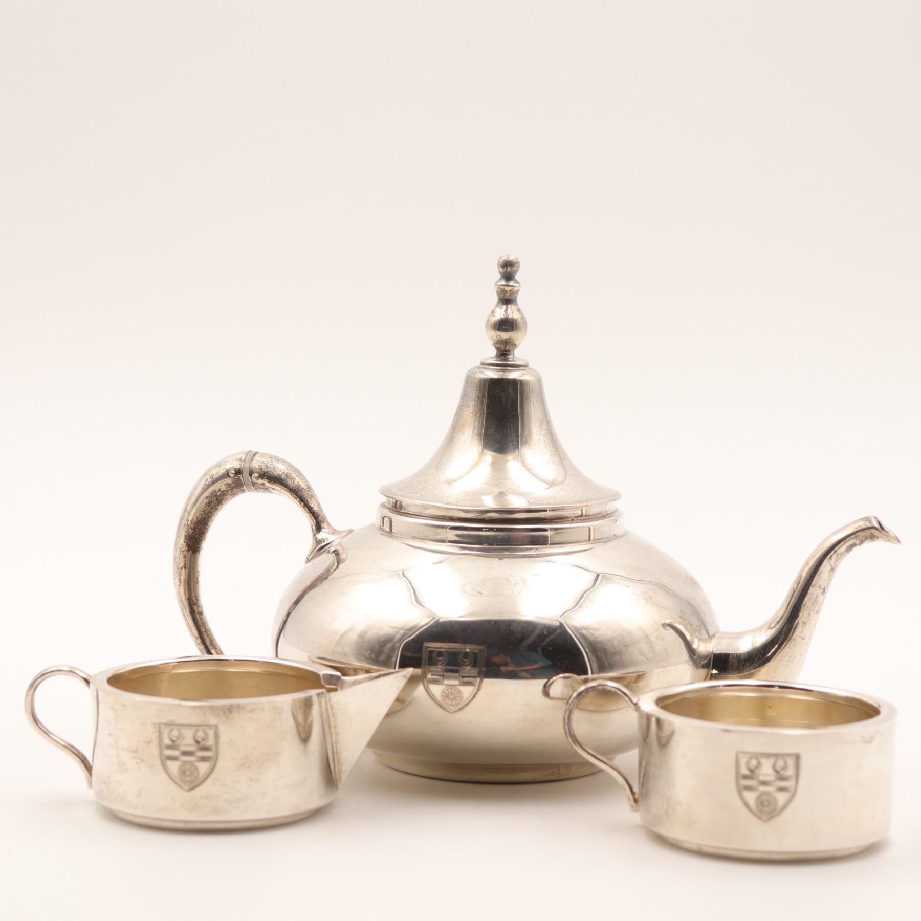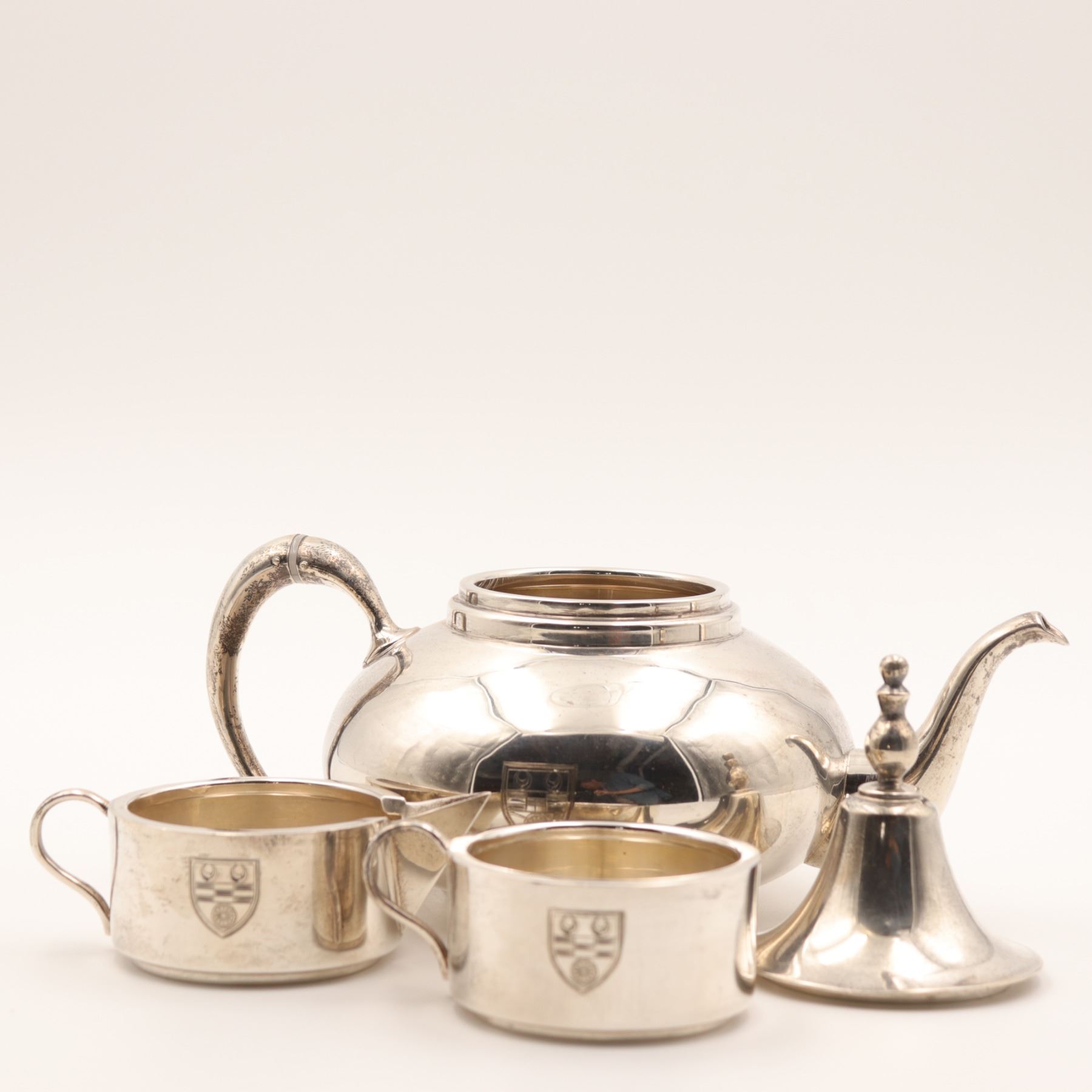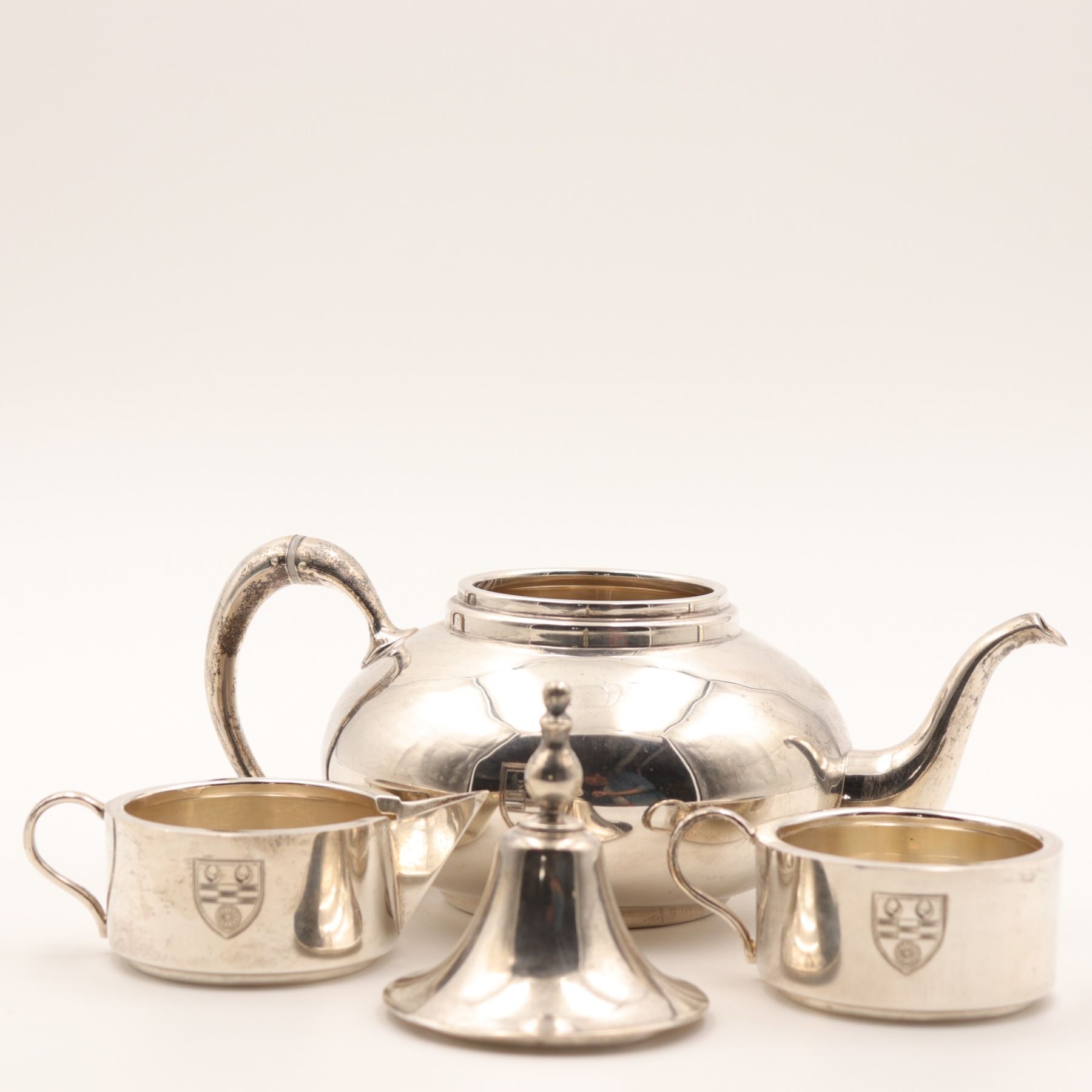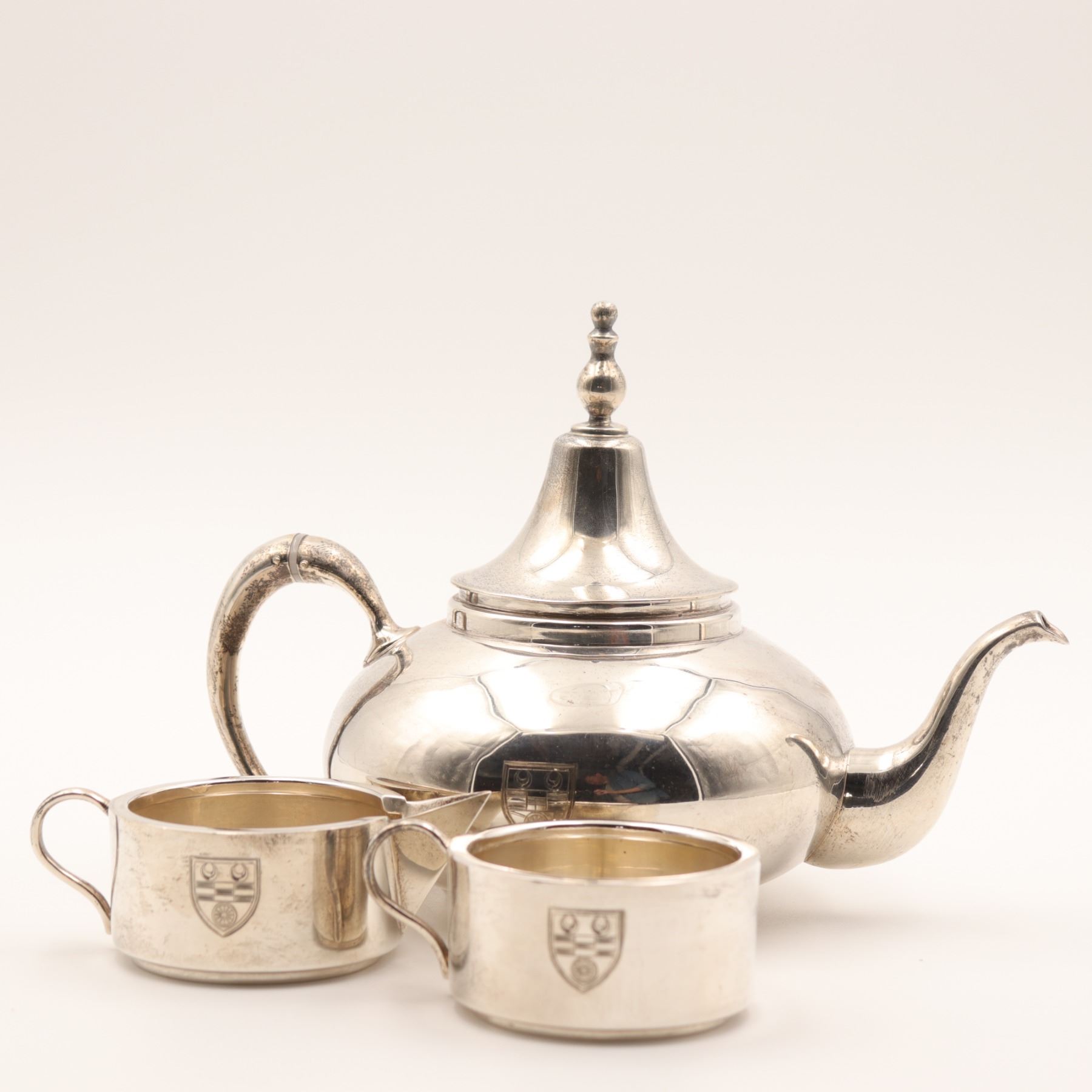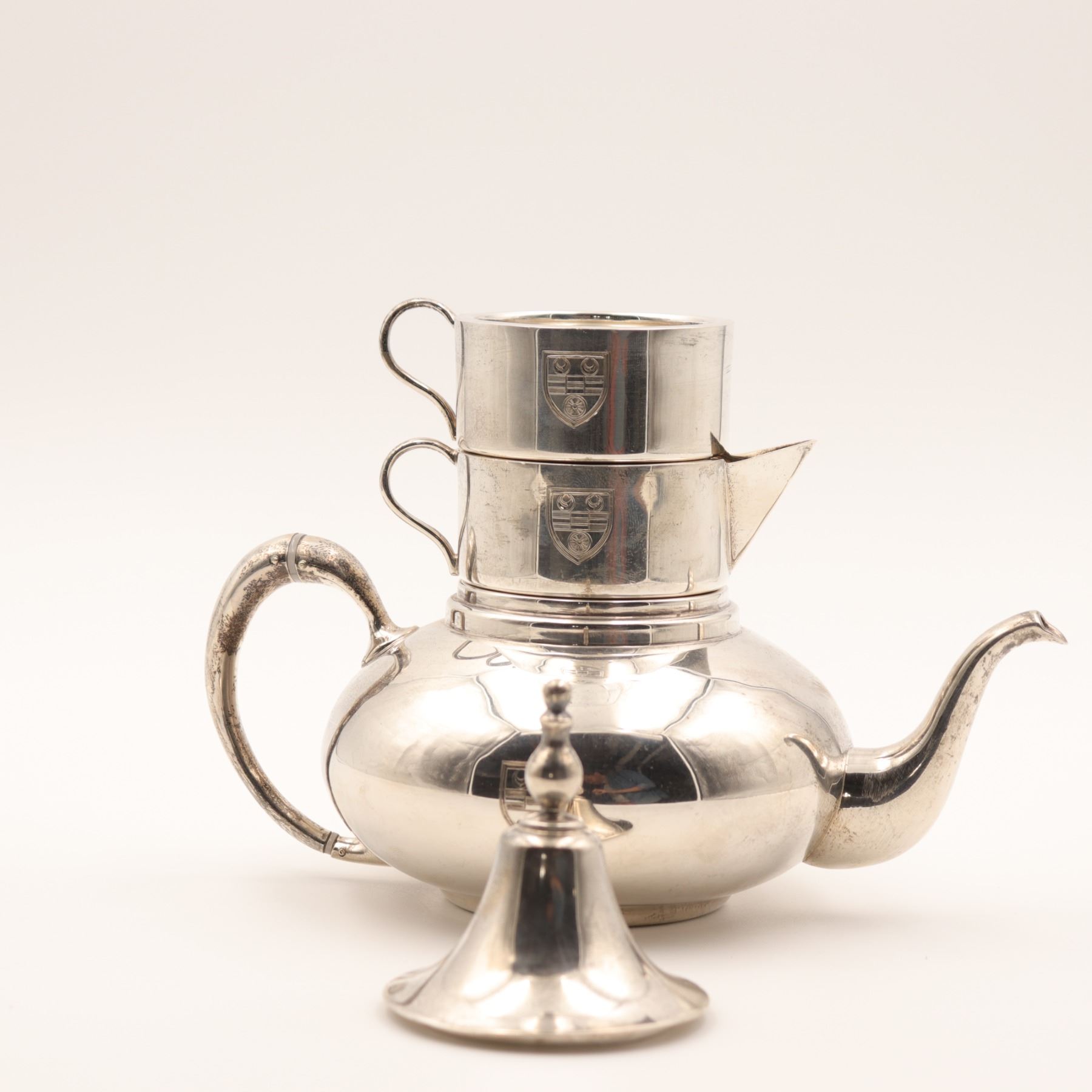 Birks (Henry Birks & Sons), Montreal. A sterling silver stacking tea/coffee service comprising a small teapot base with curved spout and scroll handle, an intermediate handled vessel, a creamer with spout, and a domed lid with finial. Each section engraved to the front with a matching shield-form crest. Marked to underside BIRKS / STERLING (additional marks present). Gross weight approximately 912 grams.