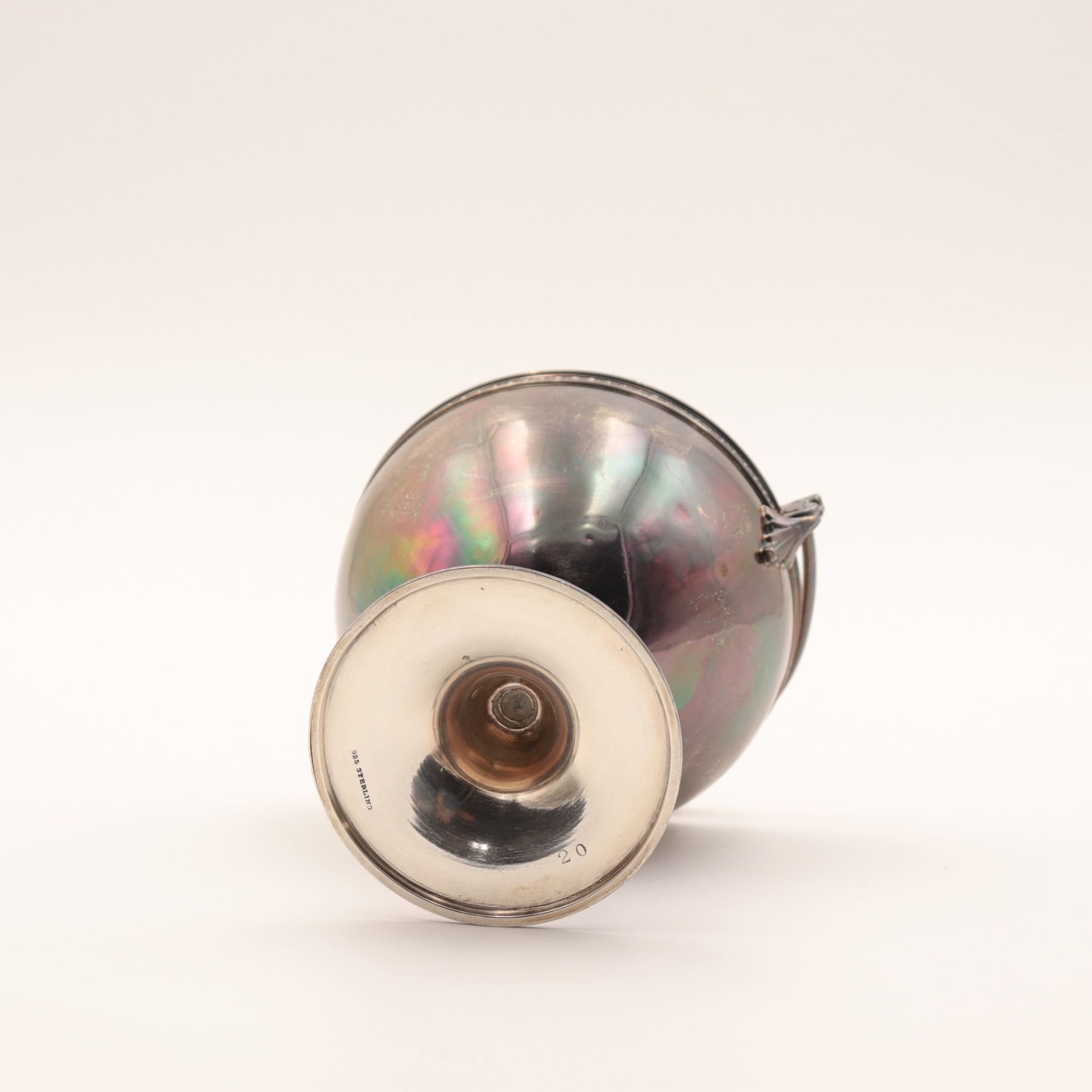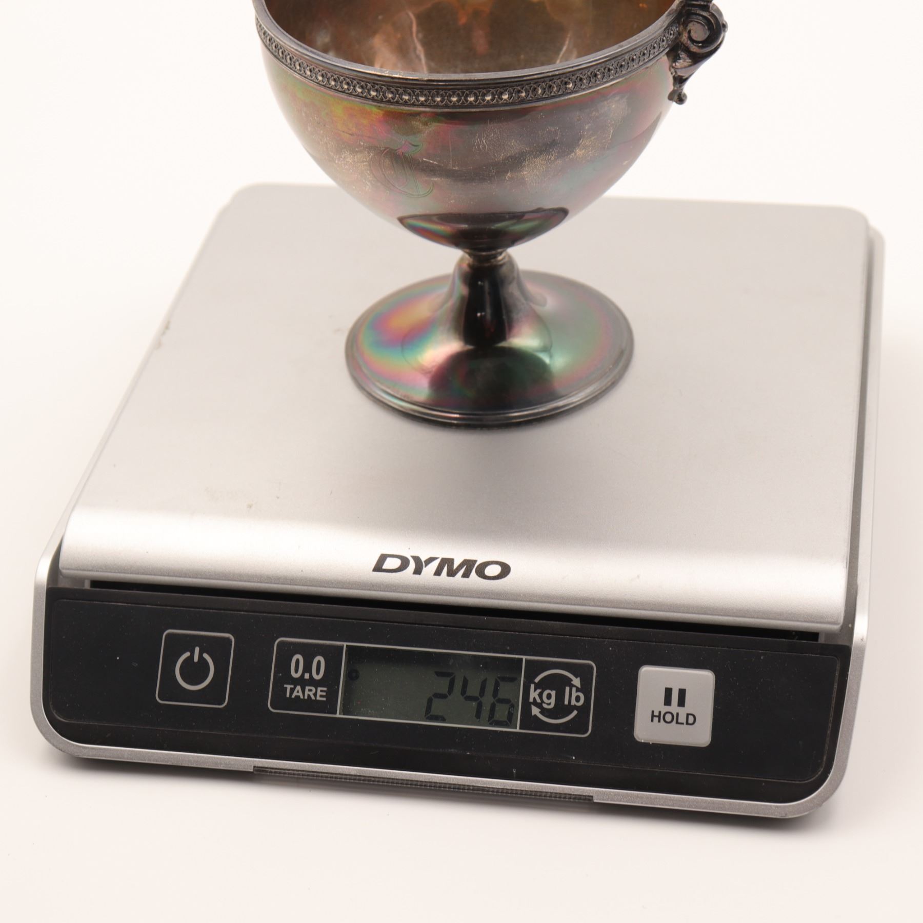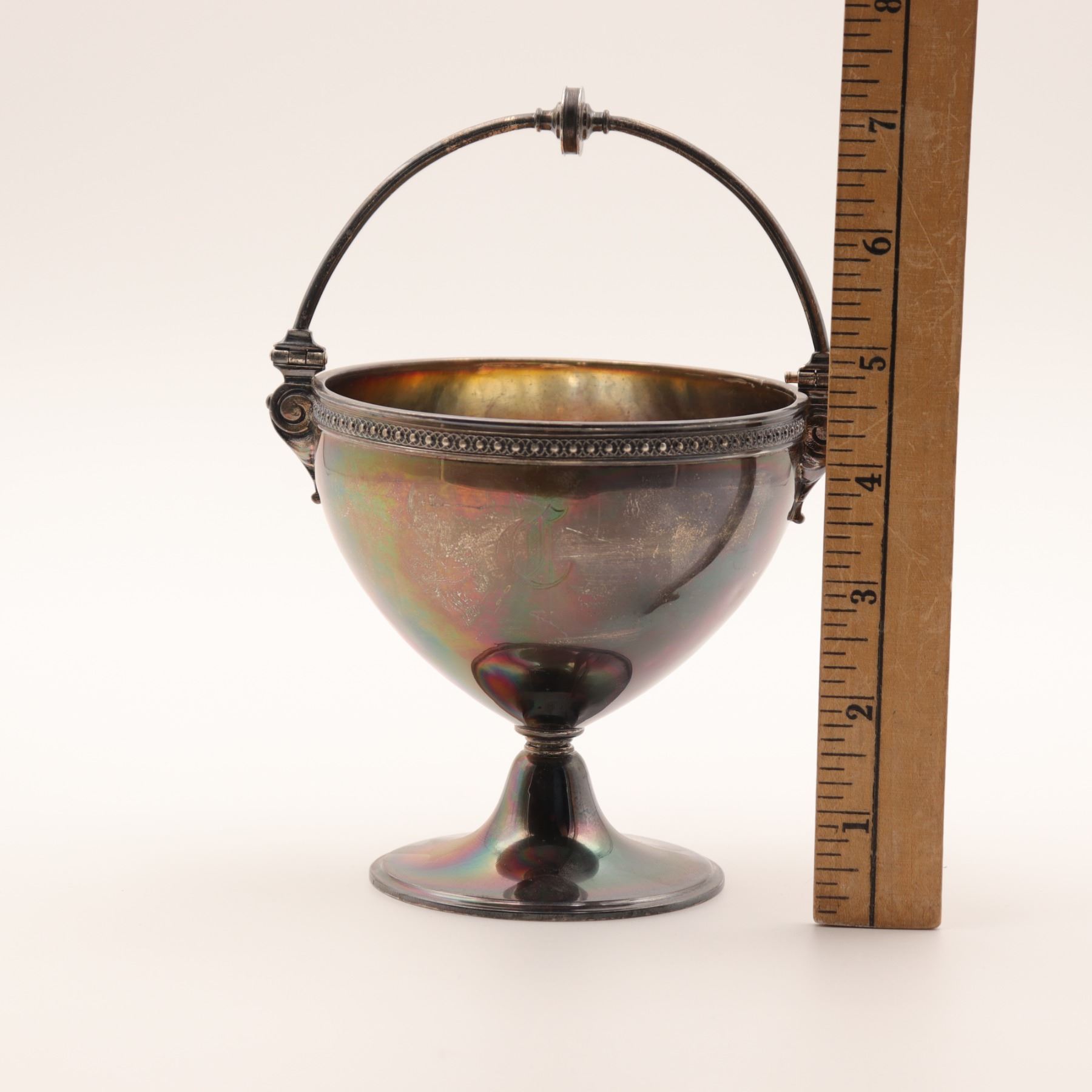 A sterling silver (925) pedestal bowl/compote with swing (bail) handle, beaded rim, and scroll-form handle terminals; engraved monogram to body as visible. Marked “925” to underside. Weight: 246 grams (sterling).