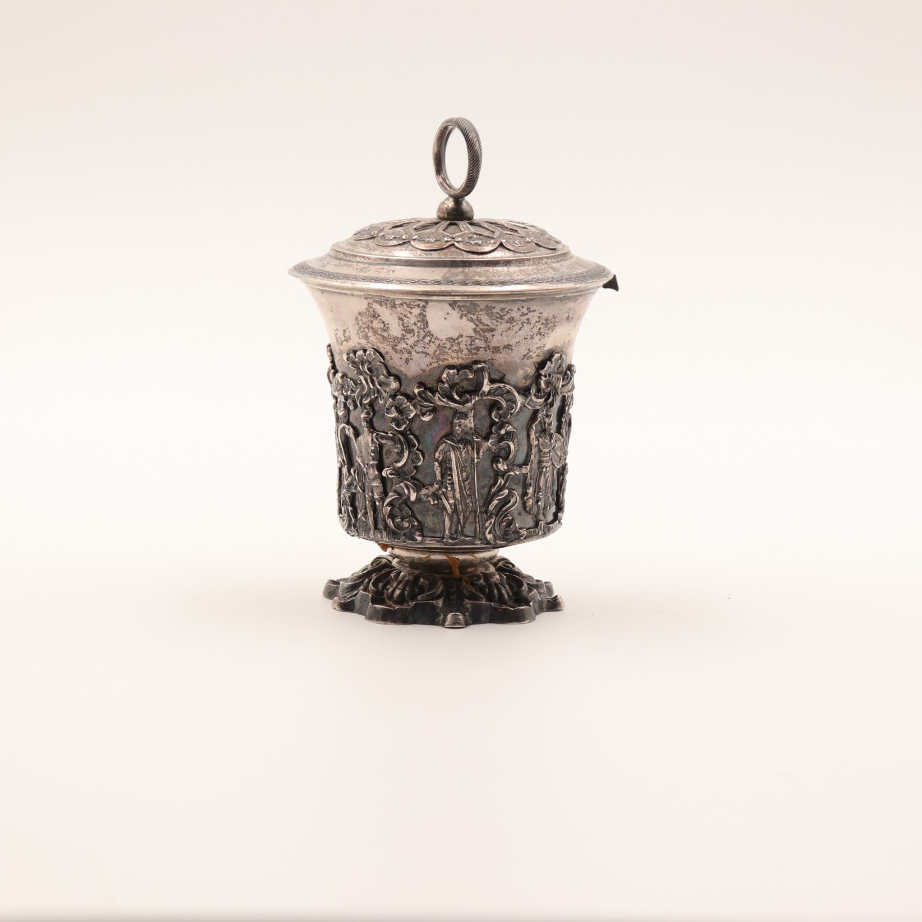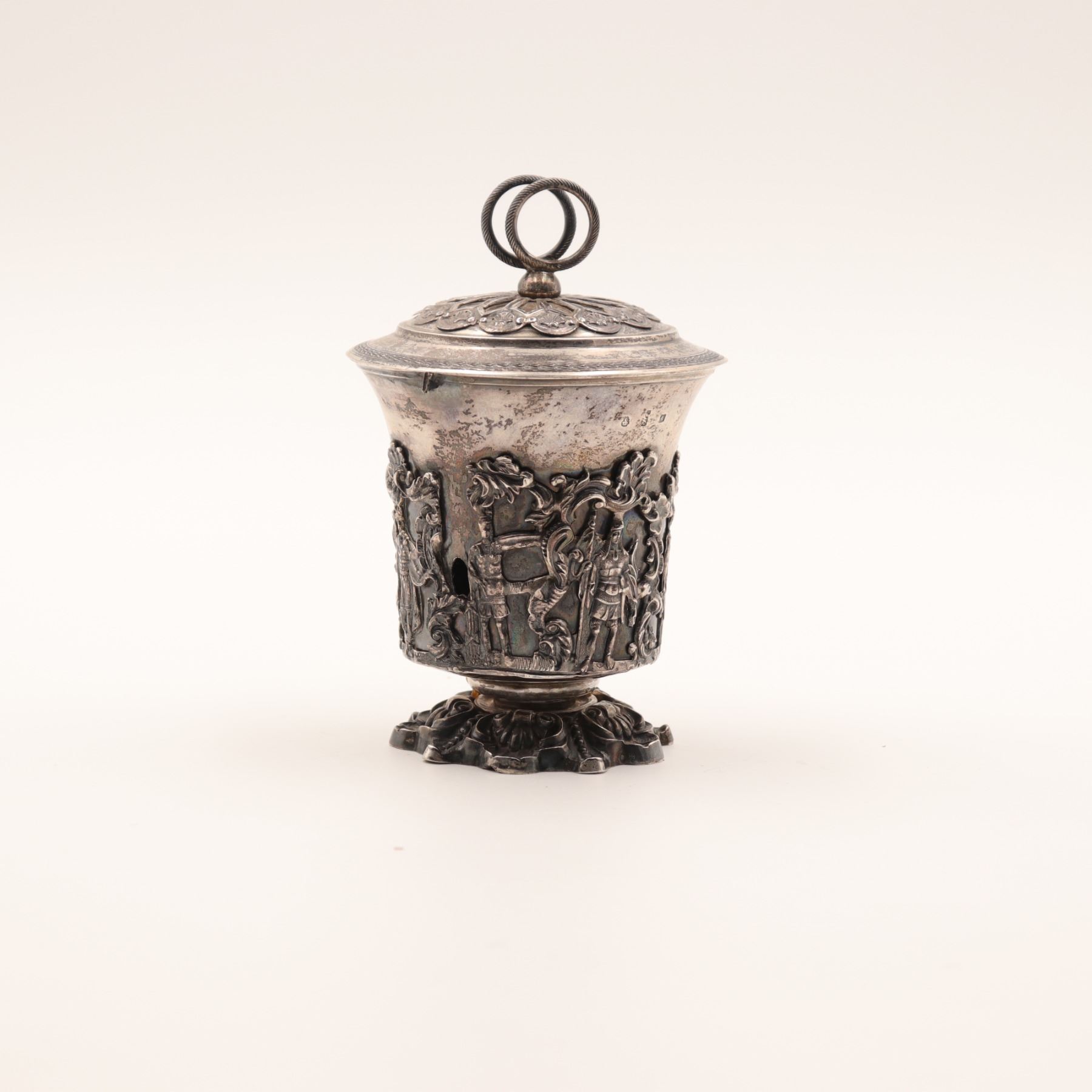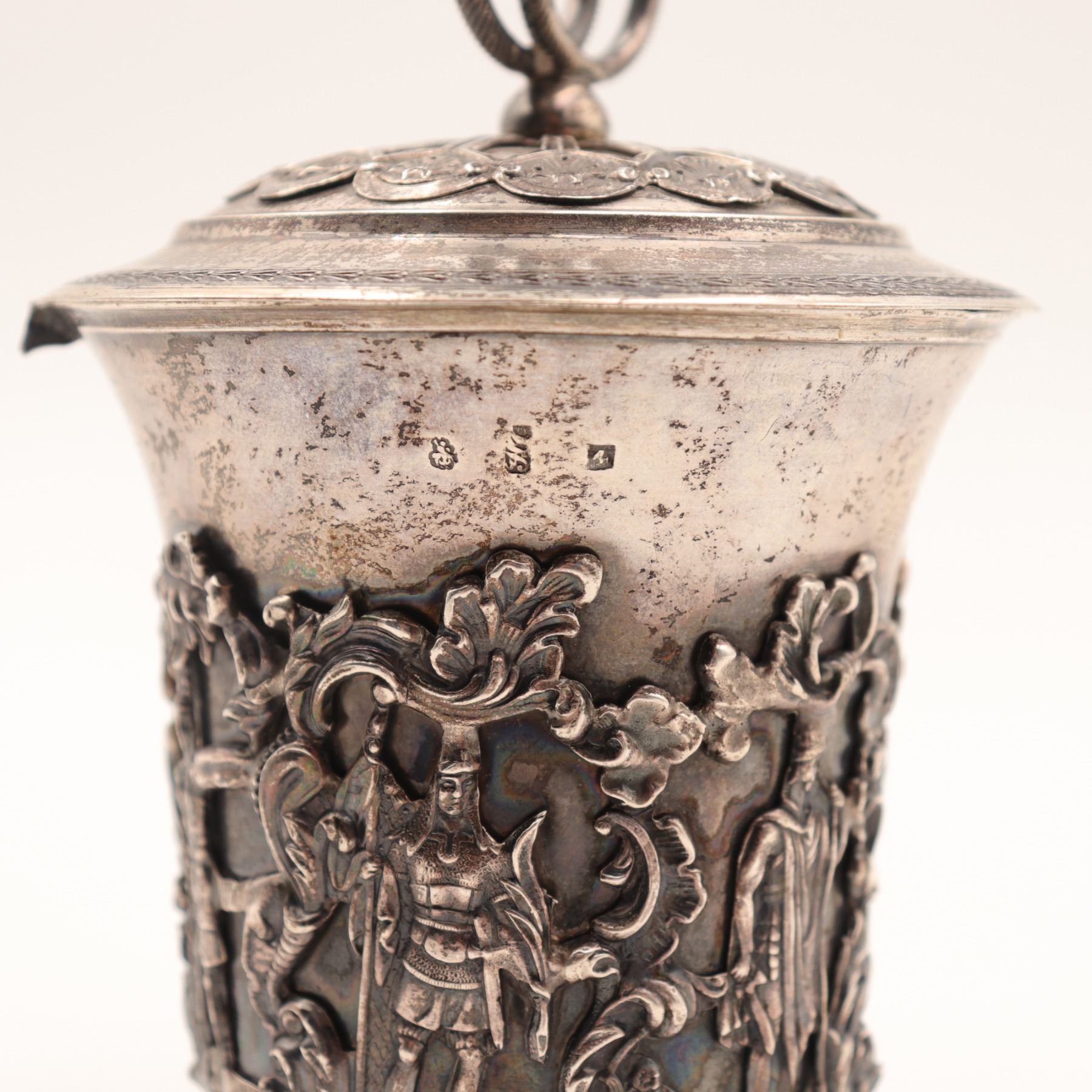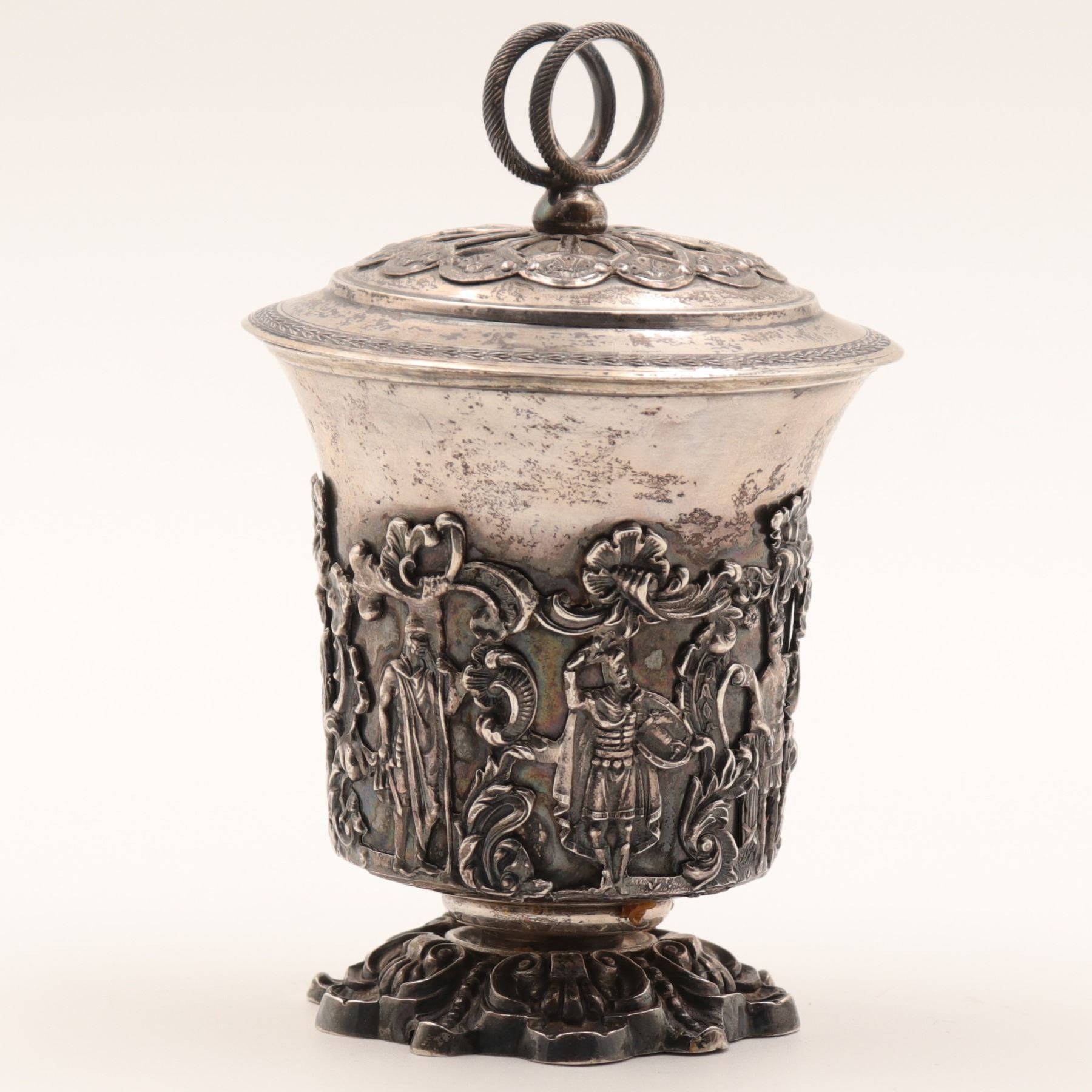 Lot 6 Russian 84 Silver Vermeil-Lined Lidded Vessel with Figural Relief, 229.32 g