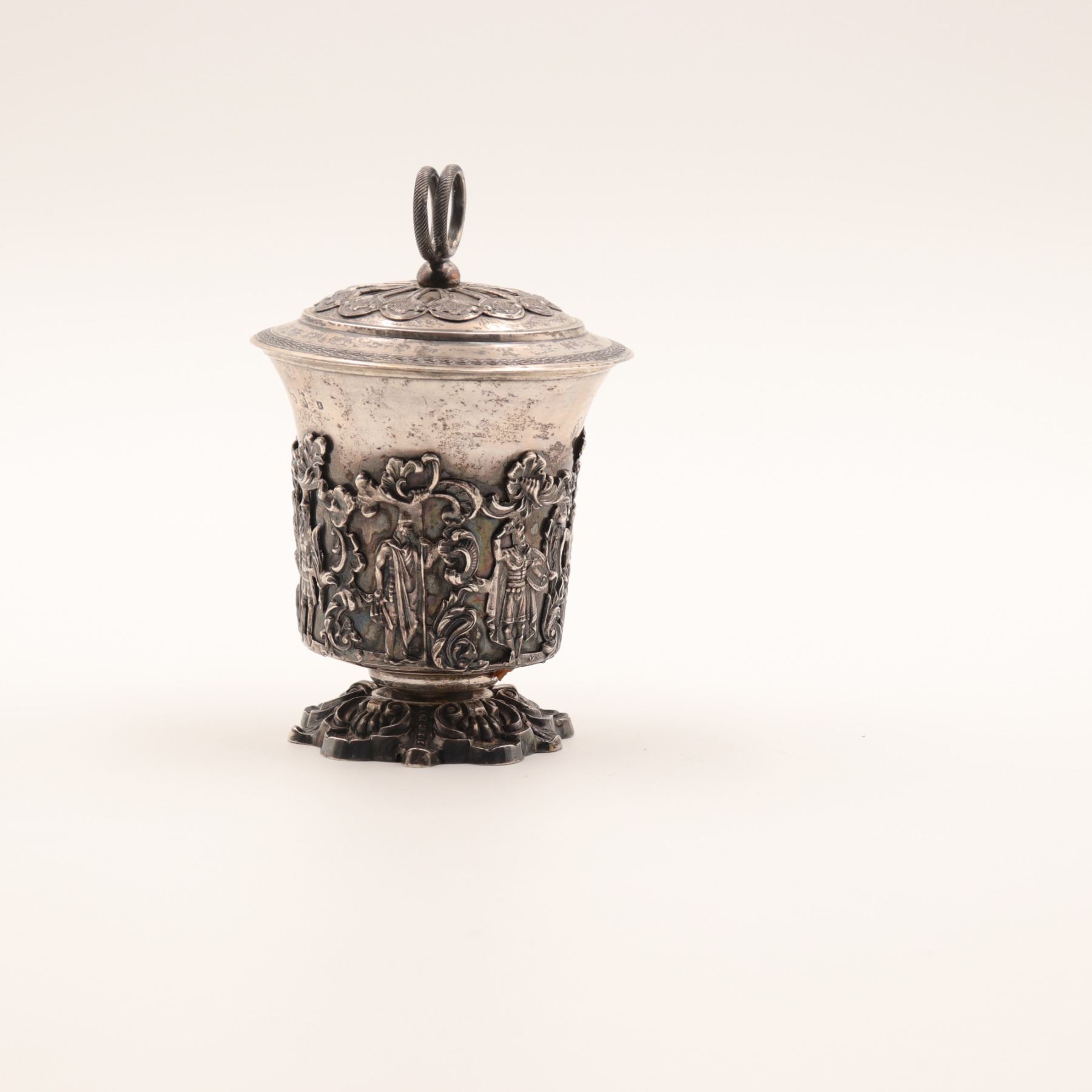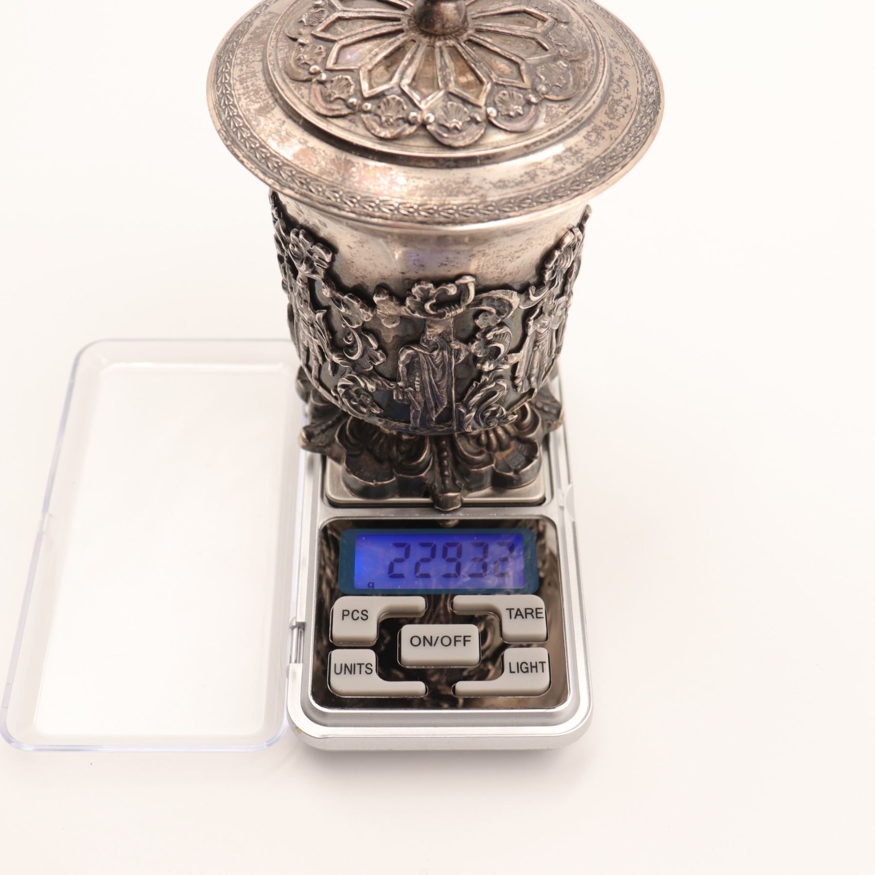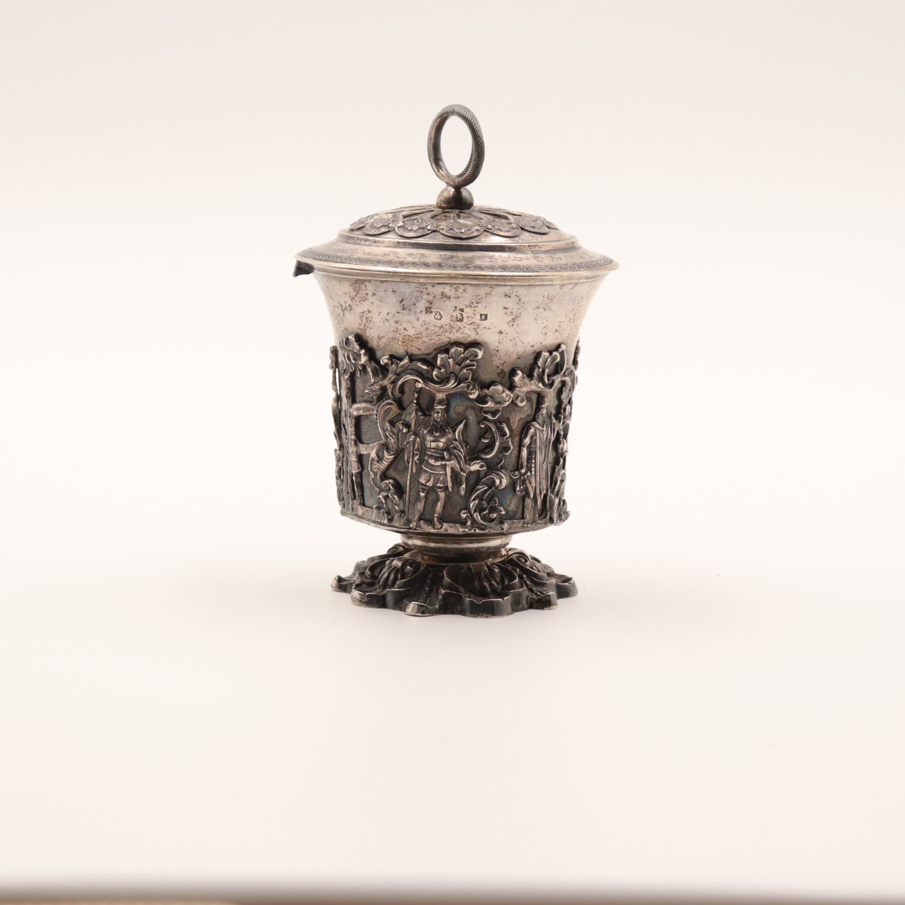 Lot 6 Russian 84 Silver Vermeil-Lined Lidded Vessel with Figural Relief, 229.32 g