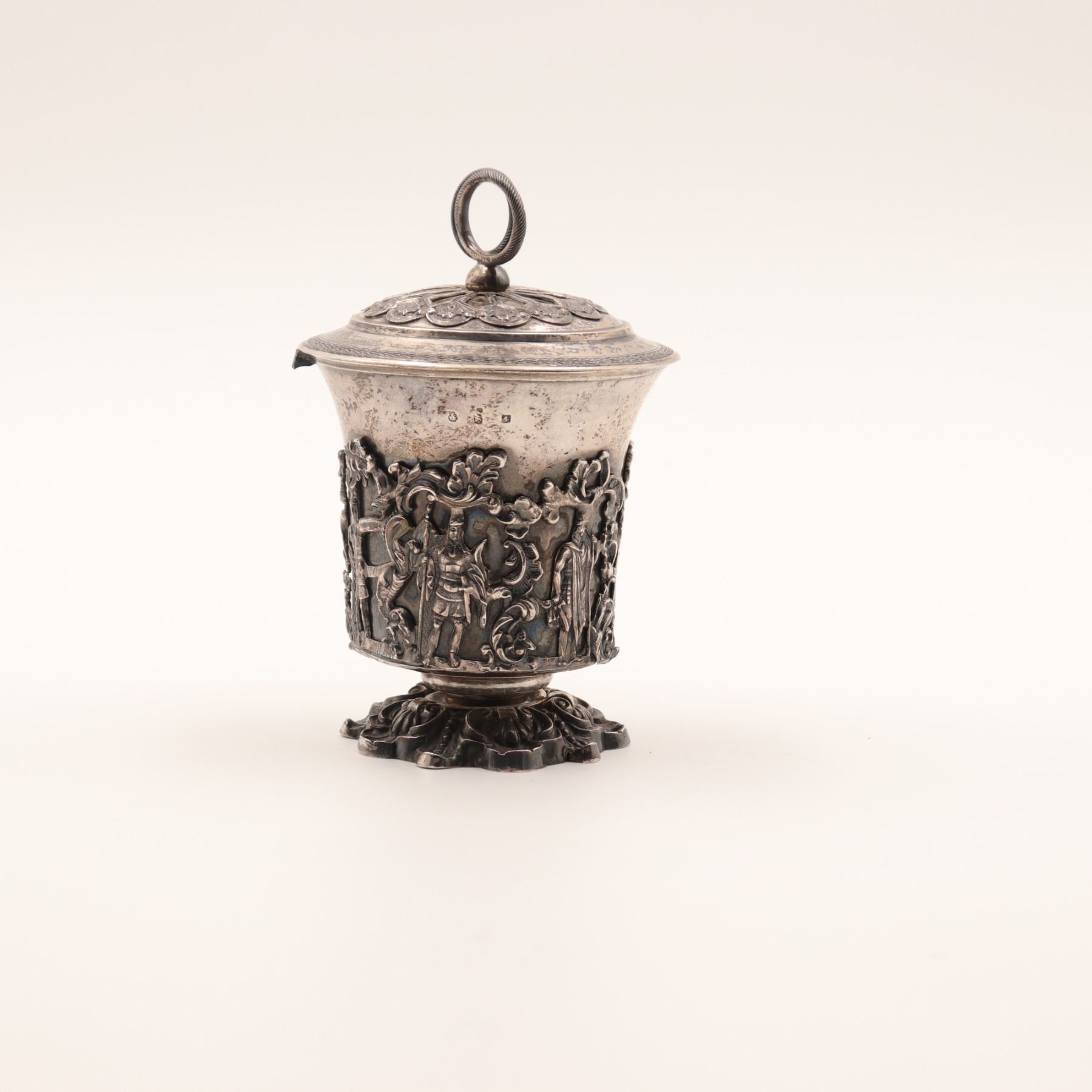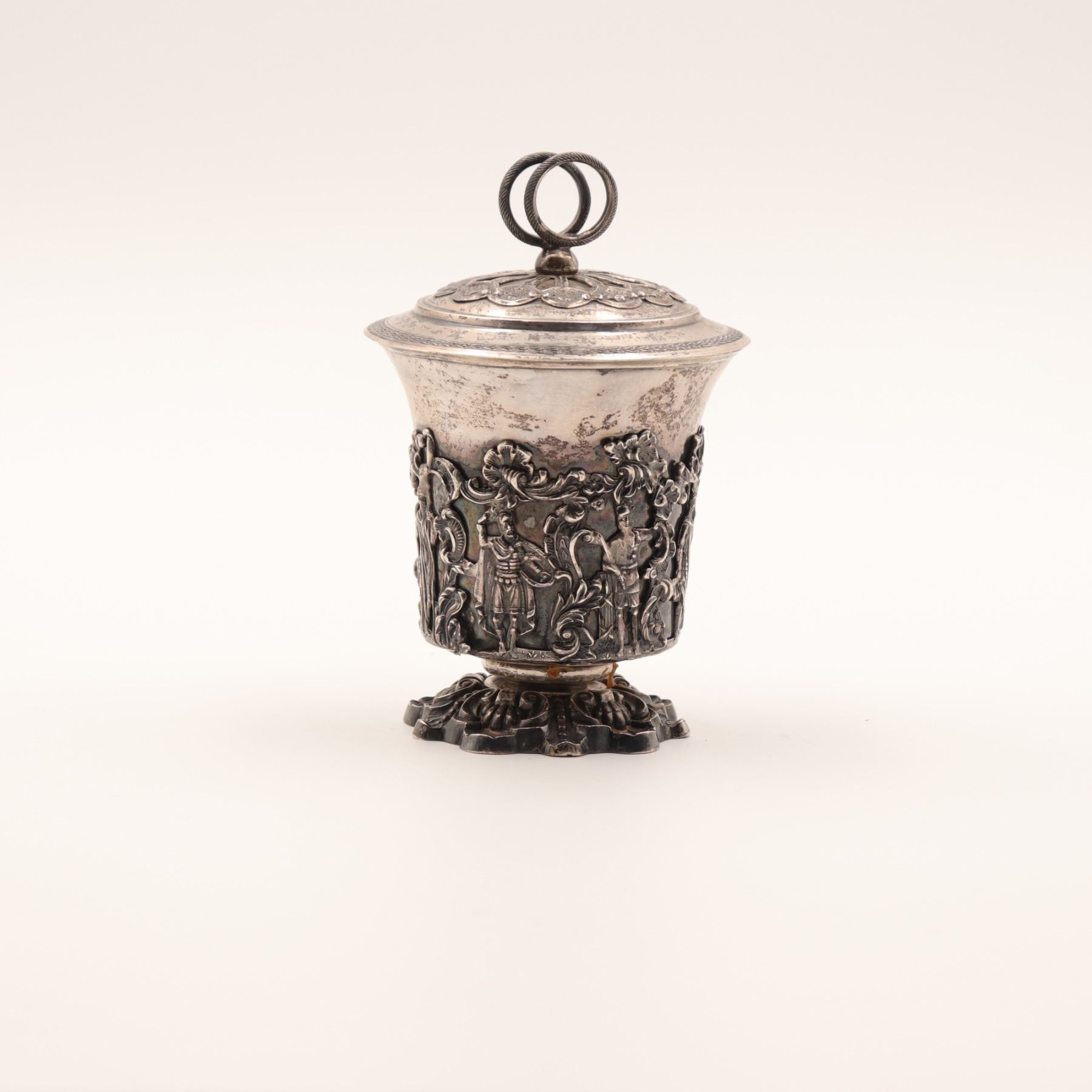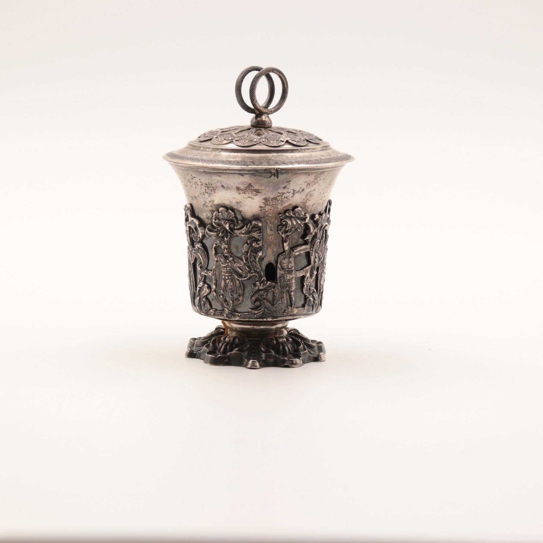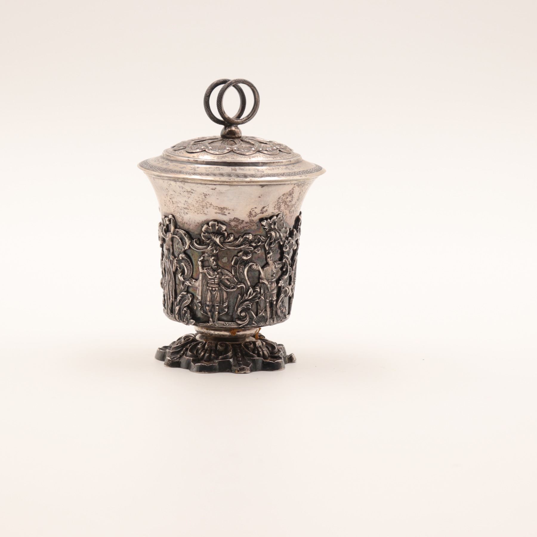 Lot 6 Russian 84 Silver Vermeil-Lined Lidded Vessel with Figural Relief, 229.32 g