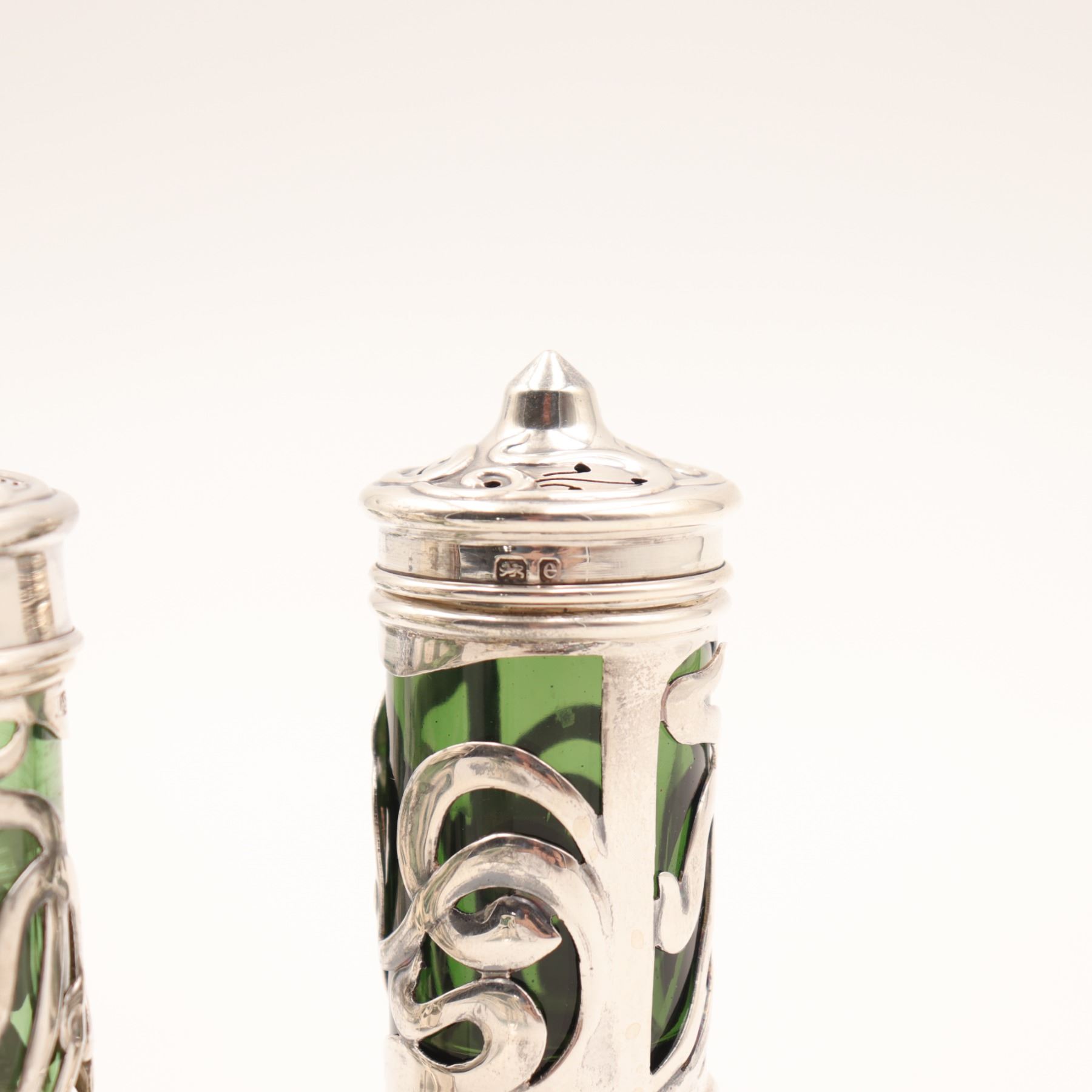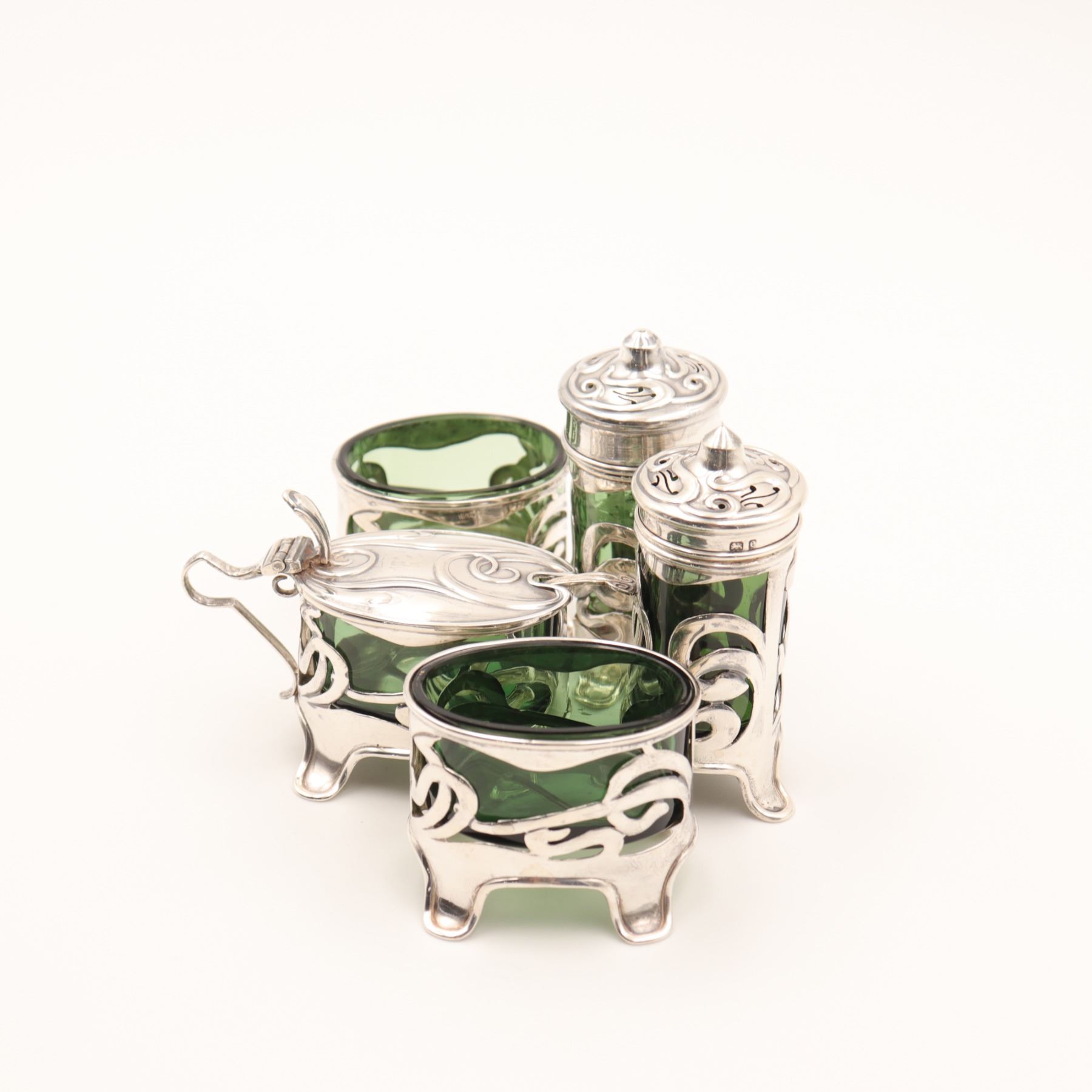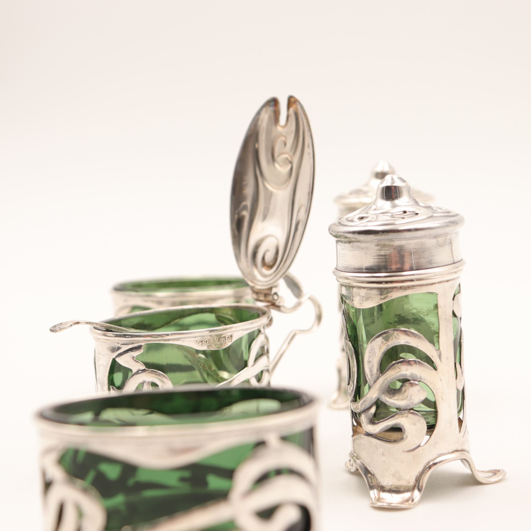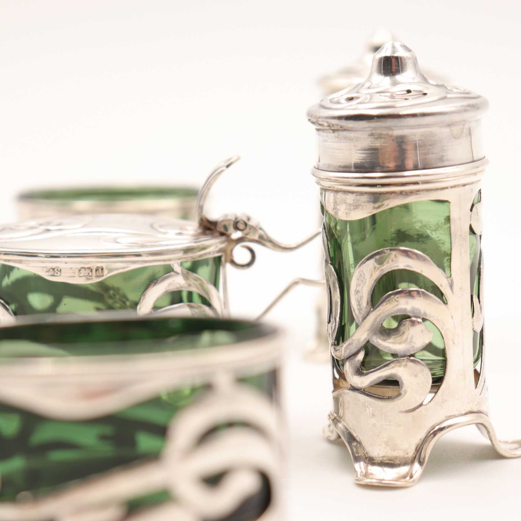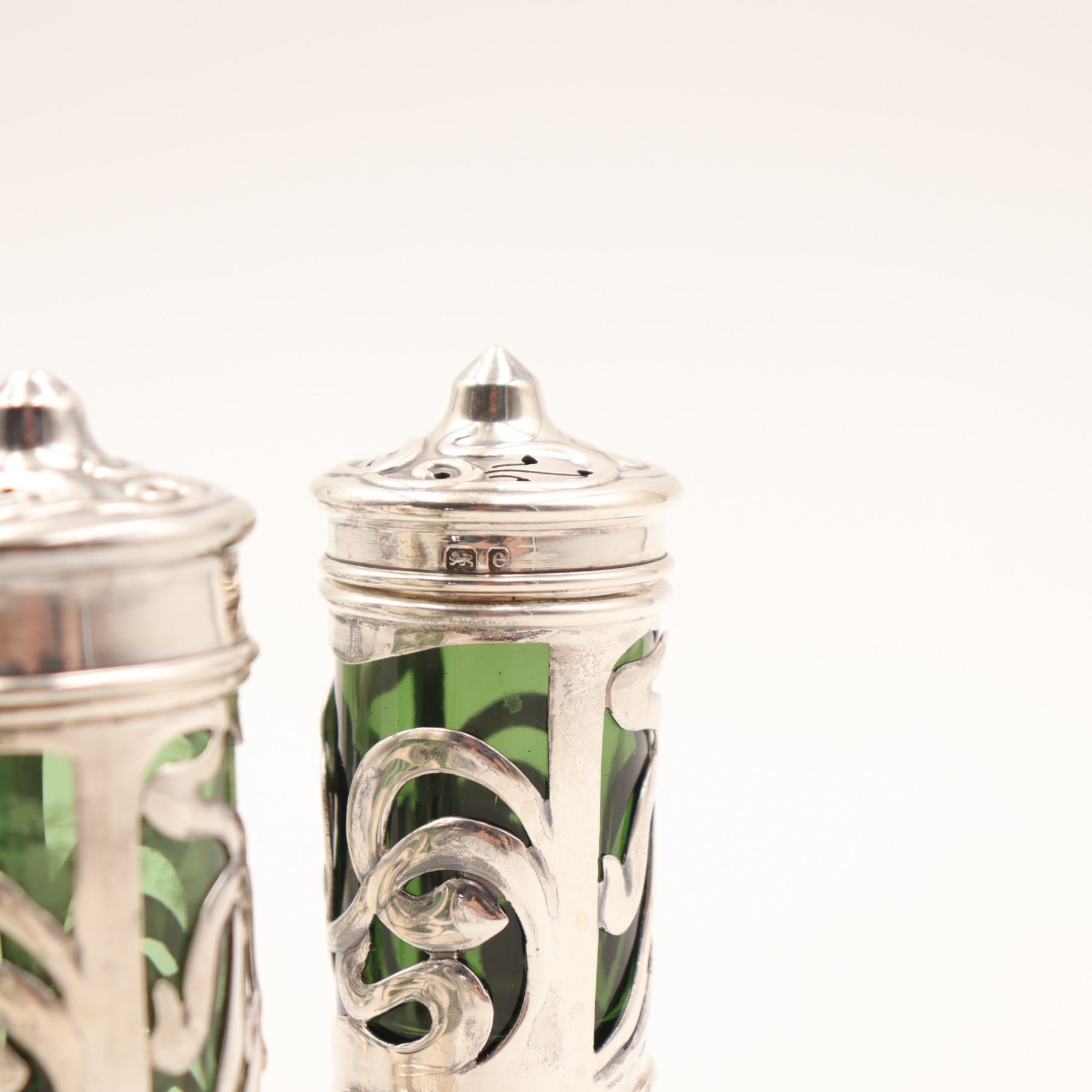 Lot 7 Levi & Salaman Art Nouveau Sterling-Mounted Green Glass Cruet Set, Birmingham 1909–1910