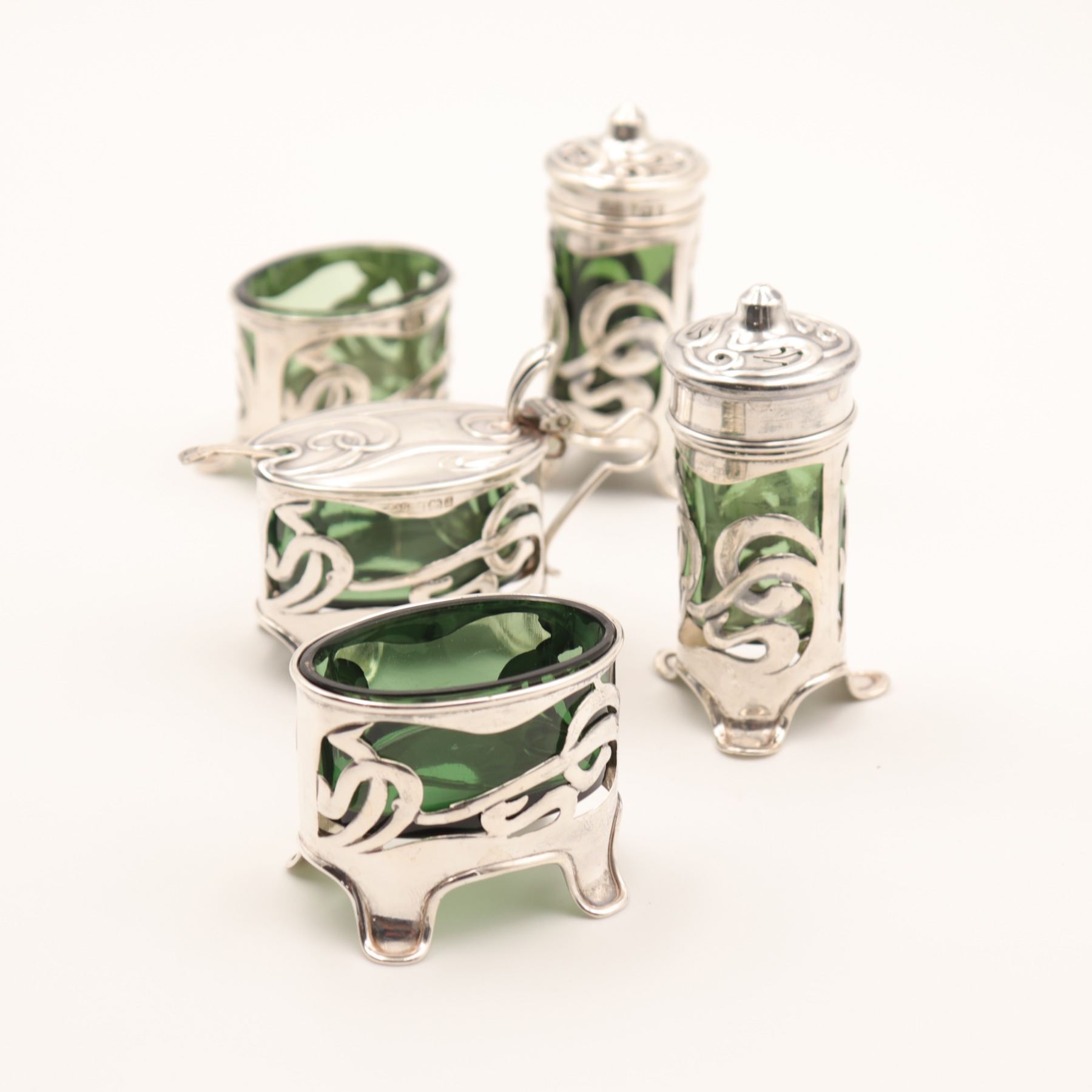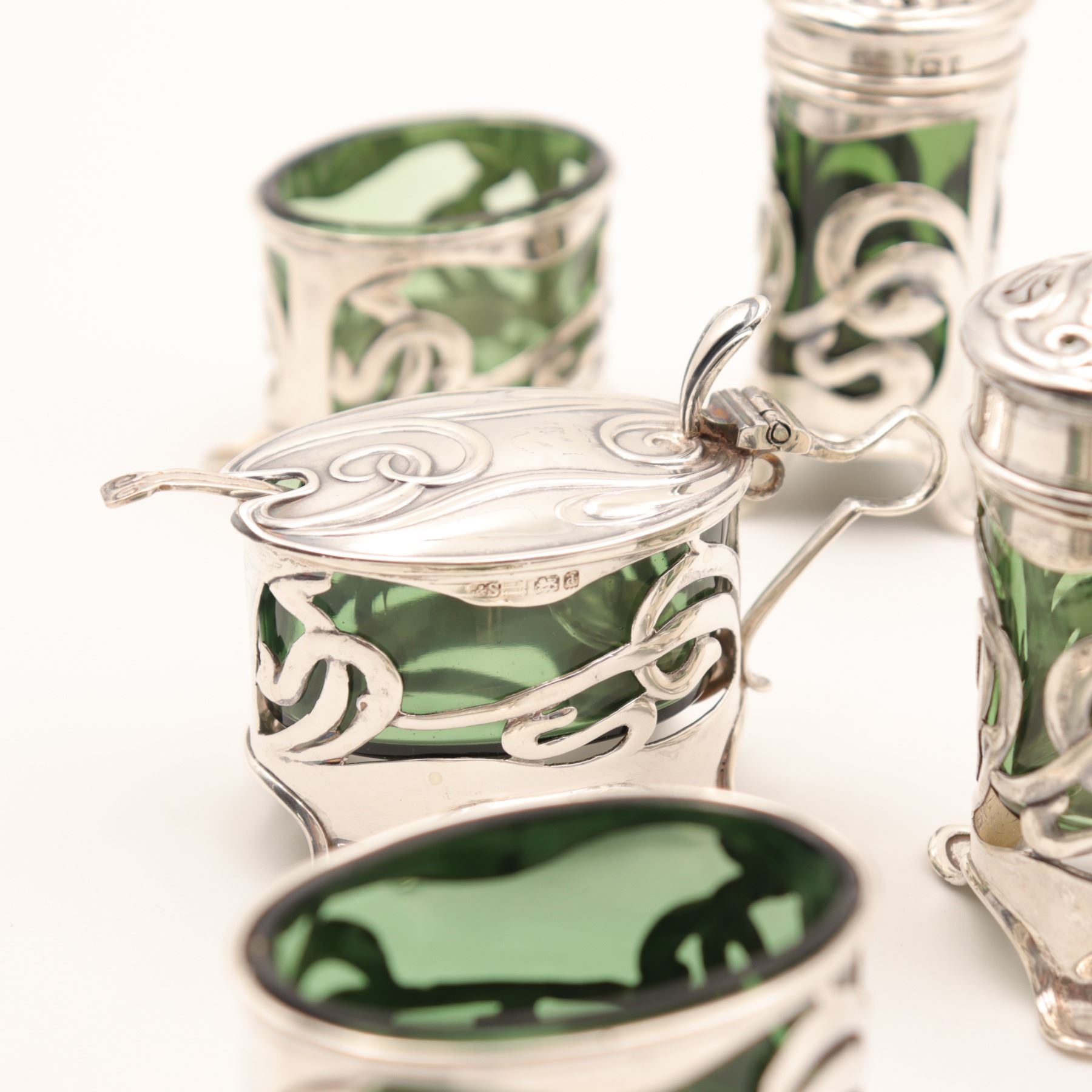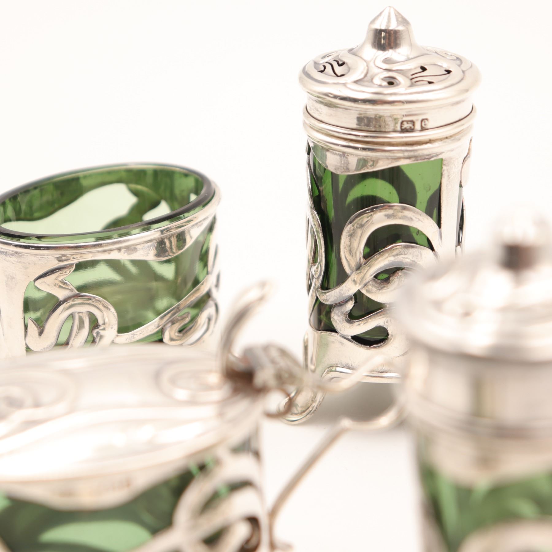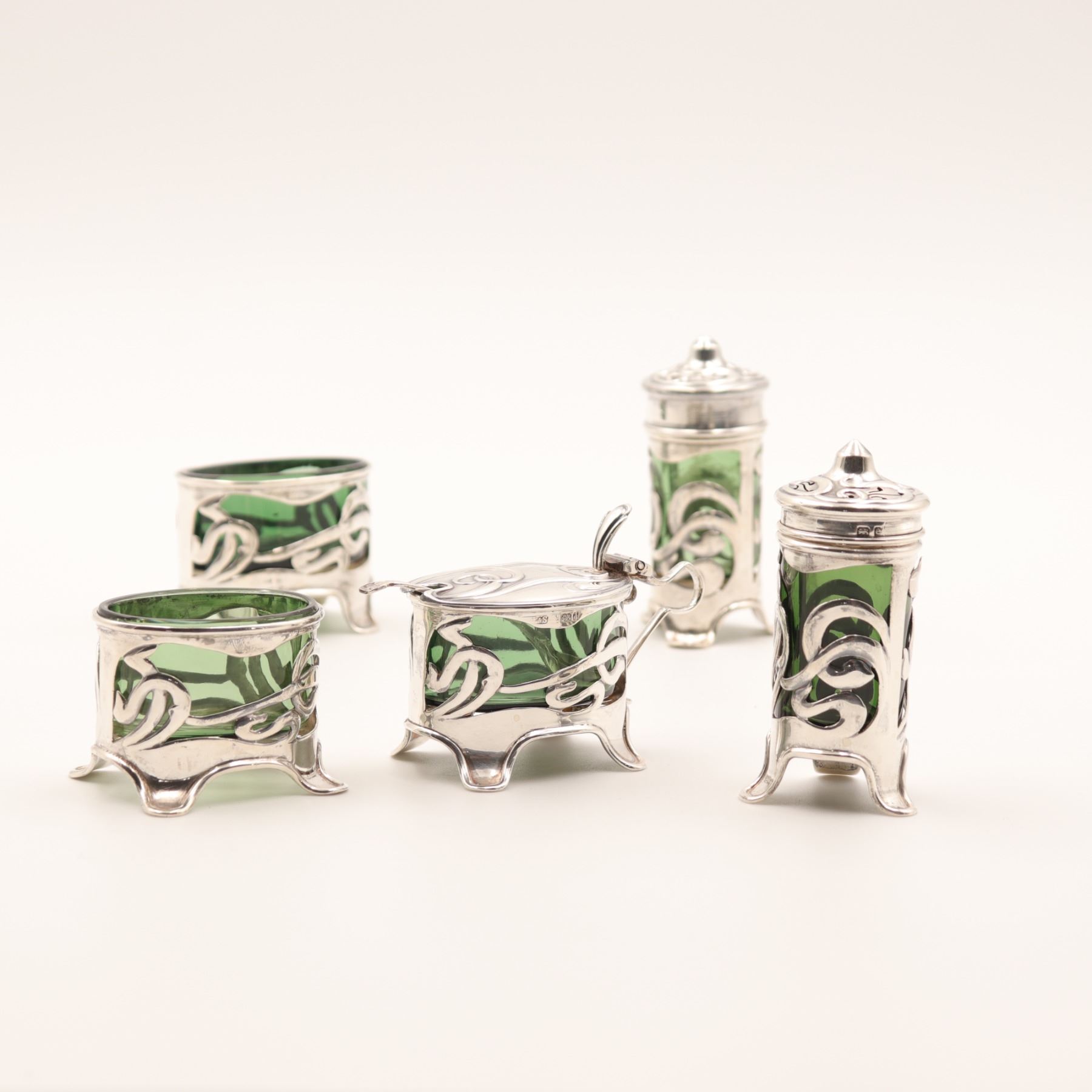 Levi & Salaman, Birmingham, 1909–1910. An Art Nouveau sterling silver-mounted cruet/condiment set comprising a pair of tall shakers, an open salt, a lidded mustard with liner, a lidded pot, and a small condiment spoon, each with green glass liners (blue liner visible to one lidded pot in photographs) within pierced scrolling silver mounts on four-footed bases; fully hallmarked throughout. Silver weight (mounts) approximately 146 grams as shown.