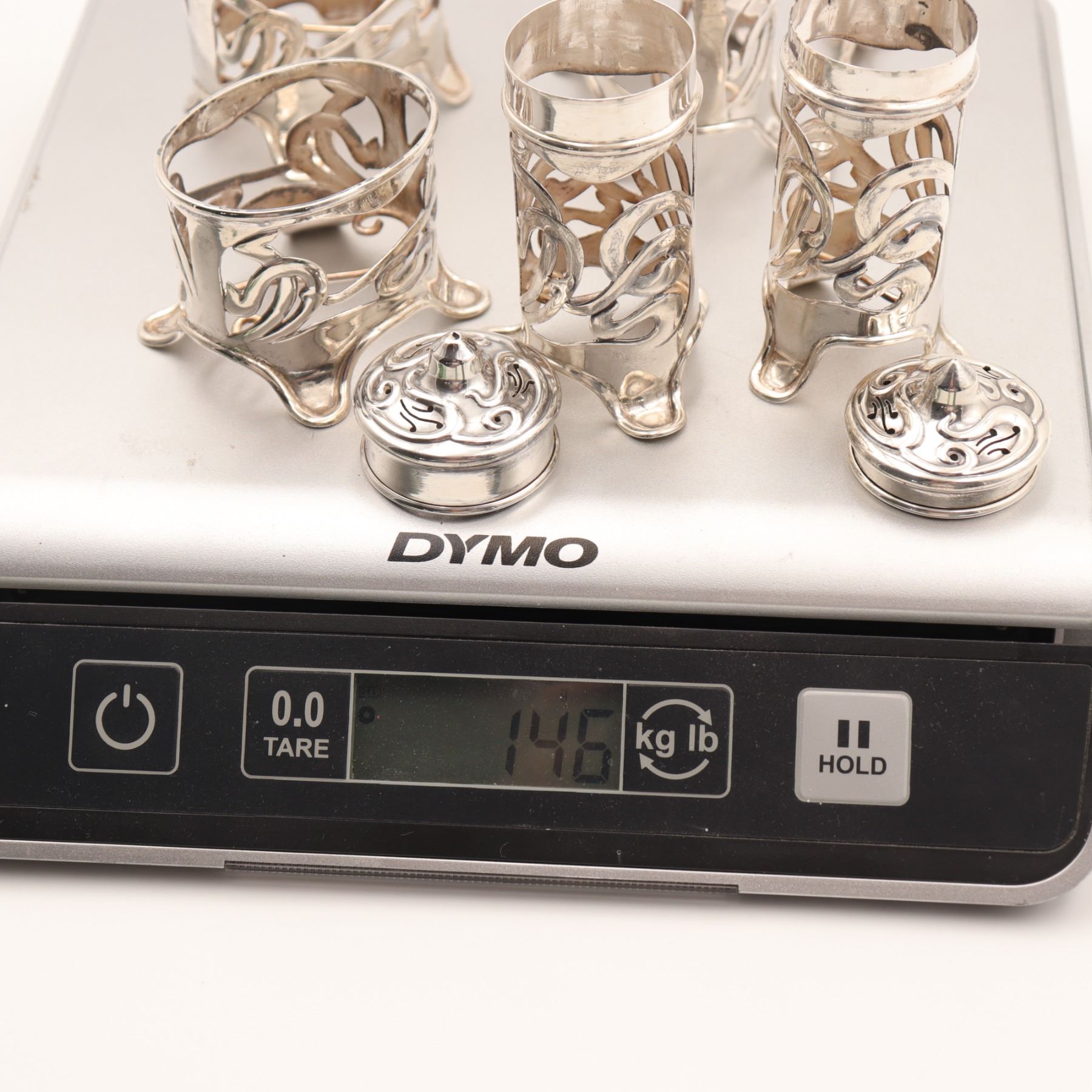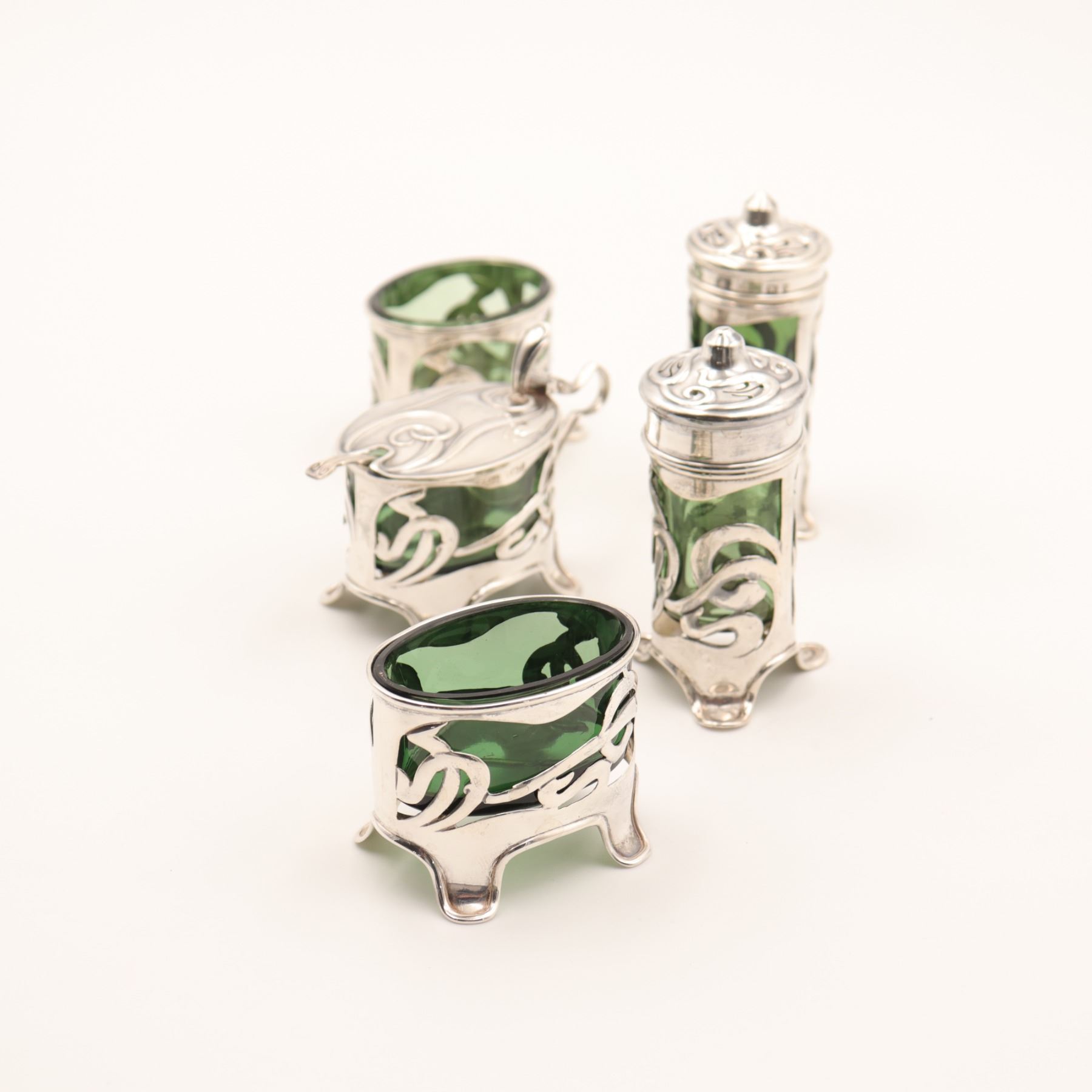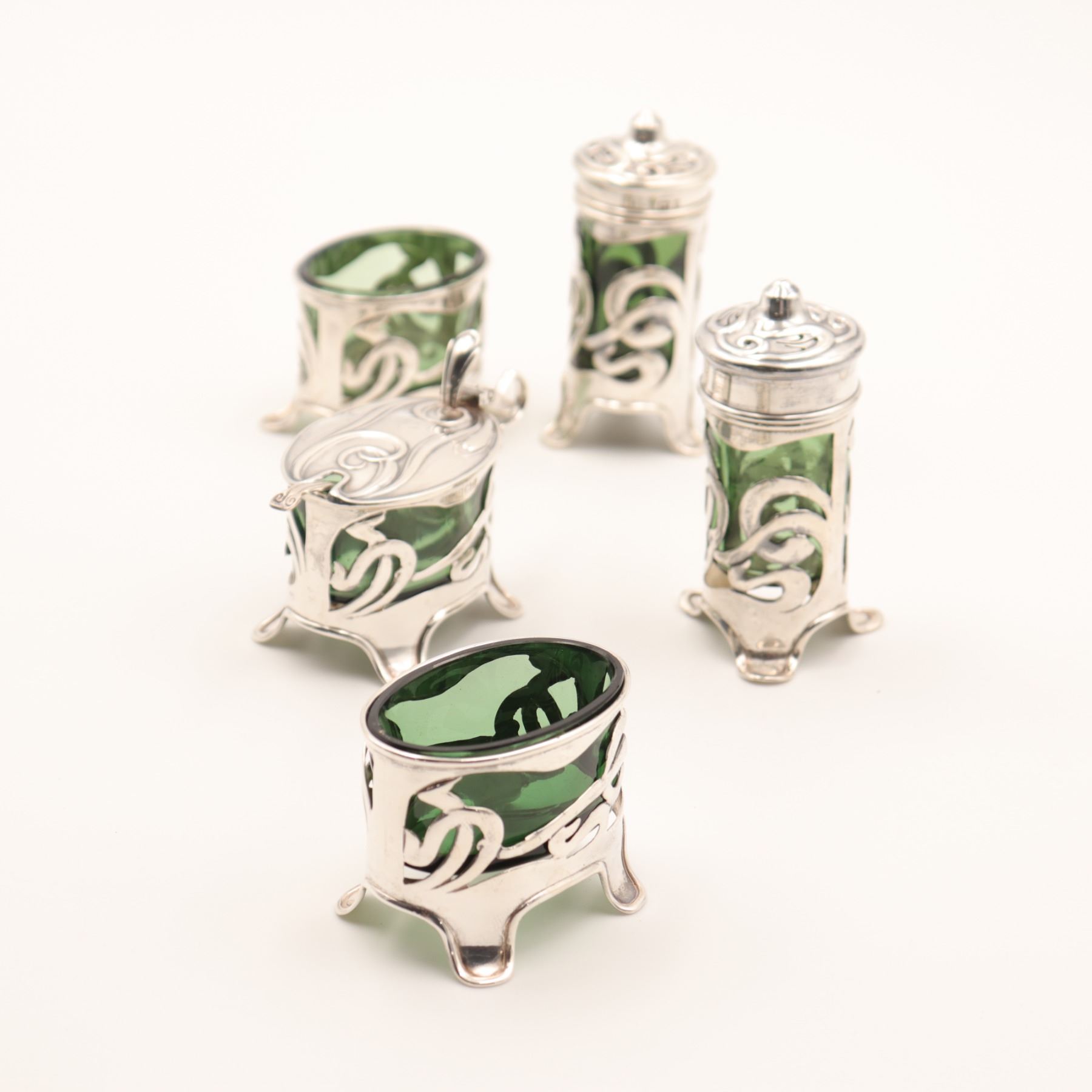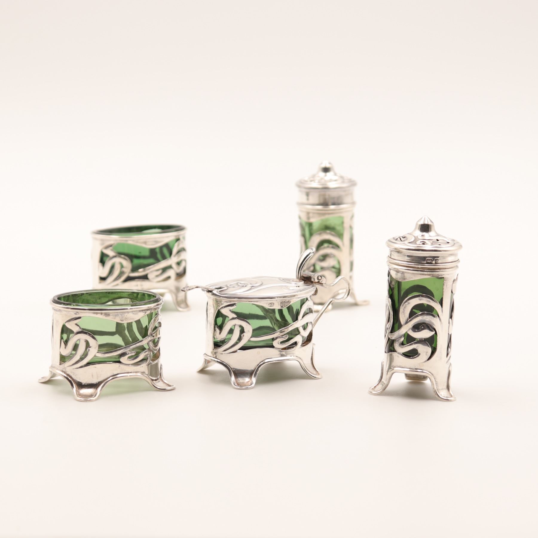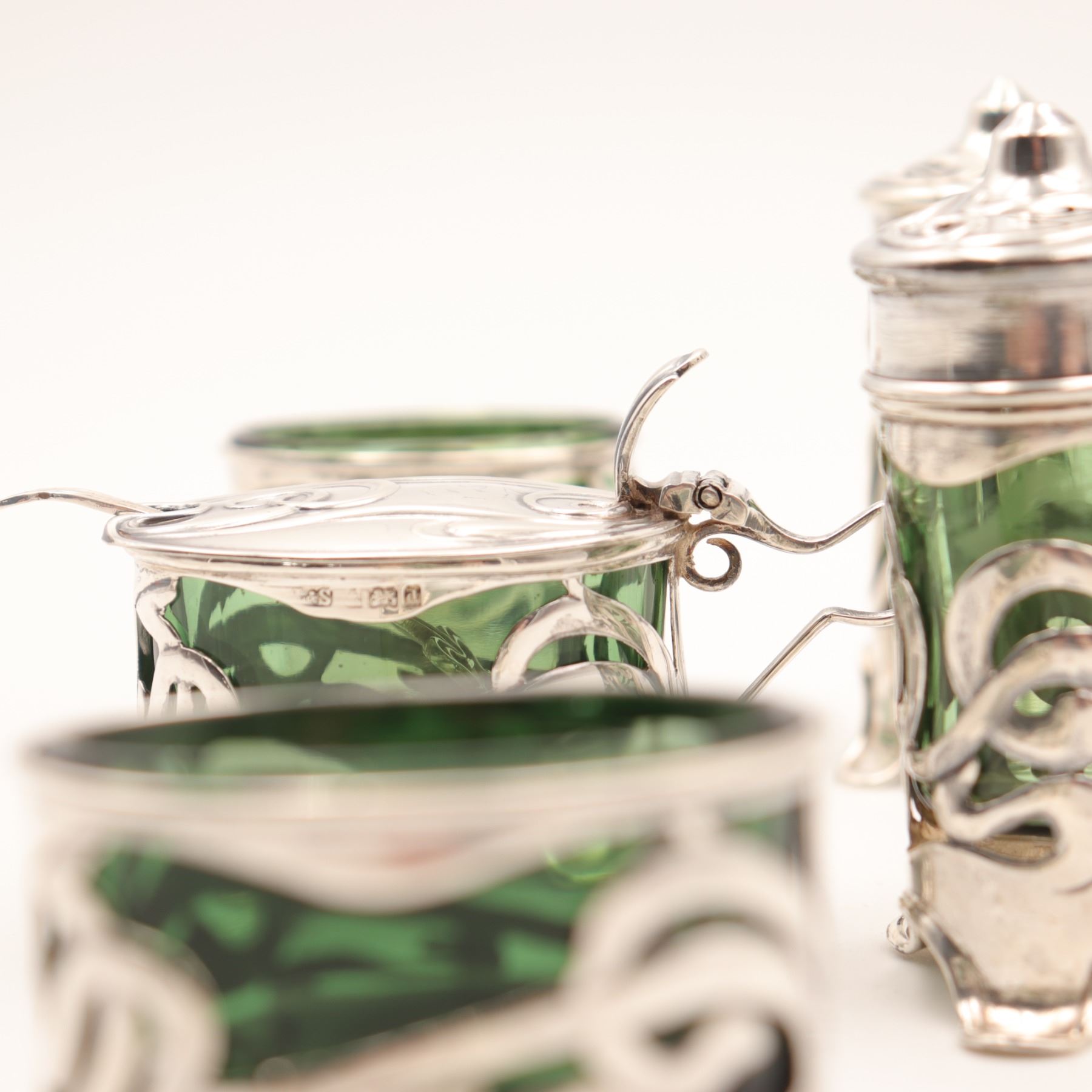 Levi & Salaman, Birmingham, 1909–1910. An Art Nouveau sterling silver-mounted cruet/condiment set comprising a pair of tall shakers, an open salt, a lidded mustard with liner, a lidded pot, and a small condiment spoon, each with green glass liners (blue liner visible to one lidded pot in photographs) within pierced scrolling silver mounts on four-footed bases; fully hallmarked throughout. Silver weight (mounts) approximately 146 grams as shown.