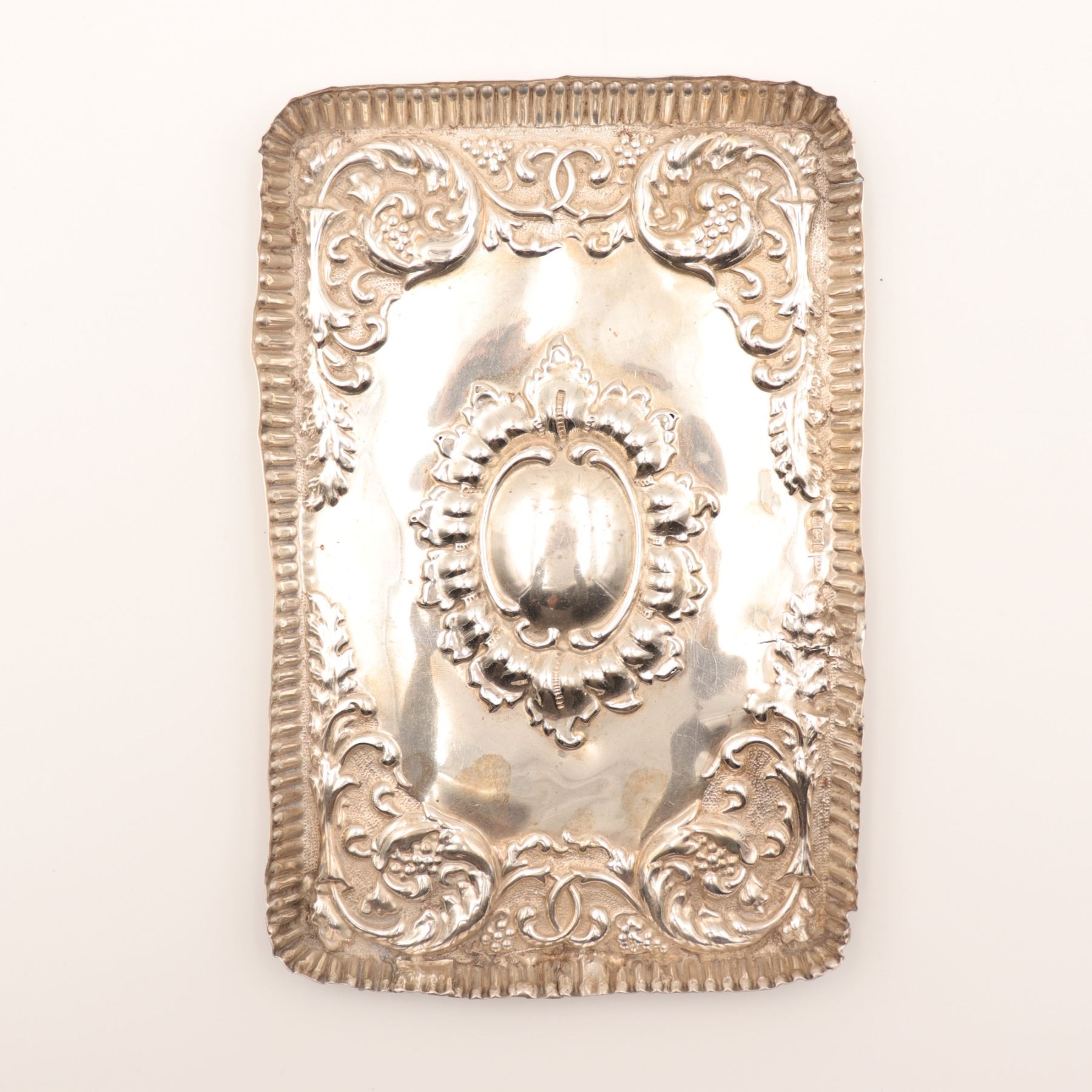 English sterling silver card tray by Walker & Hall, Sheffield, of rectangular form with canted corners, reeded border, repoussé Rococo Revival corner ornament, and raised central oval cartouche boss. The tray bears a British hallmark group including Sheffield crown, lion passant sterling mark, date letter, and Walker & Hall pennant-form maker’s mark. Early 20th century. A useful and decorative small tray with good desk or table presence. Visible with general polishing wear, surface scratching, spotting, and minor rim waviness consistent with age and use.