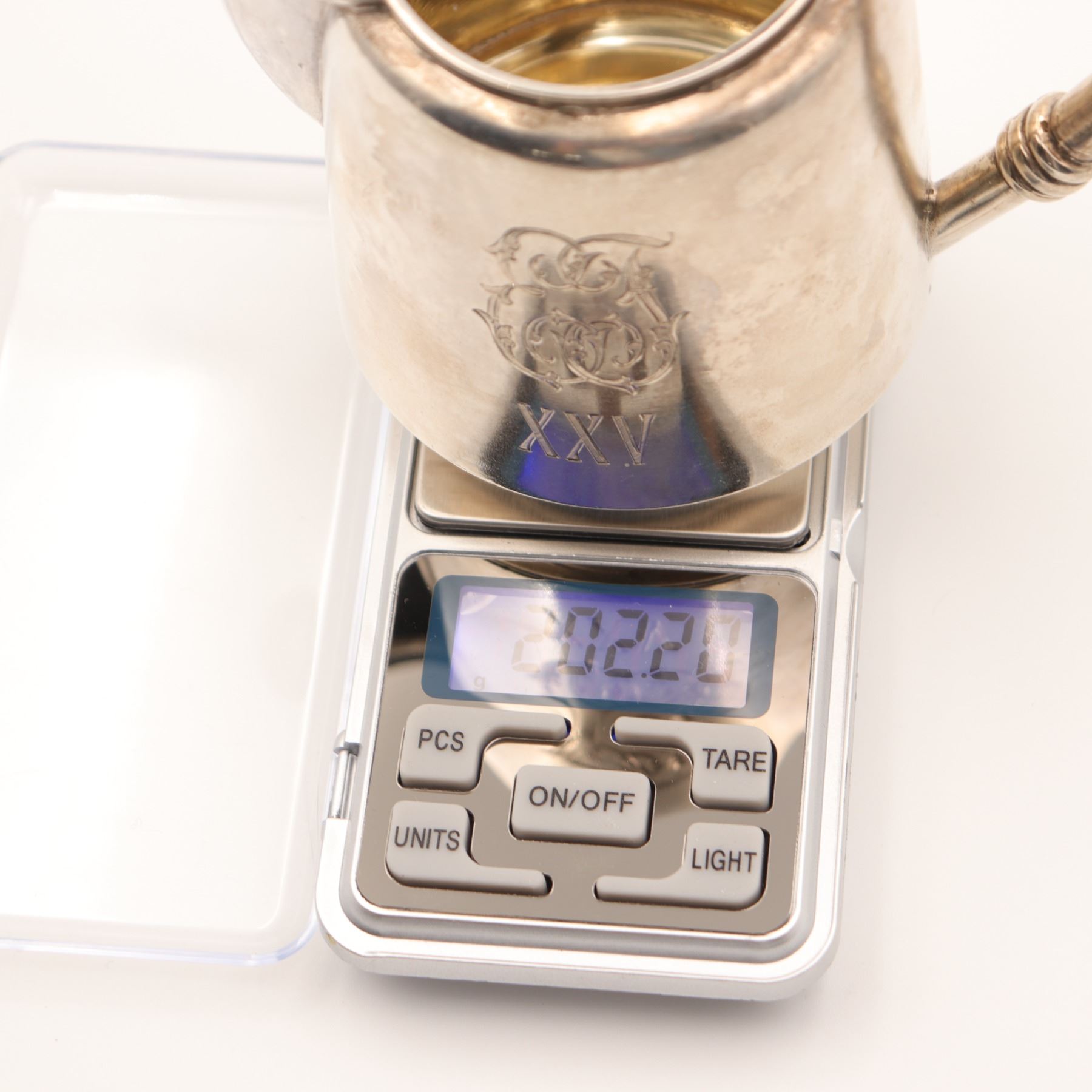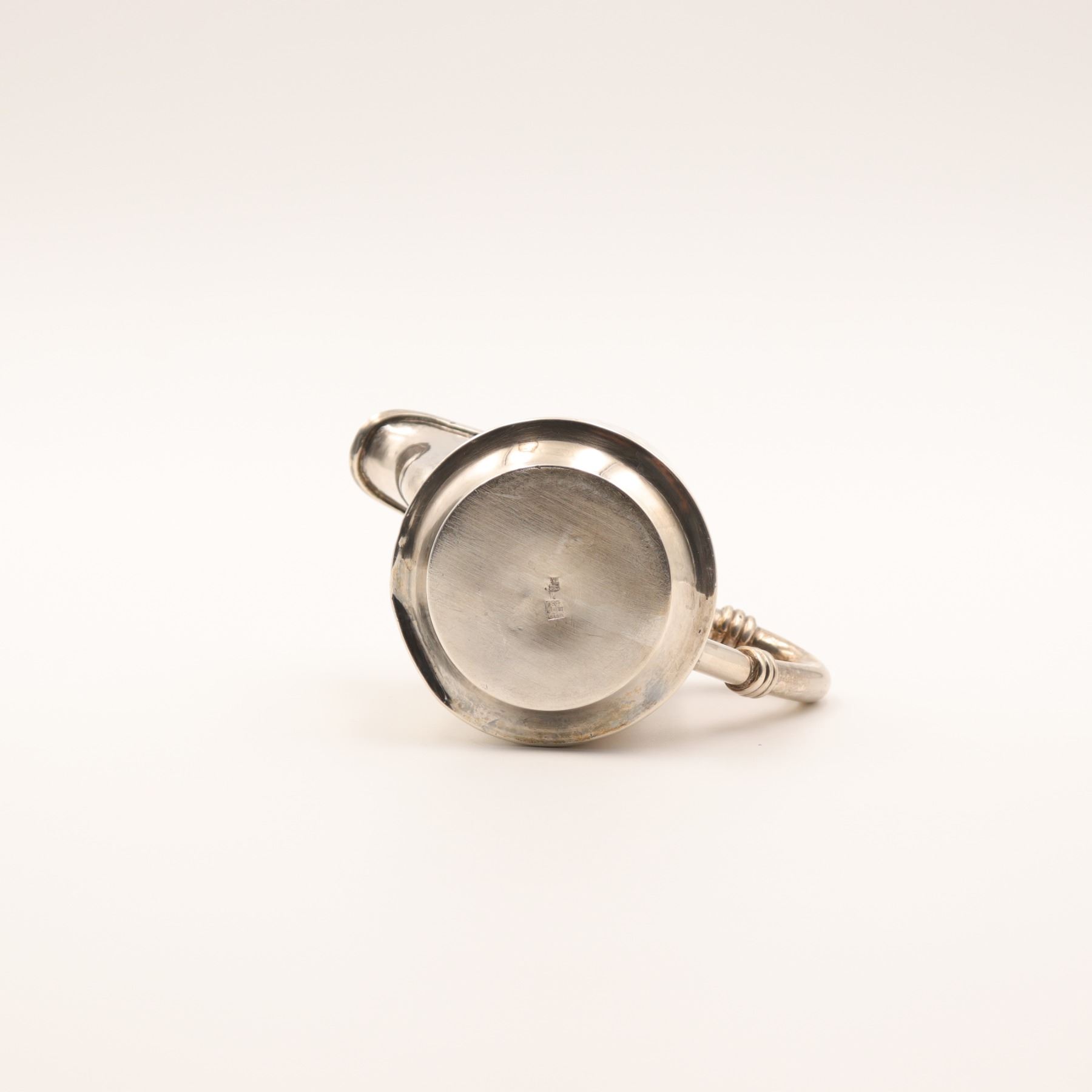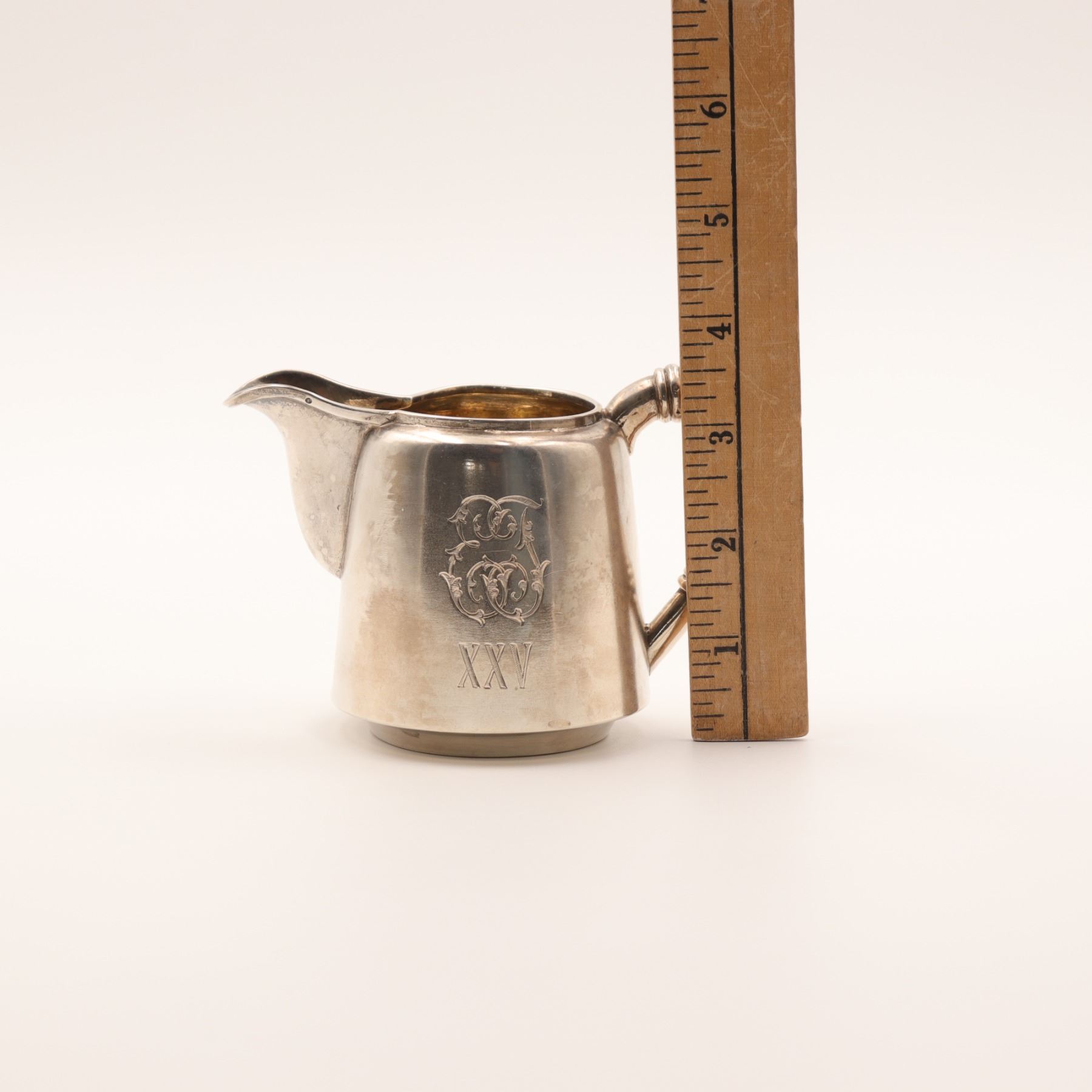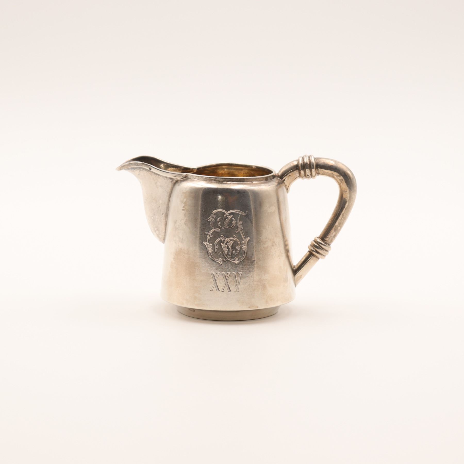 Russian silver creamer, 84 standard, with applied handle and pouring lip; engraved monogram and Roman numerals “XXV” to body. Stamped with Russian silver marks to underside. Gross weight approximately 202.20 grams.