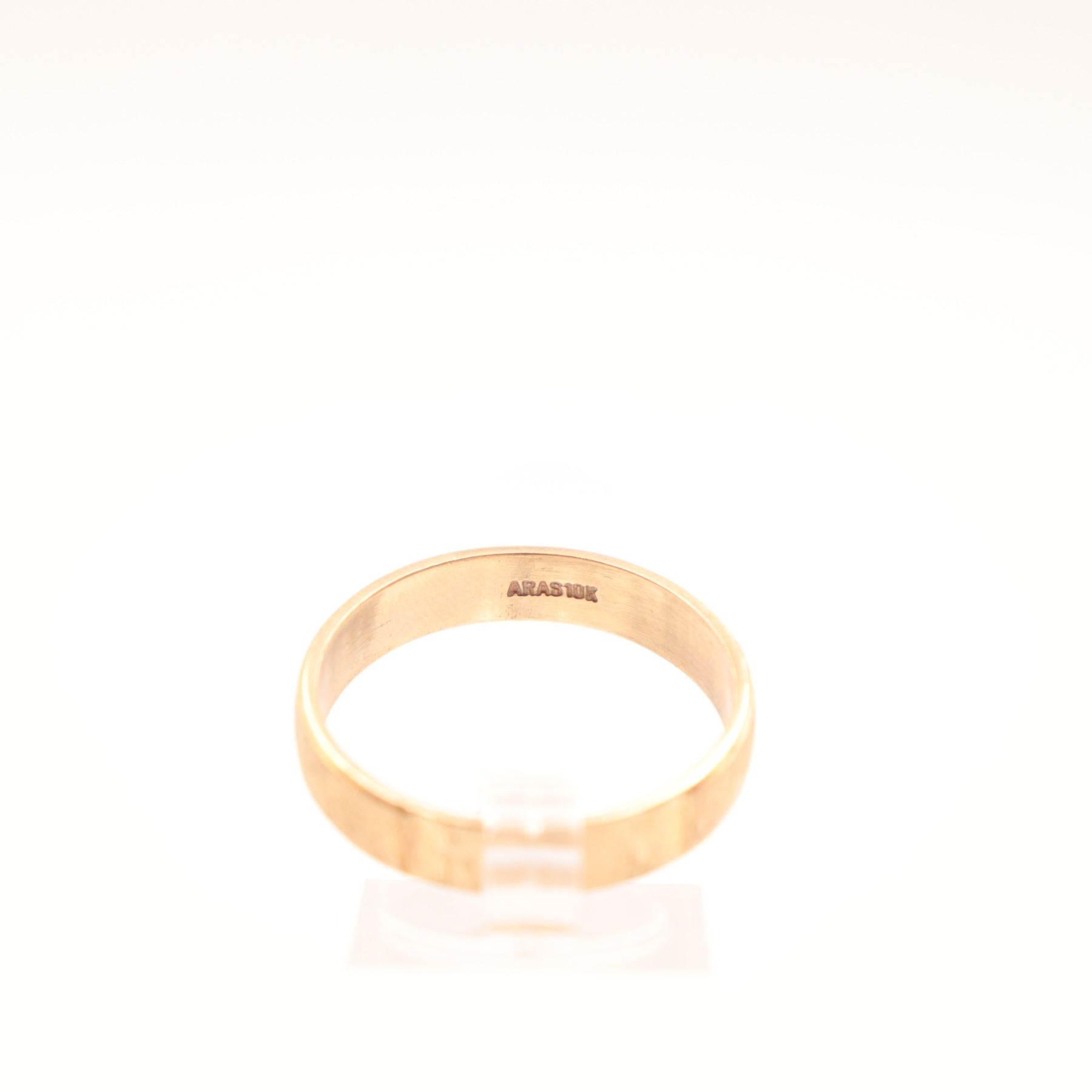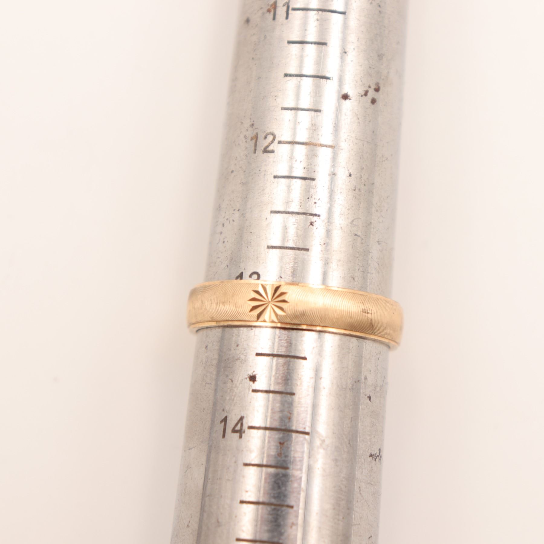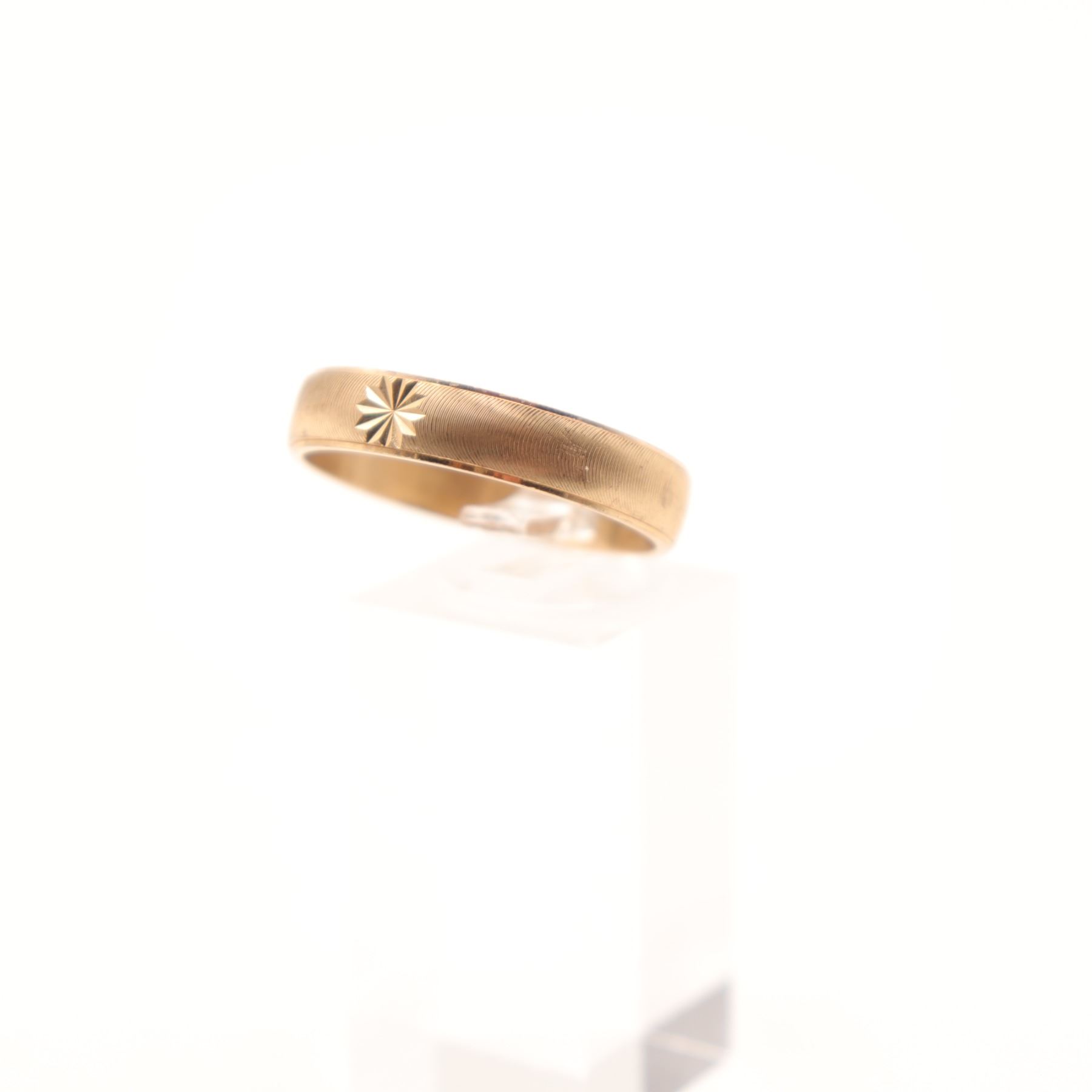 Men’s 10K yellow gold band ring, marked ARAS 10K to the interior. The ring is designed with a finely textured exterior and centered with a cut starburst motif to the front, giving the otherwise clean band a subtle decorative accent. Plain polished interior.