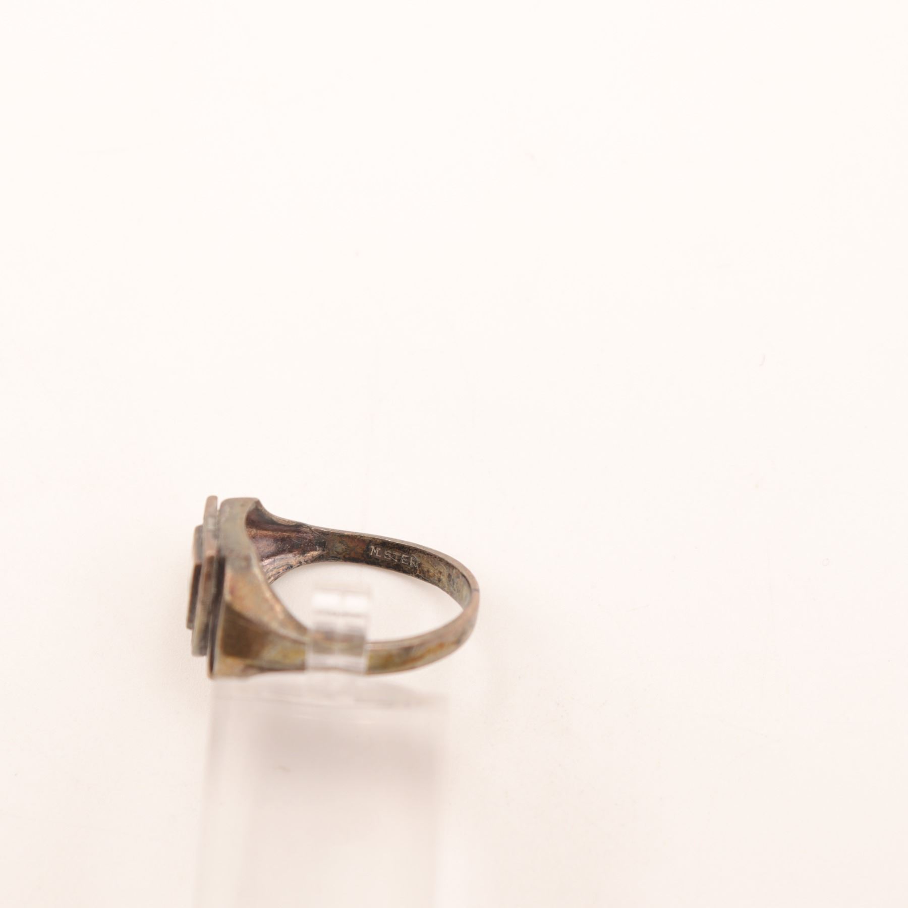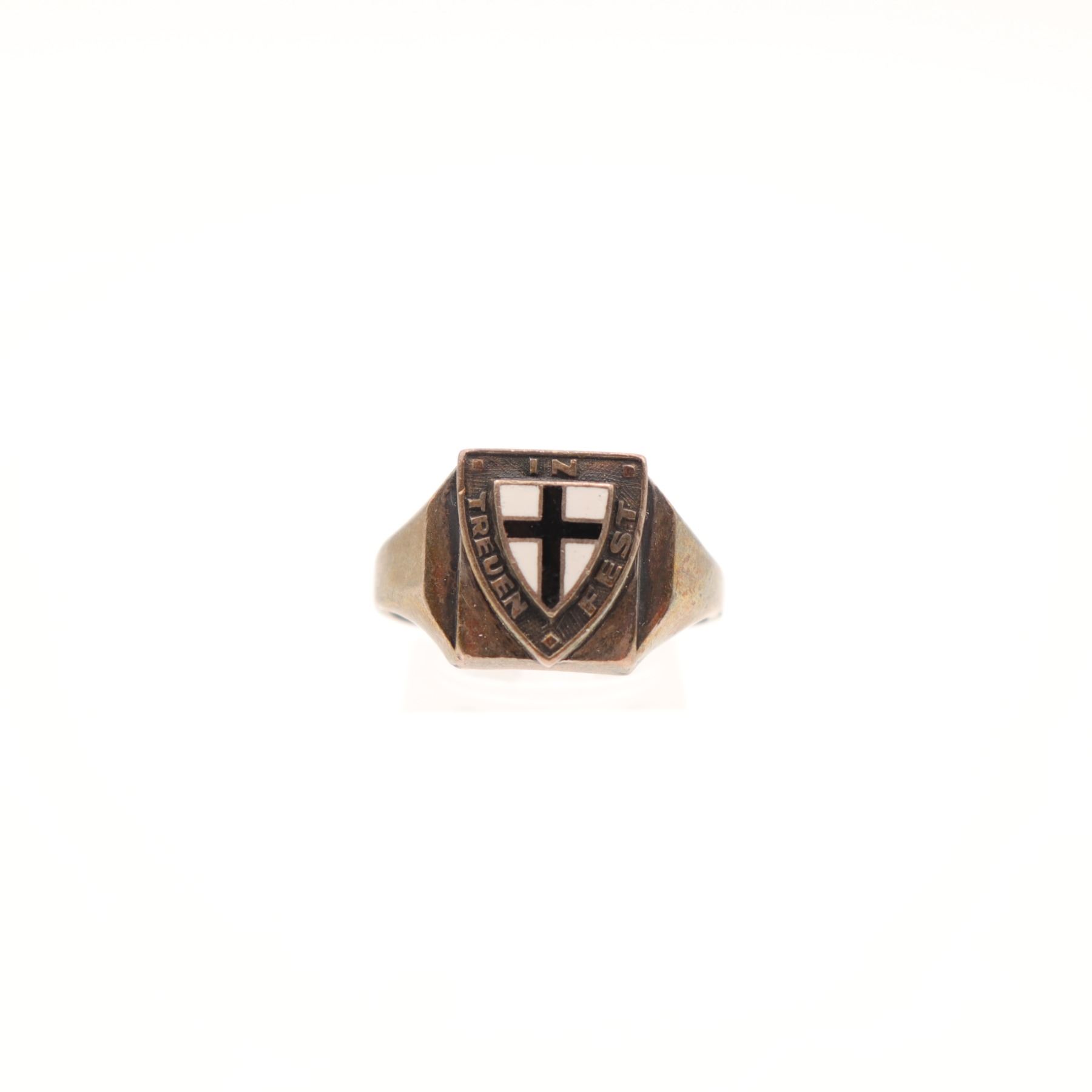 Signet-style ring with a rectangular stepped bezel, centered by a shield bearing a black cross on a white ground and encircled by the inscription “IN TREUEN FEST.” The interior is stamped M. STER. Based on the motto, this ring is best catalogued as a probable Baltic German association or identity ring, as “In Treuen fest” is documented as a Baltic German motto and is specifically associated with Fraternitas Baltica of Riga. The black cross on white also strongly recalls the emblematic colors of the Teutonic Order. This combination suggests a piece tied to Baltic German historical or cultural identity rather than an ordinary decorative signet alone.