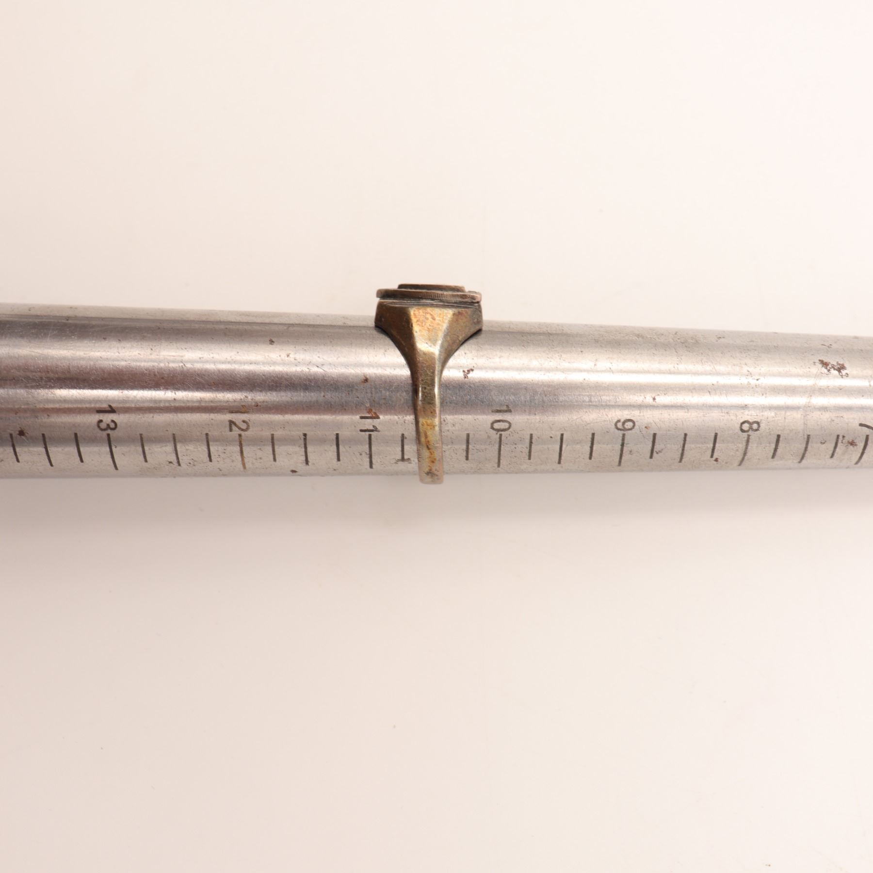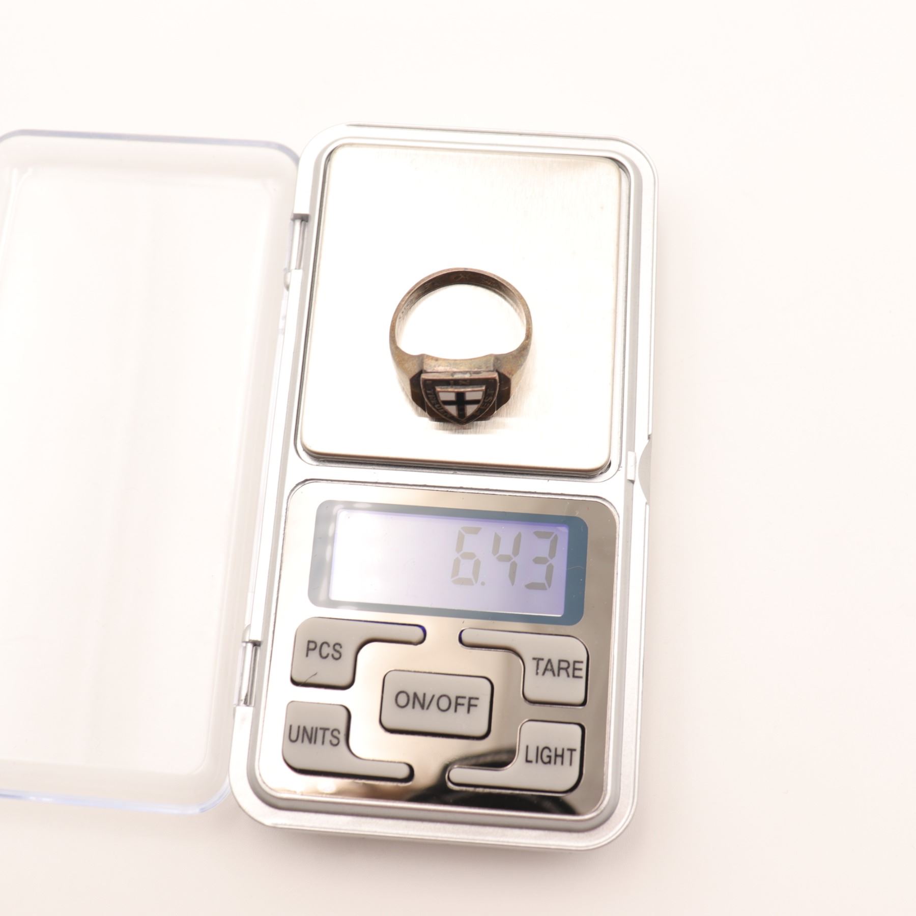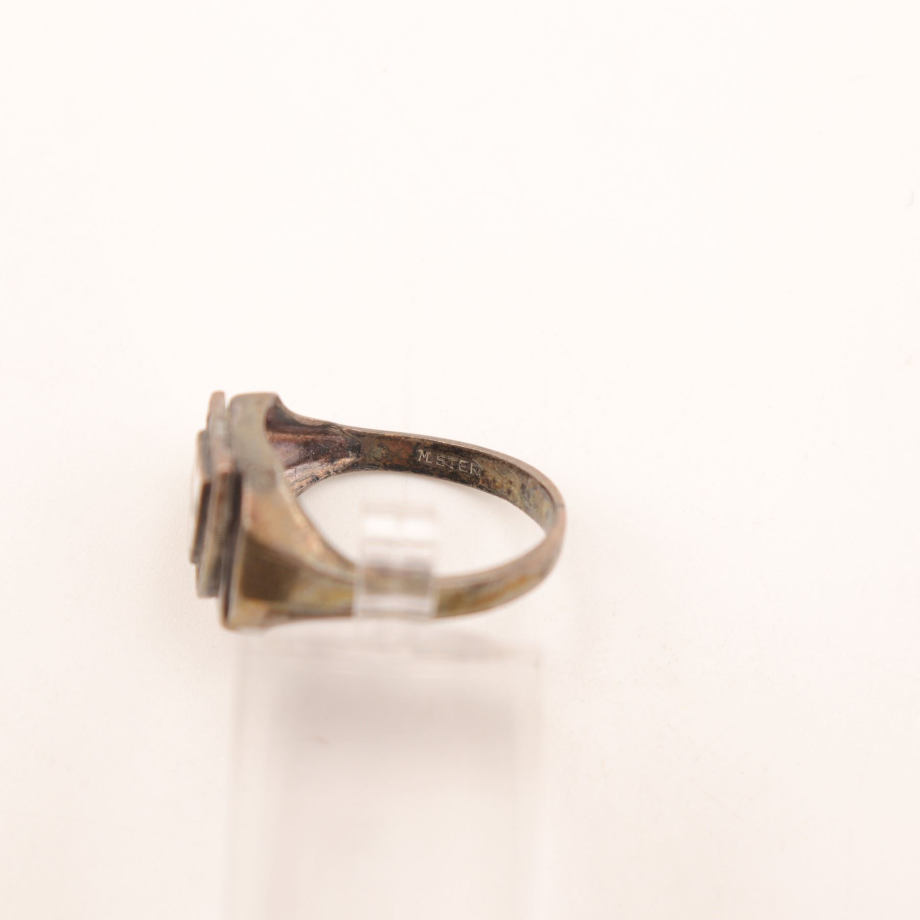 Likely 20th century. Warm-toned silver-colored metal with visible patina, oxidation, and surface wear throughout, consistent with age and use. The shield device remains legible and visually strong. Because the stamp reads M. STER rather than a full sterling fineness mark