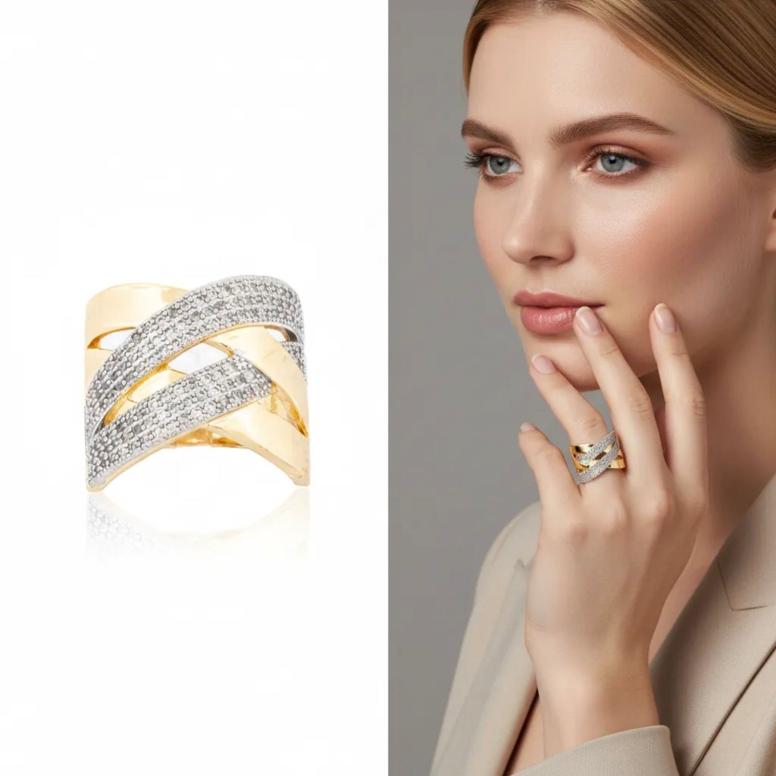 A striking wide-band crossover ring crafted in 18kt gold layered (oro laminado). The design features alternating polished gold ribbons and two pavŽ-textured silver-tone bands, creating a sculptural interlaced motif. Contemporary in aesthetic, the ring is finished to a high polish and displays excellent surface condition consistent with light wear. Size 7 Ð A8294