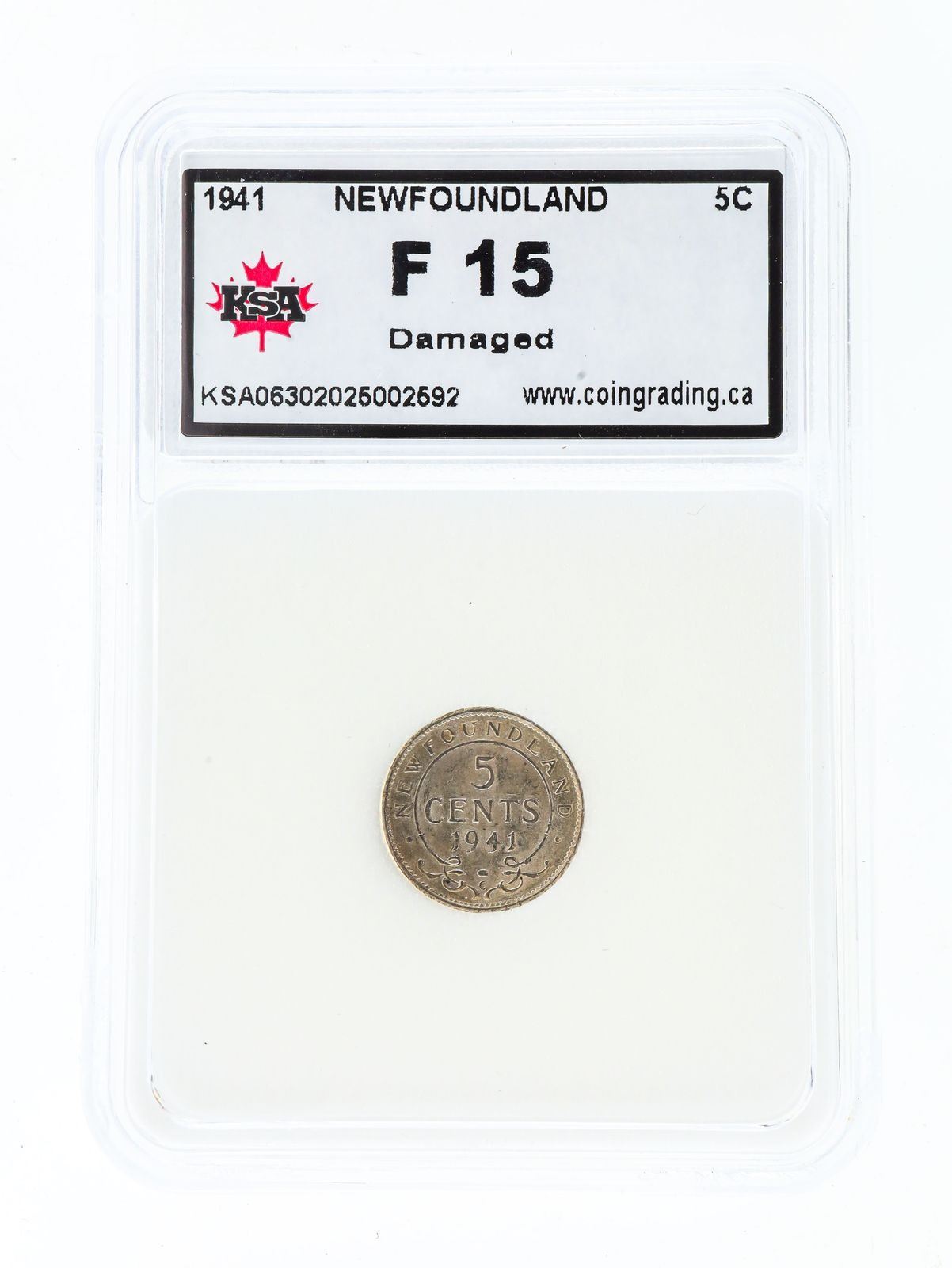 1941 NFLD Silver Five Cents Damaged F15 KSA Slab