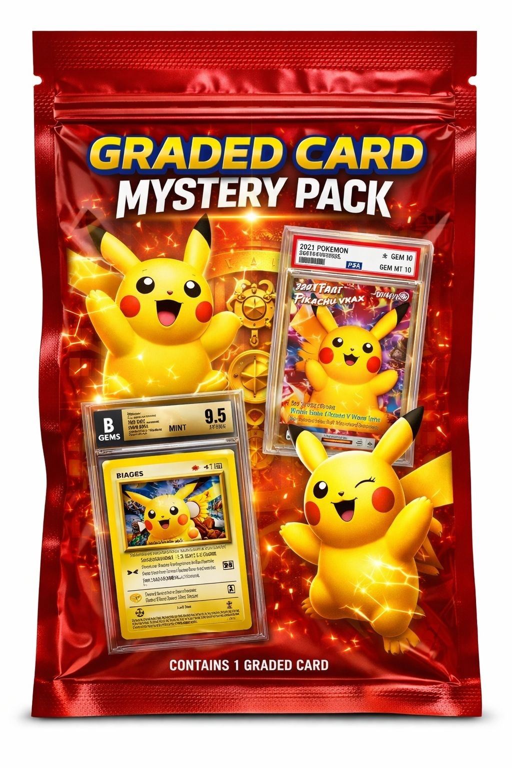 An exciting collectorÕs pack designed for Pokemon trading card enthusiasts. This sealed Red Mylar Graded Mystery Pack features vibrant Pikachu artwork and a vault-style collectible design, capturing the thrill of the hunt for premium graded cards.