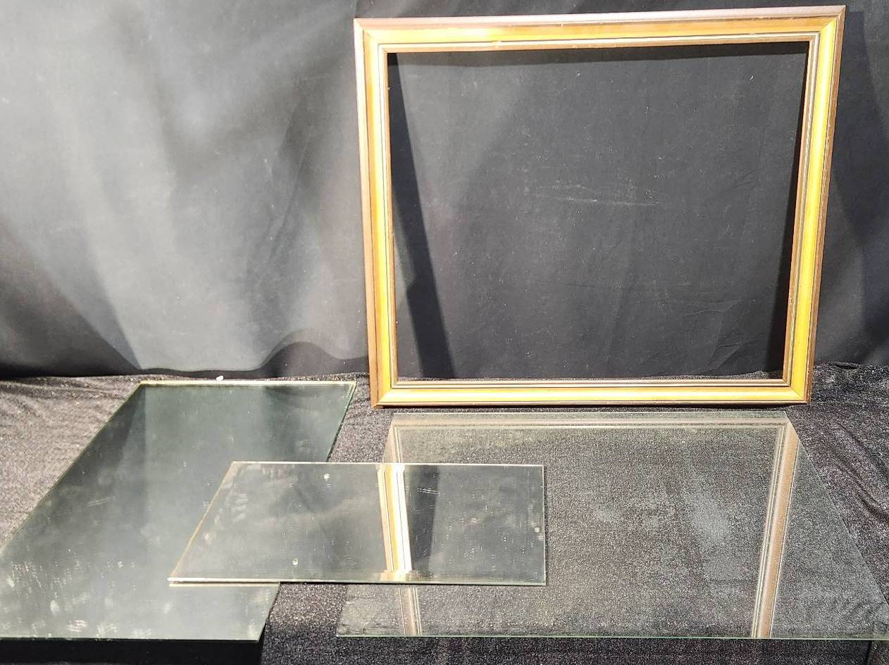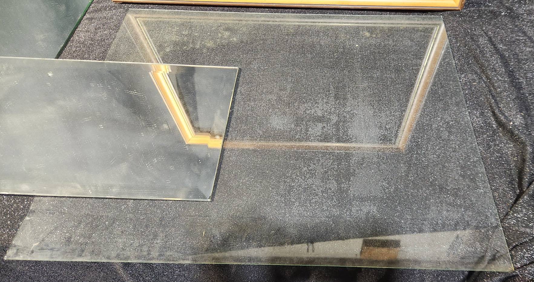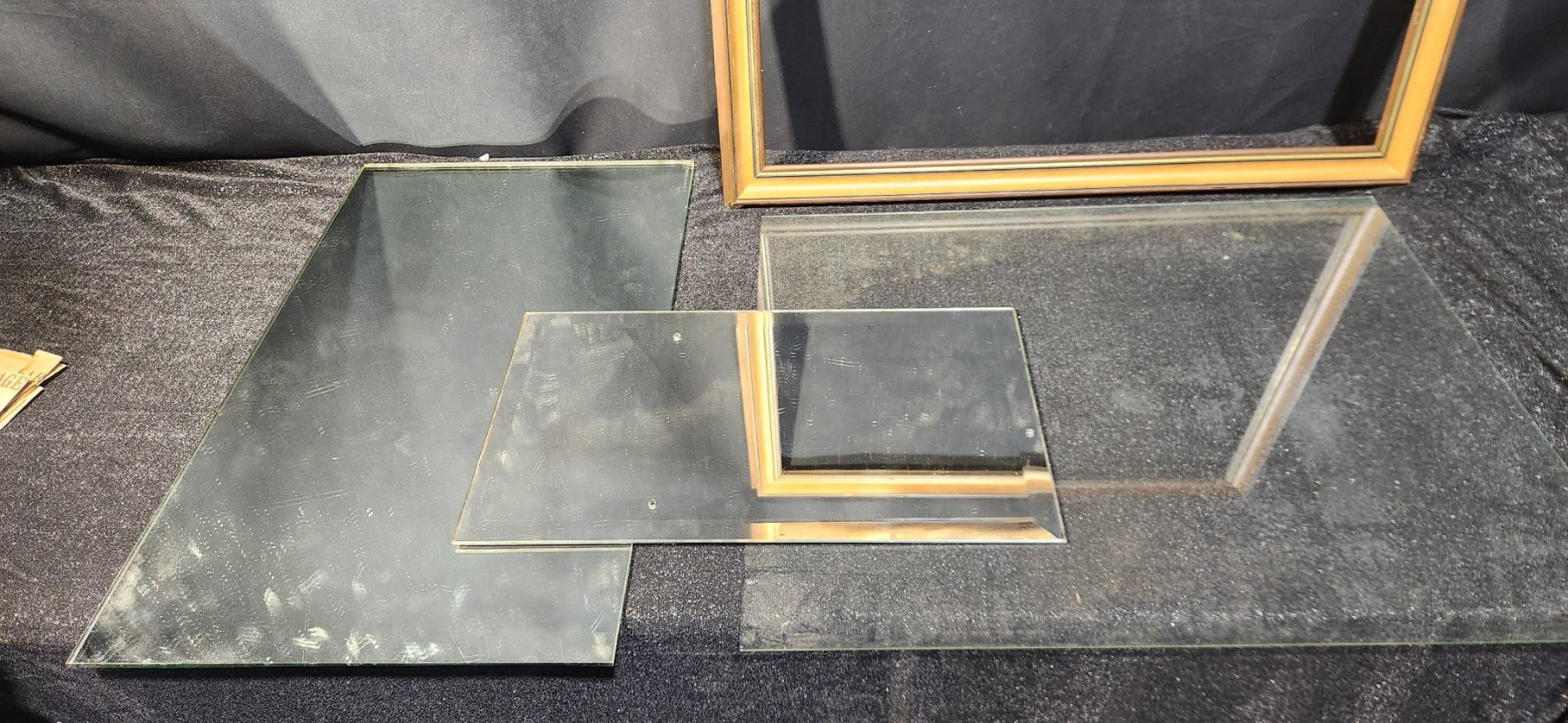 Includes two mirrors measuring 22 x 13 and 18 x 33, as well as a wooden frame with a glass insert. Glass is stored in a carry box.
