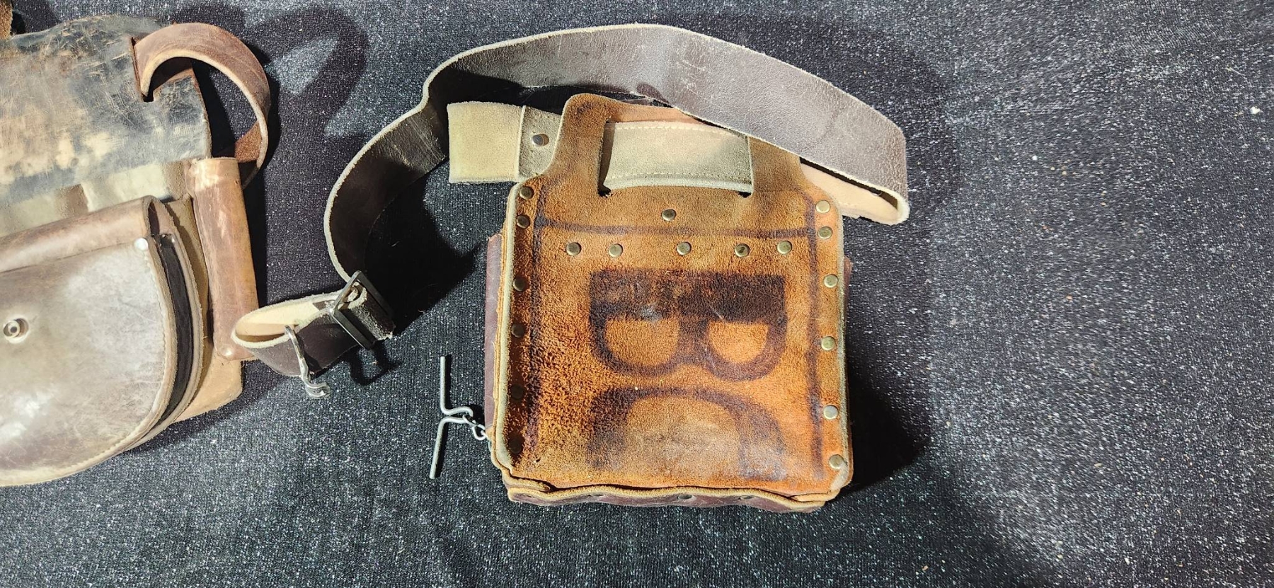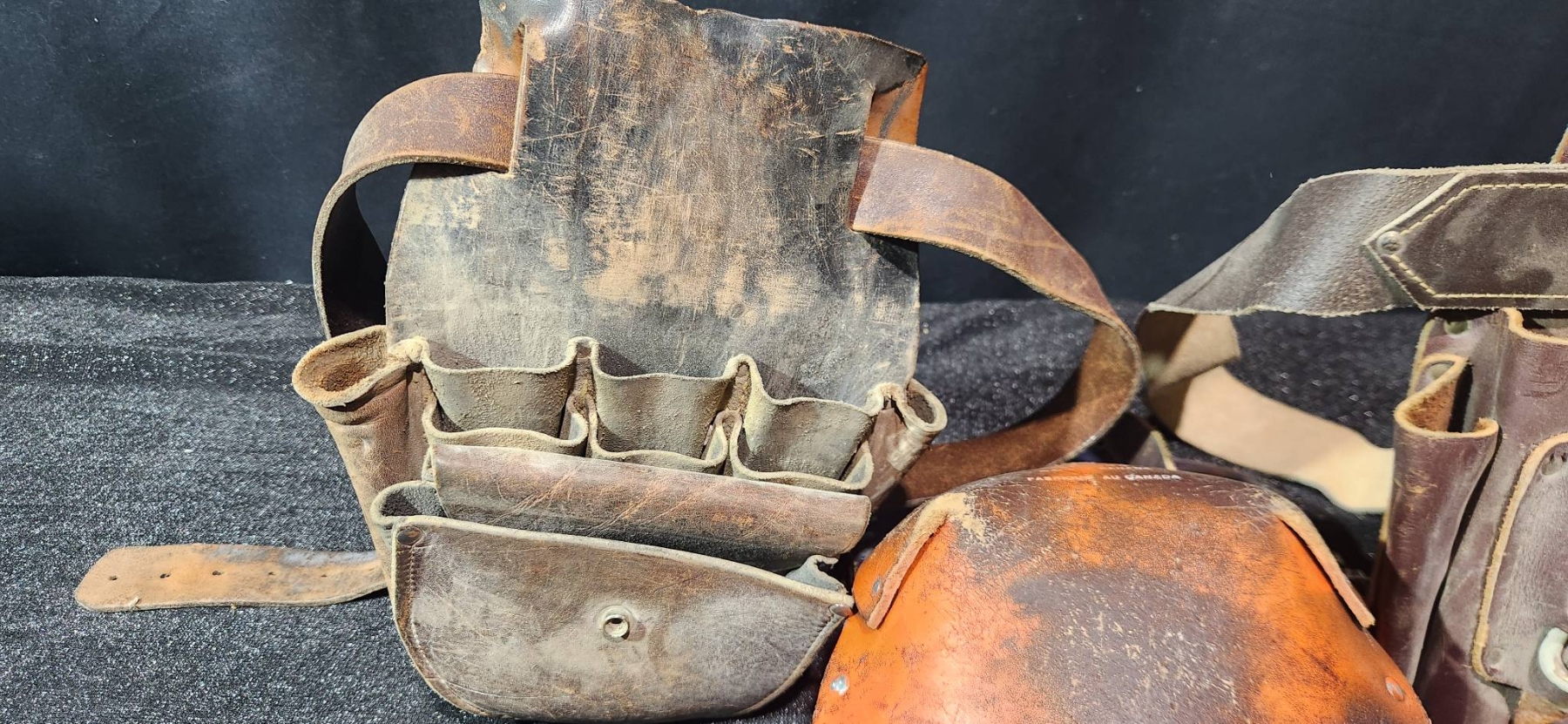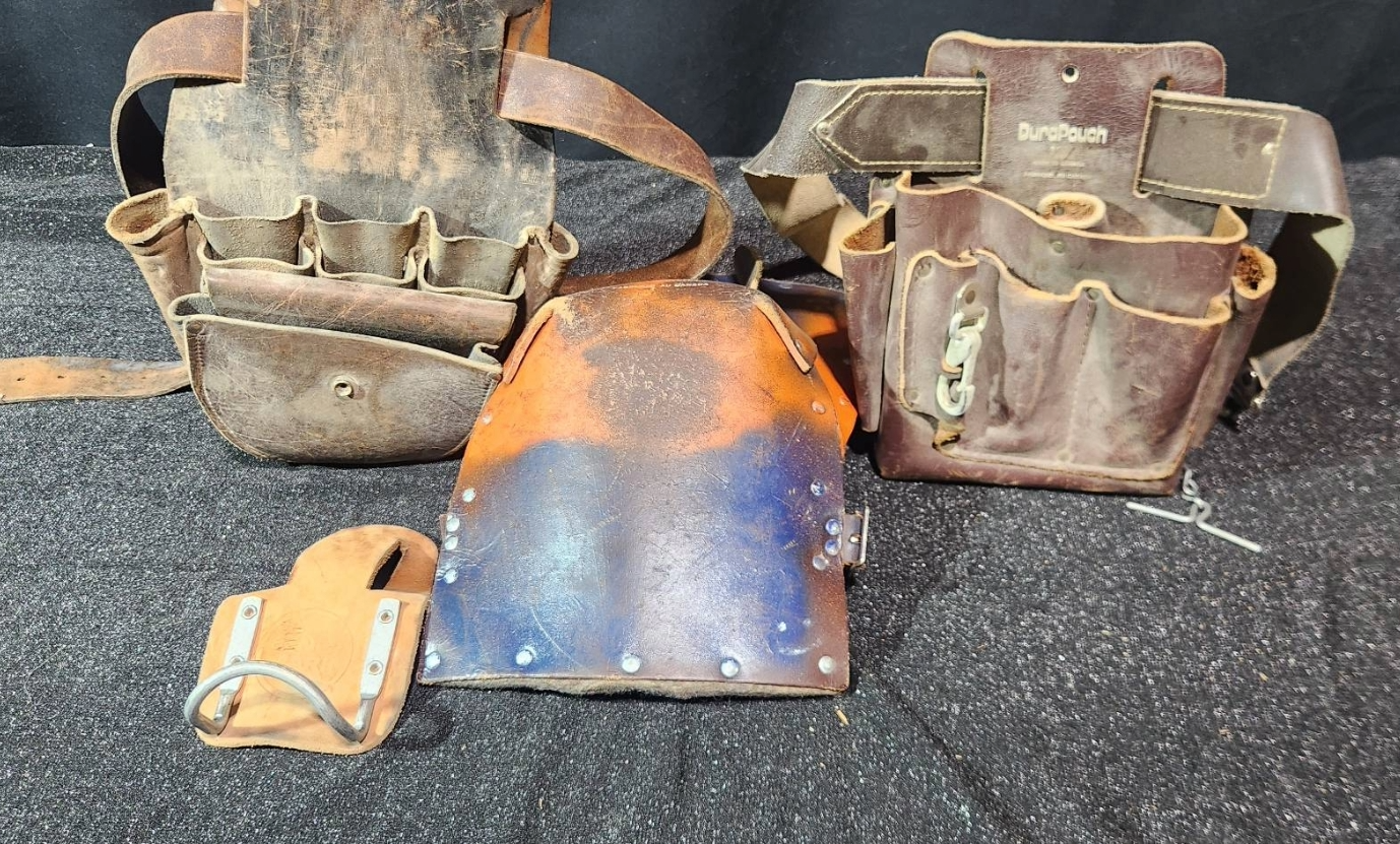 Leather work pouches paired with practical tools, ideal for collectors or those seeking durable accessories for working needs. Includes pieces like tool pouches and knee pads with visible wear, which adds character and hints at their utility. A chance to acquire functional pieces with potential vintage charm, made from quality leather materials.