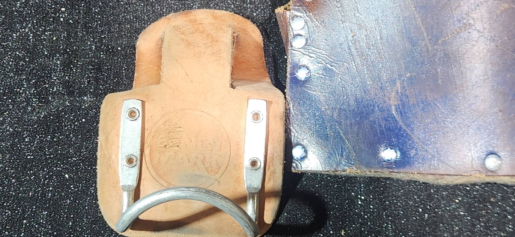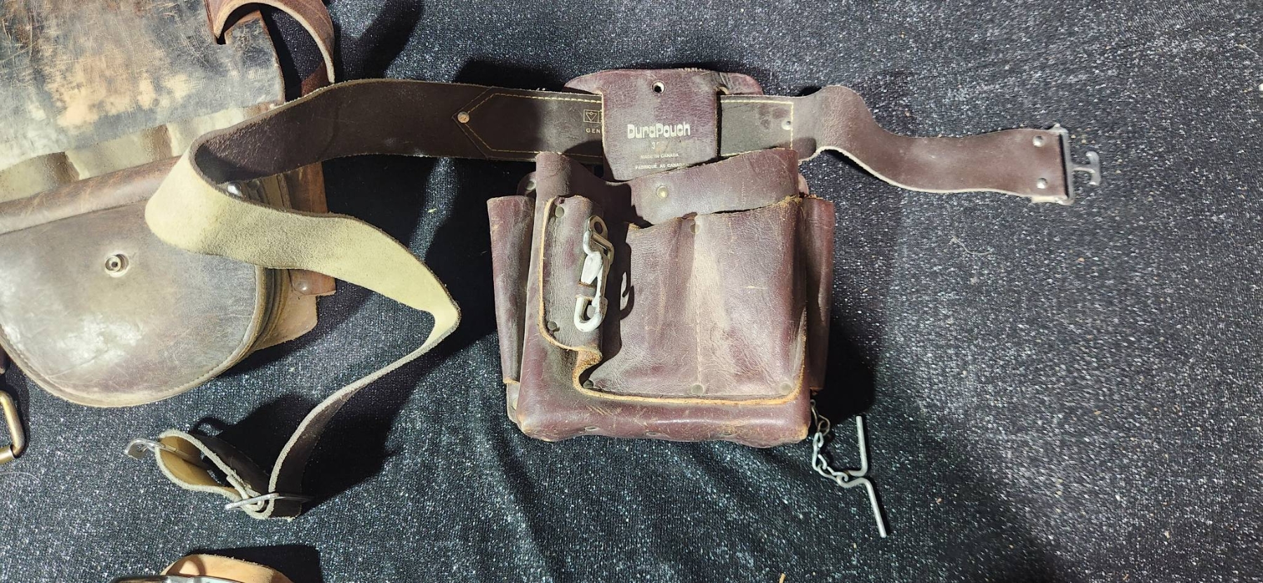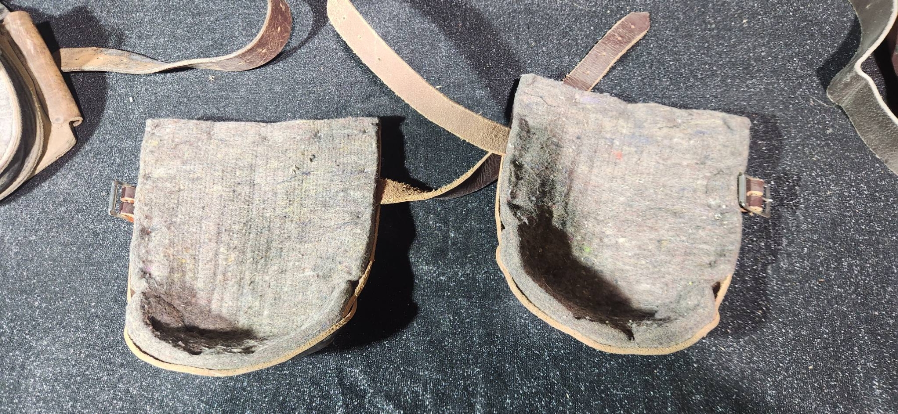 Leather work pouches paired with practical tools, ideal for collectors or those seeking durable accessories for working needs. Includes pieces like tool pouches and knee pads with visible wear, which adds character and hints at their utility. A chance to acquire functional pieces with potential vintage charm, made from quality leather materials.