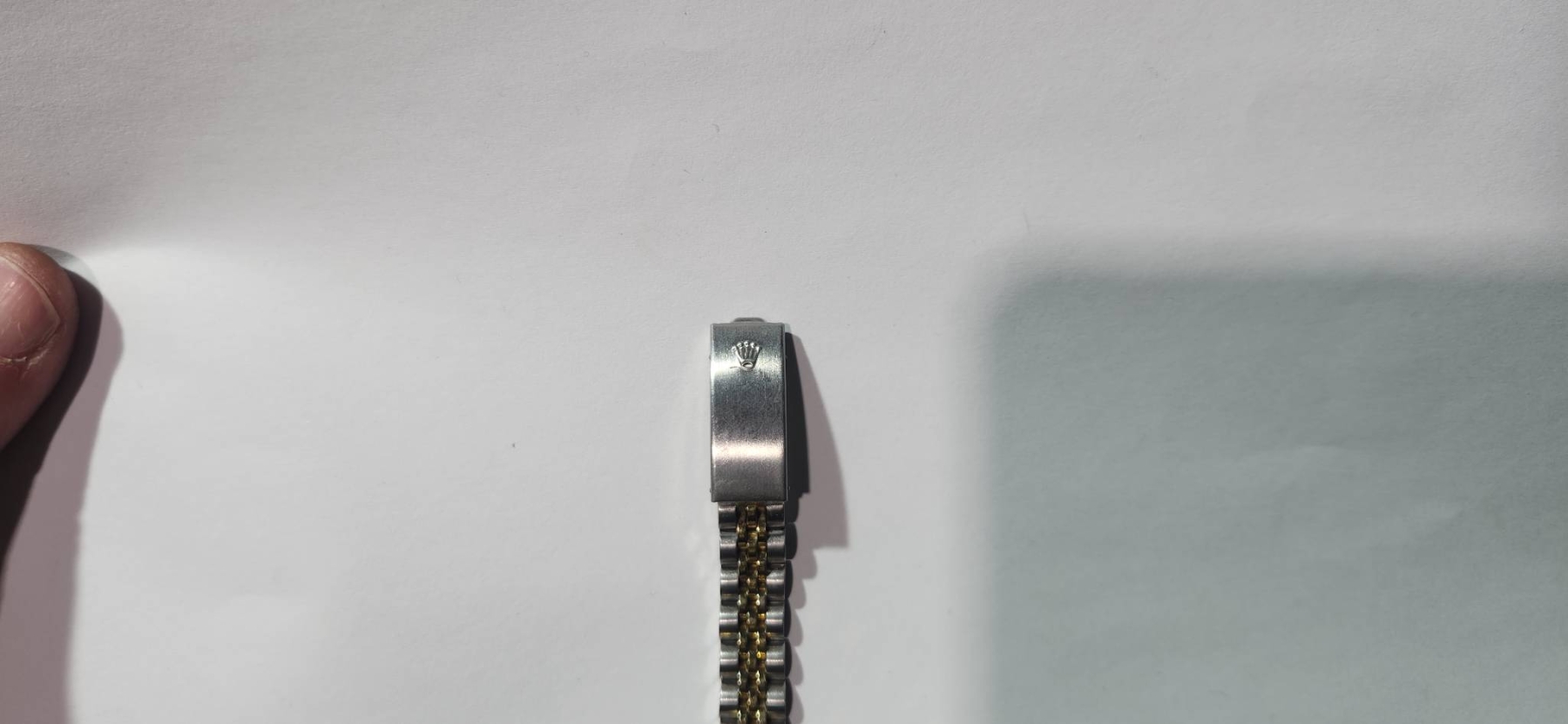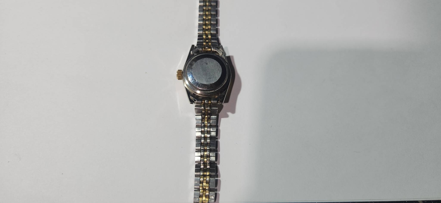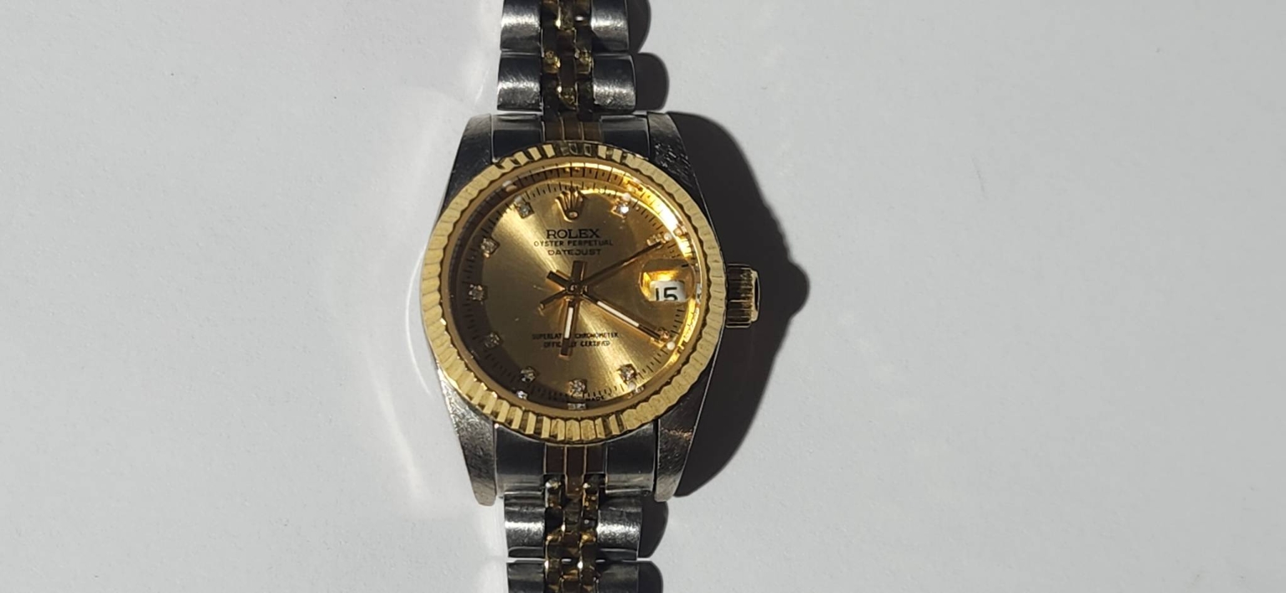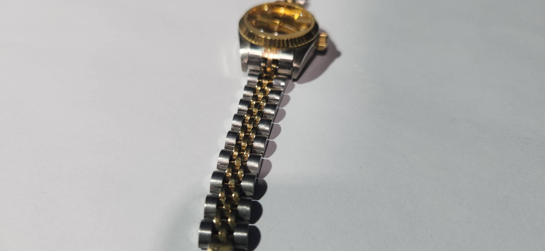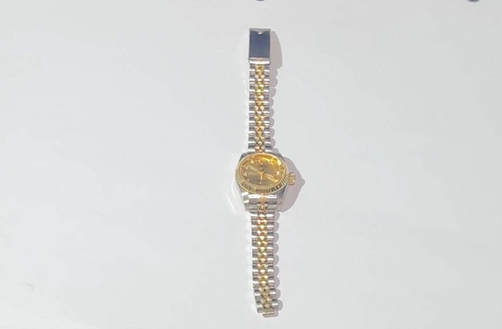 Unverified Rolex watch featuring a gleaming gold dial paired with a classic two-tone bracelet design. The watch requires a minor repair to the arm band, making it a potential value find for collectors or enthusiasts. Perfect for those seeking a stylish timepiece that may align with the iconic Rolex aesthetic.