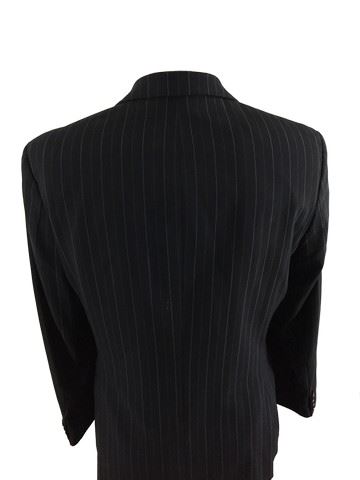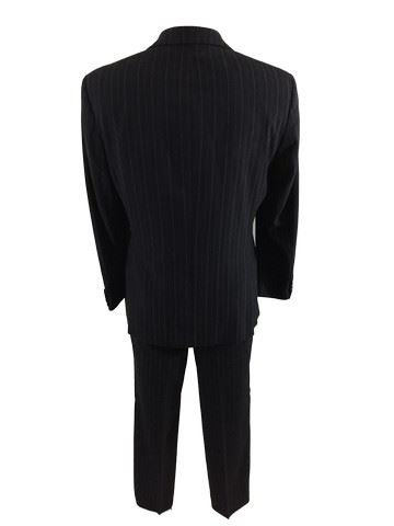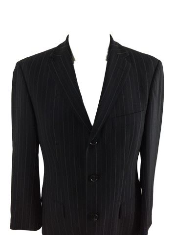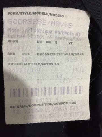 Martin Scorsese suit. Suit is made by Hugo Boss and is black with solid blue and dotted gray pin-stripes. Includes a tag inside which states the material composition and "Scorcese /Movie" printed at the top of the tag. Most likely one of the choices that wasn't used from his cameo in Taxi Driver (1976).