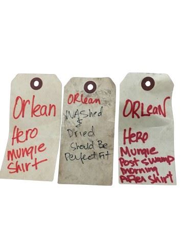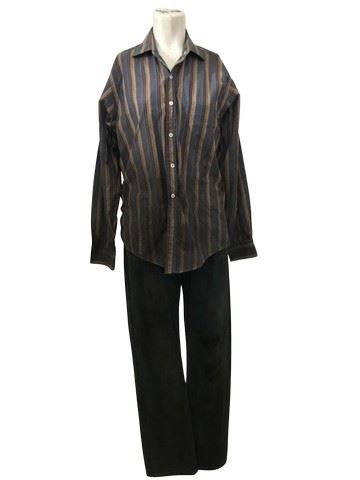 Adaptation. (2002) - Susan Orlean's (Meryl Streep) screen worn post mud scene hero button down multi colored striped dress shirt with a white "Jockey" cropped v neck t shirt (s) and a pair of "Earl Jeans" (31). Inside tag note states: "Orlean, washed & dried for perfect fit.". A wardrobe tag stating the same thing comes with the jeans, as well as two wardrobe tags that accompany the shirt.
