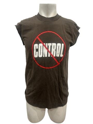 Joe Dirt (2001) - “NO CONTROL" t-shirt from the band Bad Religion. The design is the cover art for their 1989 album No Control. It appears in the film because Joe Dirt, played by David Spade, wears various band t-shirts as part of his "white trash" persona. This was one idea for wardrobe the production team had which relates to the overall punk/rock aesthetic of the character, but did not actually make it on screen. This is a faded black, now grey colored shirt with the sleeves cut off.