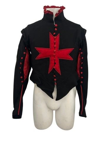 Three Musketeers (2011) - Cardinal Richelieu's Guard screen worn, custom made uniform jacket. Short blazer constructed from black wool, accented with a high contrast red fabric underneath the arms and at the cuffs and collar. A red cross emblem is appliquied onto the front and back.Structured fit, a ruffled collar, button up front but closed with sewn in hooks. High level of detail has gone into creating this jacket on the set of the production to hold up to both on screen scrutiny and the physical demands of action sequences. Includes black leather gloves.