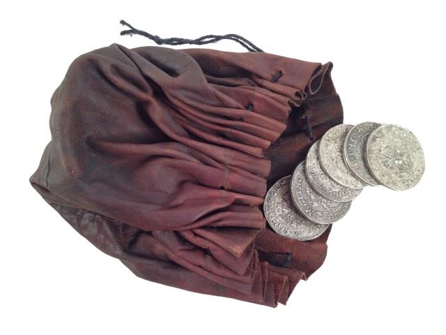 Jan Van Loos (Dane DeHaan) screen used, hero, brown leather drawstring coin purse with six faux silver coins (5" tall).