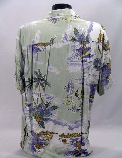 Frankie (Justin Timberlake) SS Sage Hawaiian Print Button Front (size L/ design depicts surfers & palm trees) Turquois & Olive "Mossimo" Board Shorts (size 34/ velcro fly & drawstring waist/ abstract print) (screen worn/ includes costume dept. wardrobe tag)