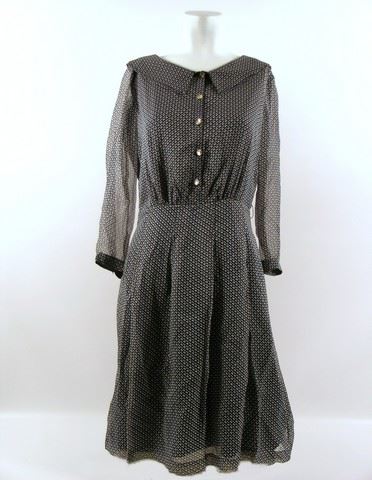 Violet Weston (Meryl Streep) screen worn, hero, navy blue with yellow and white print, self tie belt, 'Antonio Melani' dress with zipper in the back and buttons on the front.