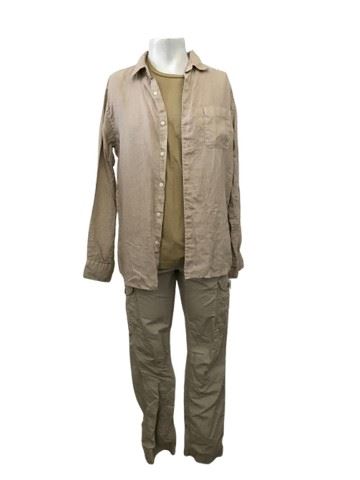 American Assassin - Mitch's S (Dylan O'Brien) stunt double Uniqlo tan linen long sleeve dress shirt with next brand, light army, green, short sleeve T-shirt, size M and a pair of light khaki cargo pants with the back waist custom sized for stunt scenes possibly a harness. Includes studio tag that states the scenes it was used in.