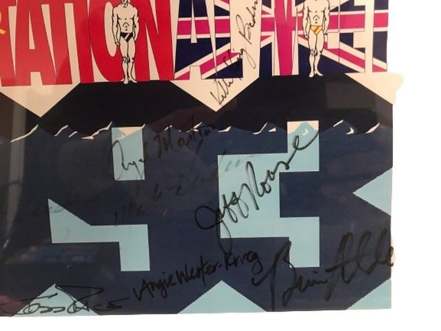 Frame has been professionally framed, and poster is signed by members of the 1992 U.S. Olympic swim team, including Eric Namesnik, Angie Wester-Krieg, Jeffrey Rouse and others.