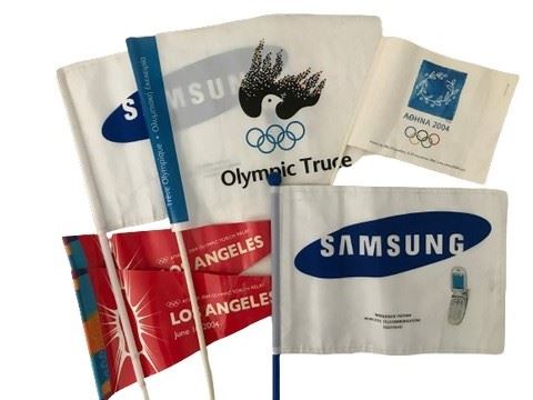 Lot of six 2004 Olympic torch relay Banners. Banners include two Samsung (nylon), one plastic Olympic Truce Banner, and two Coca-Cola paper banners. From the collection of one of the members of the Olympic Organizing Committee who also ran several torch relays.