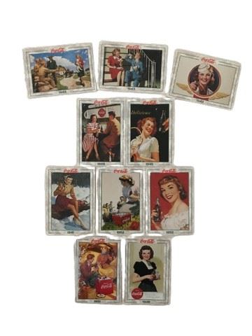 Set of 10 vintage Coca Cola trading cards from 1939-1952. From series 2. Each card has a description of the artword on the front, a Coke fact and a trivia questions. Four of the cards have the backs ripped off. The rest have series information and are numbered. (1994 The Coca Cola Company.)