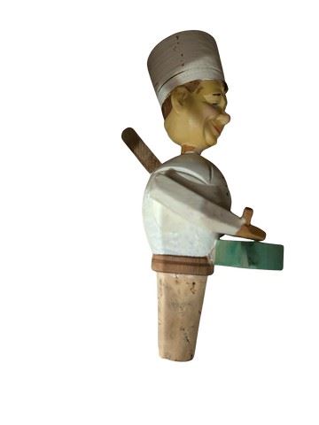A vintage hand carved, hand painted mechanical wooden bottle stopper made in Italy by the company Anri, featuring a chef figurine stirring a bowl. There is a lever on the back, when pulled down, causes the chef's hand with the spoon to move towards his mouth. The figure is made of hand carved wood, and the stopper is made of cork. Anri bottle stoppers are often dated to the 1940s-1960s. Designed to fit a standard wine bottle.