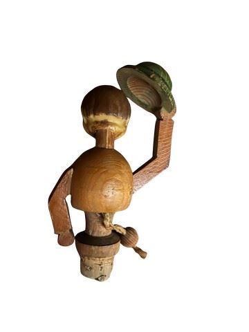 Vintage, hand carved Anri mechanical wine bottle stopper. Made of hand carved and painted wood. This depicts a man who tips his hat when a string on the back is pulled down. Made in Italy by the renowned Anri wood carvers dated to the 1940's-1960s. Designed to fit a standard wine bottle.