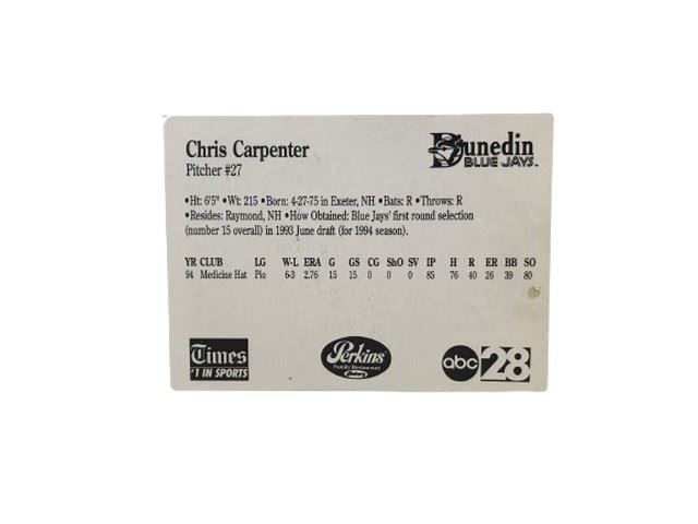 Chris Carpenter Blue Jays Dunedin autographed baseball card. Card is hand signed in blue ink on the front and reverse features player stats.