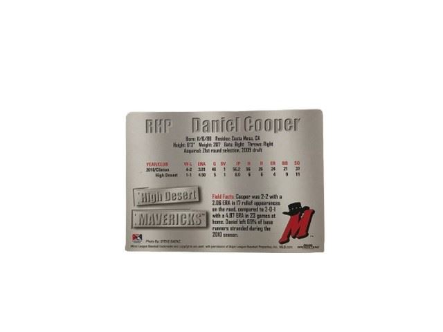 2011 Daniel Cooper High Desert Mavericks Minor League Baseball autographed baseball card by Grandstand with player stats on reverse and photograph by Steve Saenz. Hand signed.