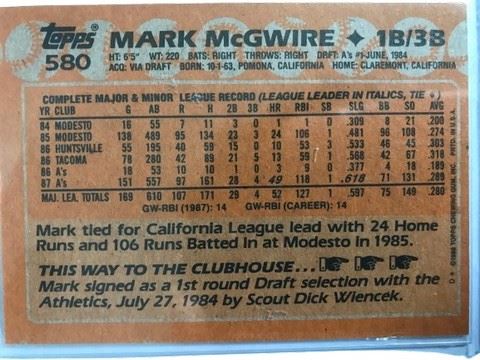 1998 Topps All-Star Mark McGwire Oakland A's rookie green line bat error #580 trading card.